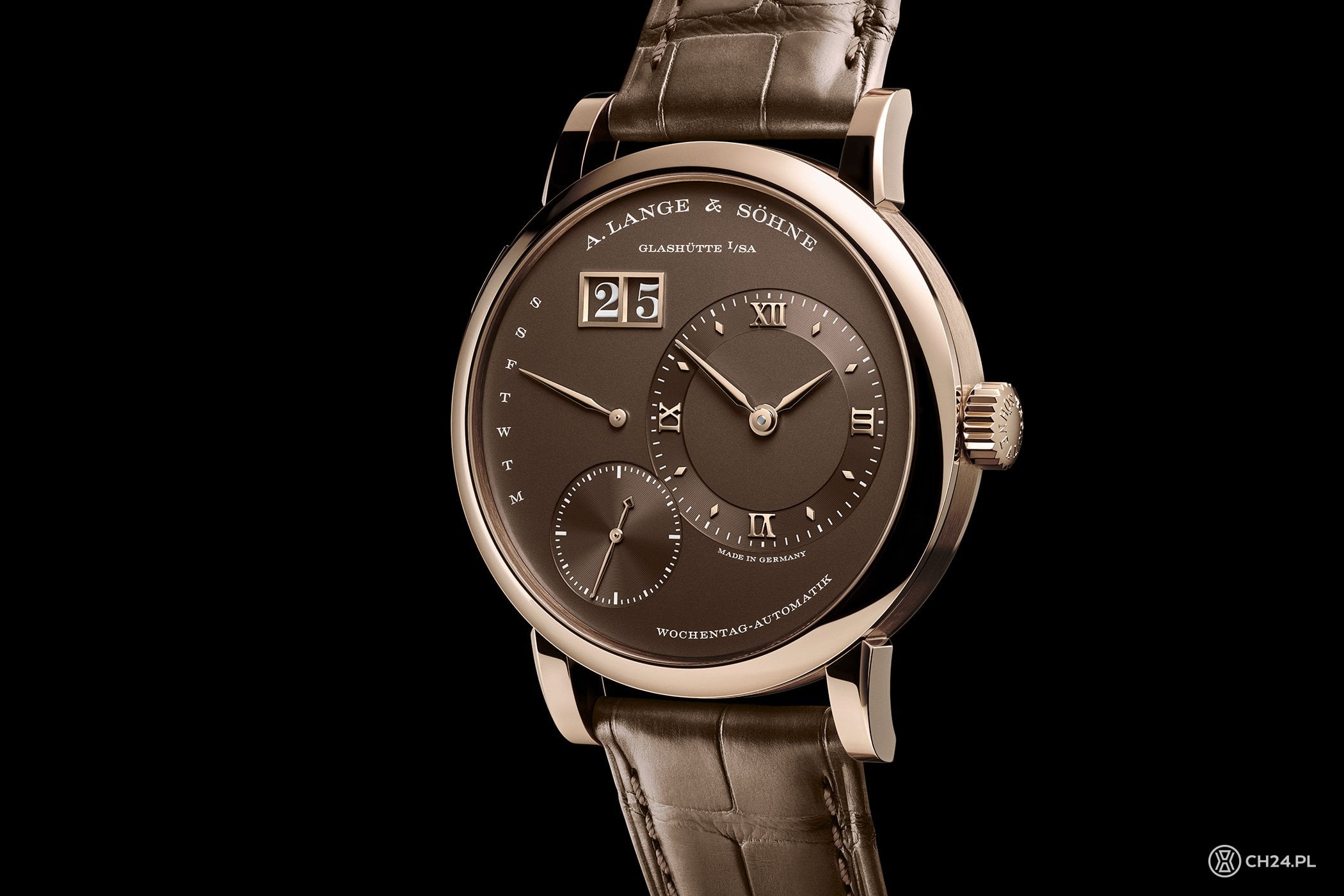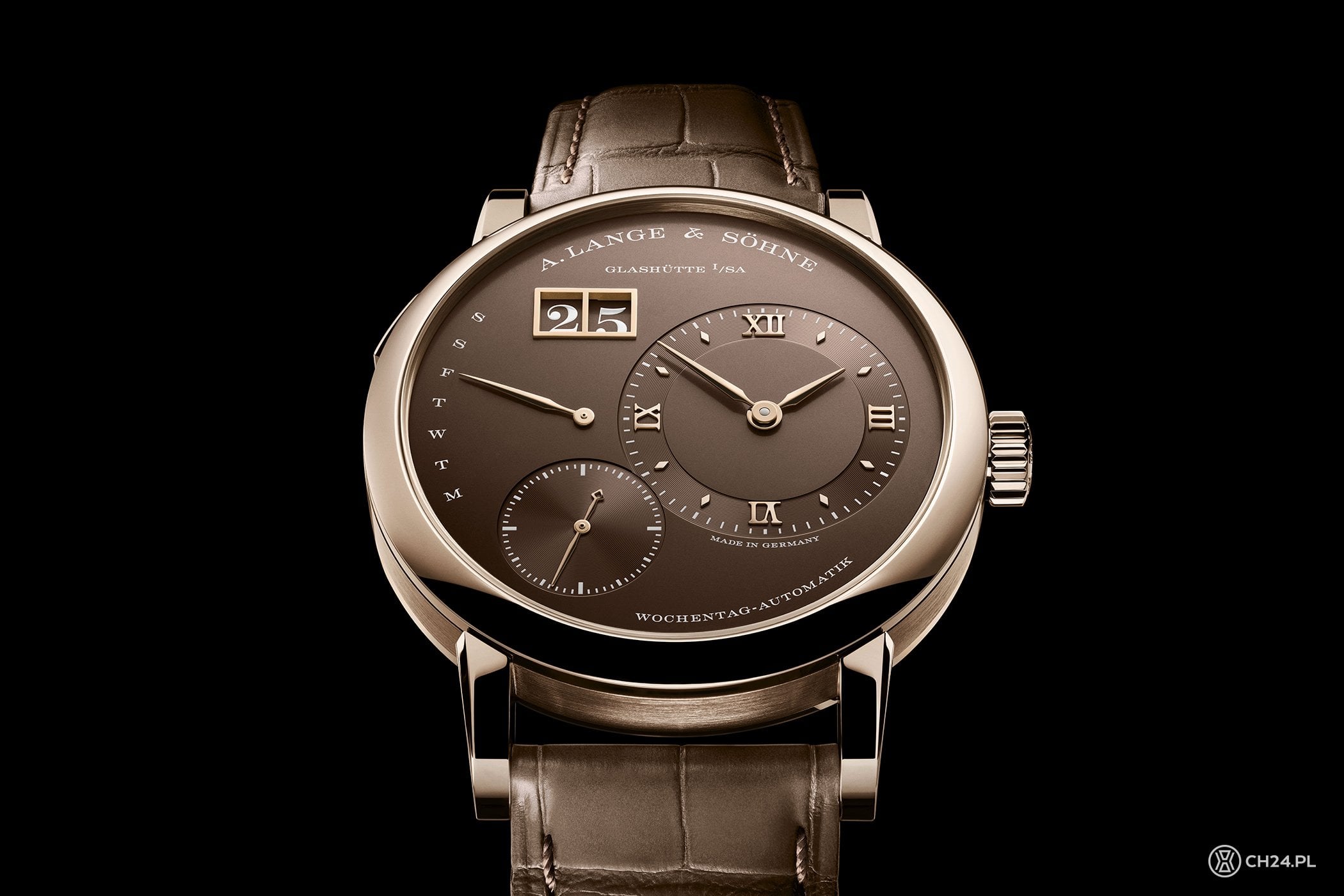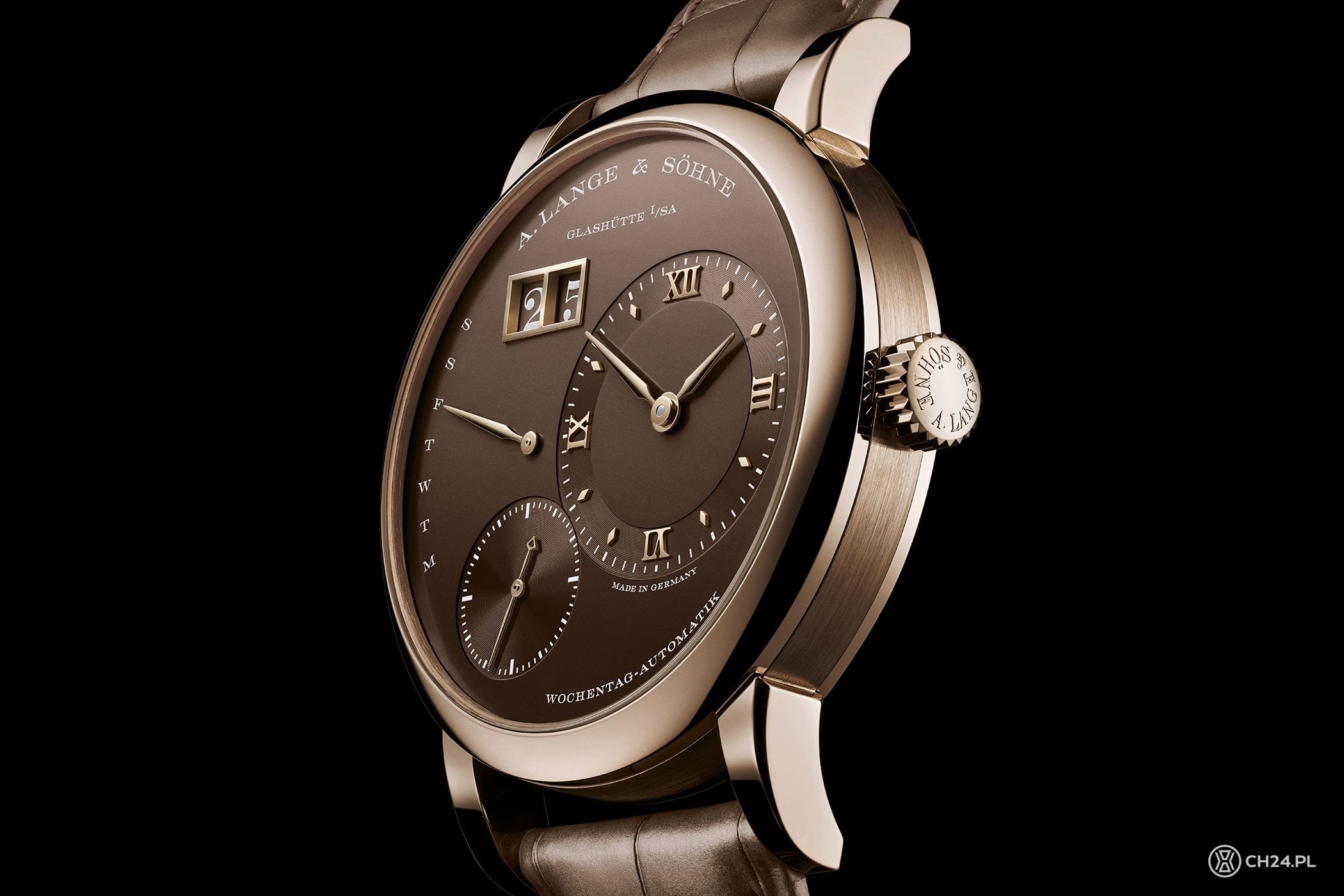 Do miodowego odcienia złota Lange dobrało jasny, czekoladowy brąz cyferblatu oraz zamocowany w uszach pasek ze skóry aligatora. Tarcza ma pasujące aplikacje ze złota, zaaplikowane na matową, chropowato wykończoną powierzchnię. Po prawej prominentne miejsce kompozycji zajmuje wskazanie czasu, z małą sekundą przesuniętą na wysokość godz. 7. Pierścień tarczy godzin i minut oraz tarczkę sekundnika dodatkowo ozdobiono subtelnym szlifem ślimakowym. Miejsce po lewej stronie zajmuje wskazanie dni tygodnia z powracającą wskazówką, zaś zaraz nad nią umiejscowione jest podwójne okienko dużego datownika – otoczone złotą ramką i zaopatrzone w dyski kolorystycznie pasujące do całości.