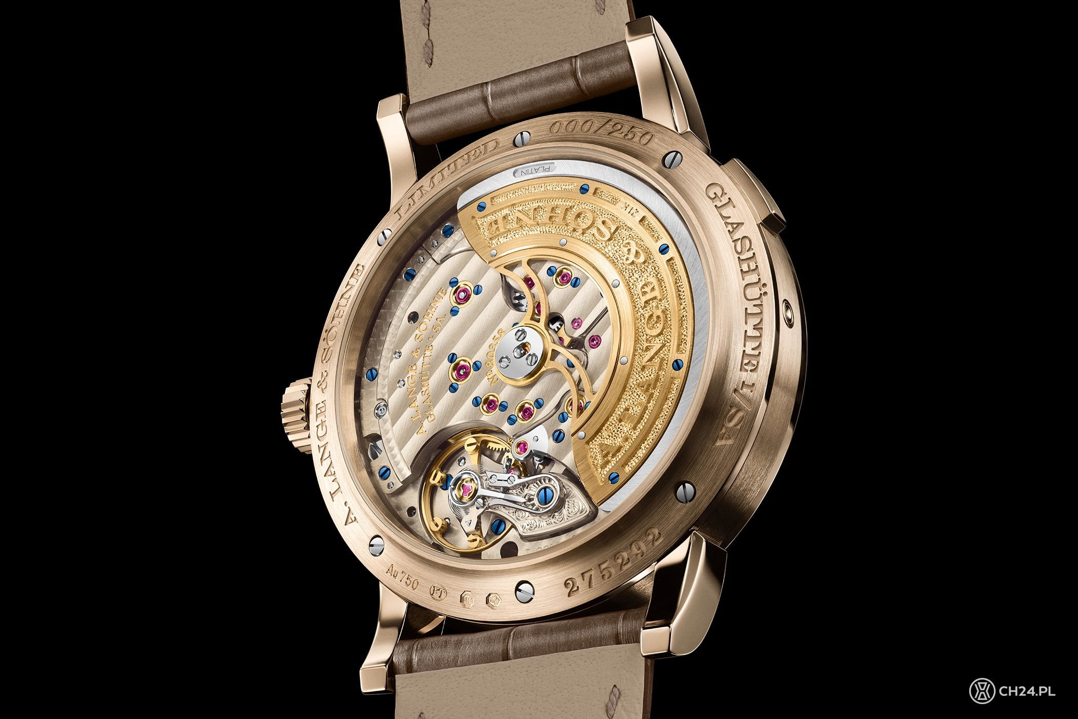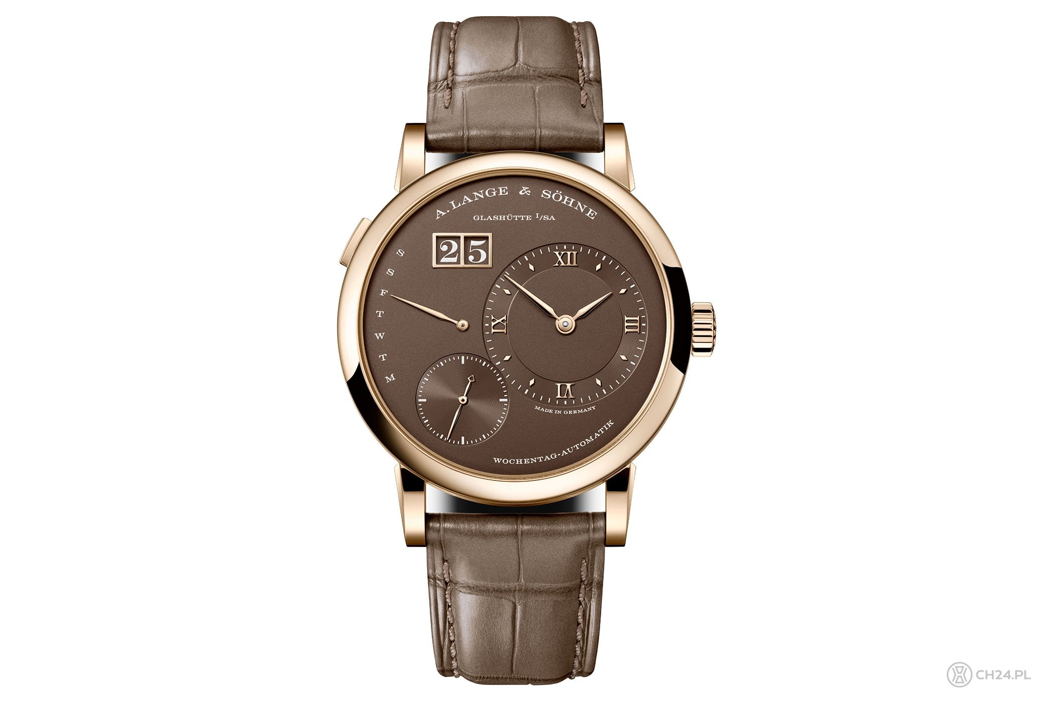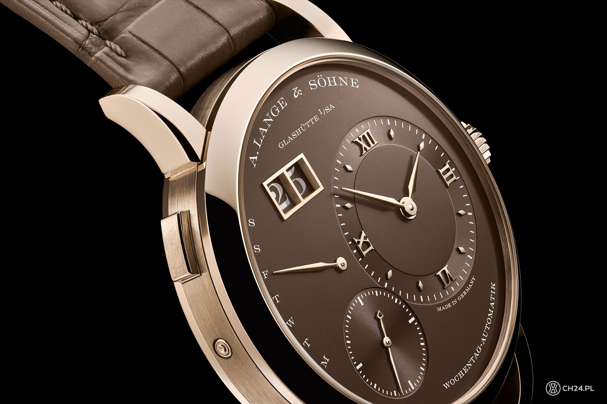 Do miodowego odcienia złota Lange dobrało jasny, czekoladowy brąz cyferblatu oraz zamocowany w uszach pasek ze skóry aligatora. Tarcza ma pasujące aplikacje ze złota, zaaplikowane na matową, chropowato wykończoną powierzchnię. Po prawej prominentne miejsce kompozycji zajmuje wskazanie czasu, z małą sekundą przesuniętą na wysokość godz. 7. Pierścień tarczy godzin i minut oraz tarczkę sekundnika dodatkowo ozdobiono subtelnym szlifem ślimakowym. Miejsce po lewej stronie zajmuje wskazanie dni tygodnia z powracającą wskazówką, zaś zaraz nad nią umiejscowione jest podwójne okienko dużego datownika – otoczone złotą ramką i zaopatrzone w dyski kolorystycznie pasujące do całości.