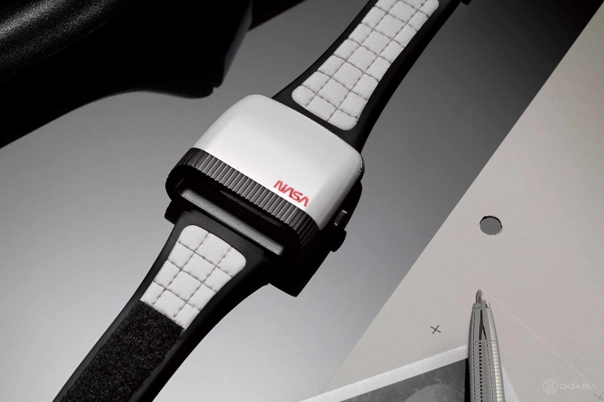 Pokryta białą, ceramiczną powłoką koperta o aerodynamicznym kształcie, pionowa „tarcza” z cyfrowymi wskazaniami czasu plus biało-czarny pasek – oto Amida Digitrend NASA Edition.