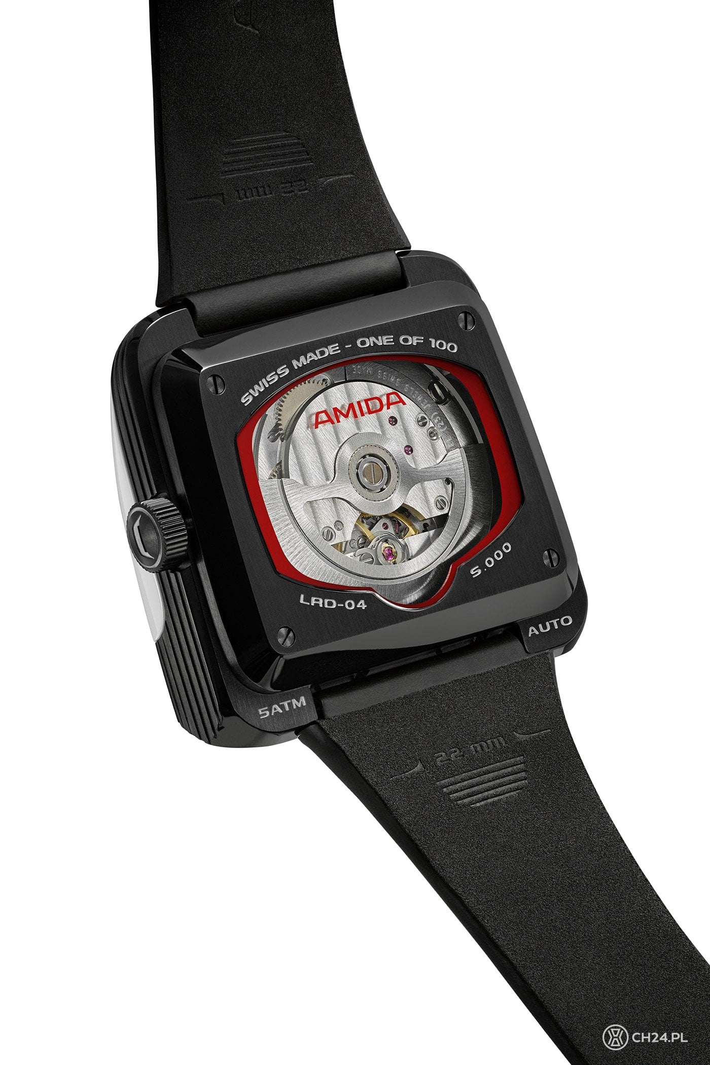 Dodatkową ozdobą jest otaczający ją i pokryty czarną powłoką DLC, stalowy pierścień z wygrawerowanymi poziomymi liniami. W tym samym kolorze jest oryginalna, pionowa „tarcza” z otoczonymi czerwoną ramką, dwoma oknami, w których widać, zaznaczone na biało, cyfrowe wskazania skaczącej godziny i umieszczone na dysku wskazania minut. Między nim znajduje się jasne logo marki Amida.