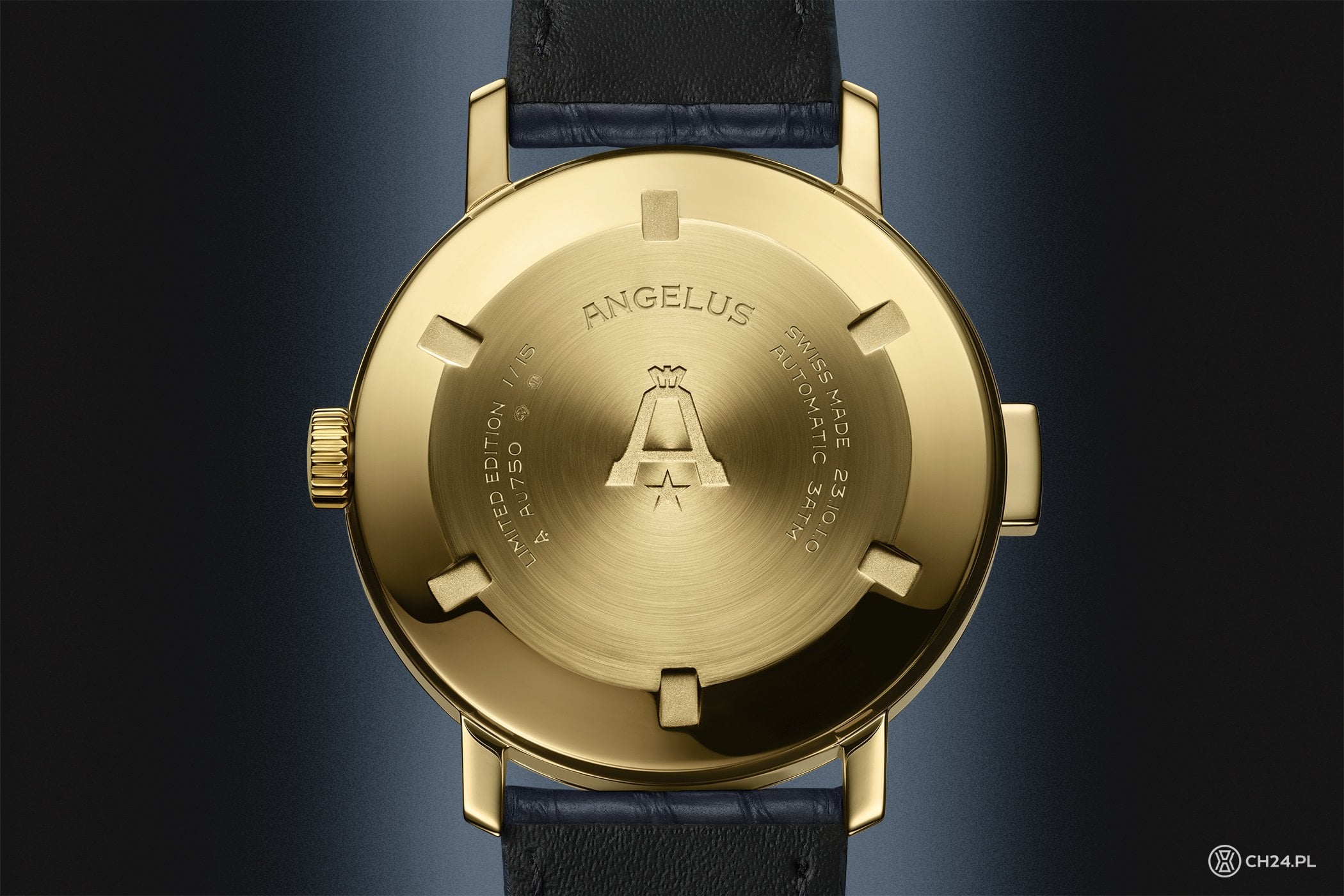 Kwadransowa repetycja została też w symboliczny sposób zaakcentowana na lekko wypukłej, białej tarczy: złote, modernistyczne indeksy godzinowe dla godz. 3., 6. i 9. mają kształt wykrzykników (pozostałe są w formie fasetowanych strzałek, a godz. 12. jest zaznaczona arabską cyfrą). Podobny styl mają też ostre, fasetowane wskazówki godzinowa i minutowa oraz wąska wskazówka centralnego sekundnika. Za wszystkie wskazania odpowiada nowy kaliber Angelus A600 z automatycznym naciągiem, który pracuje z częstotliwością 4 Hz i ma 70-godzinną rezerwę chodu.