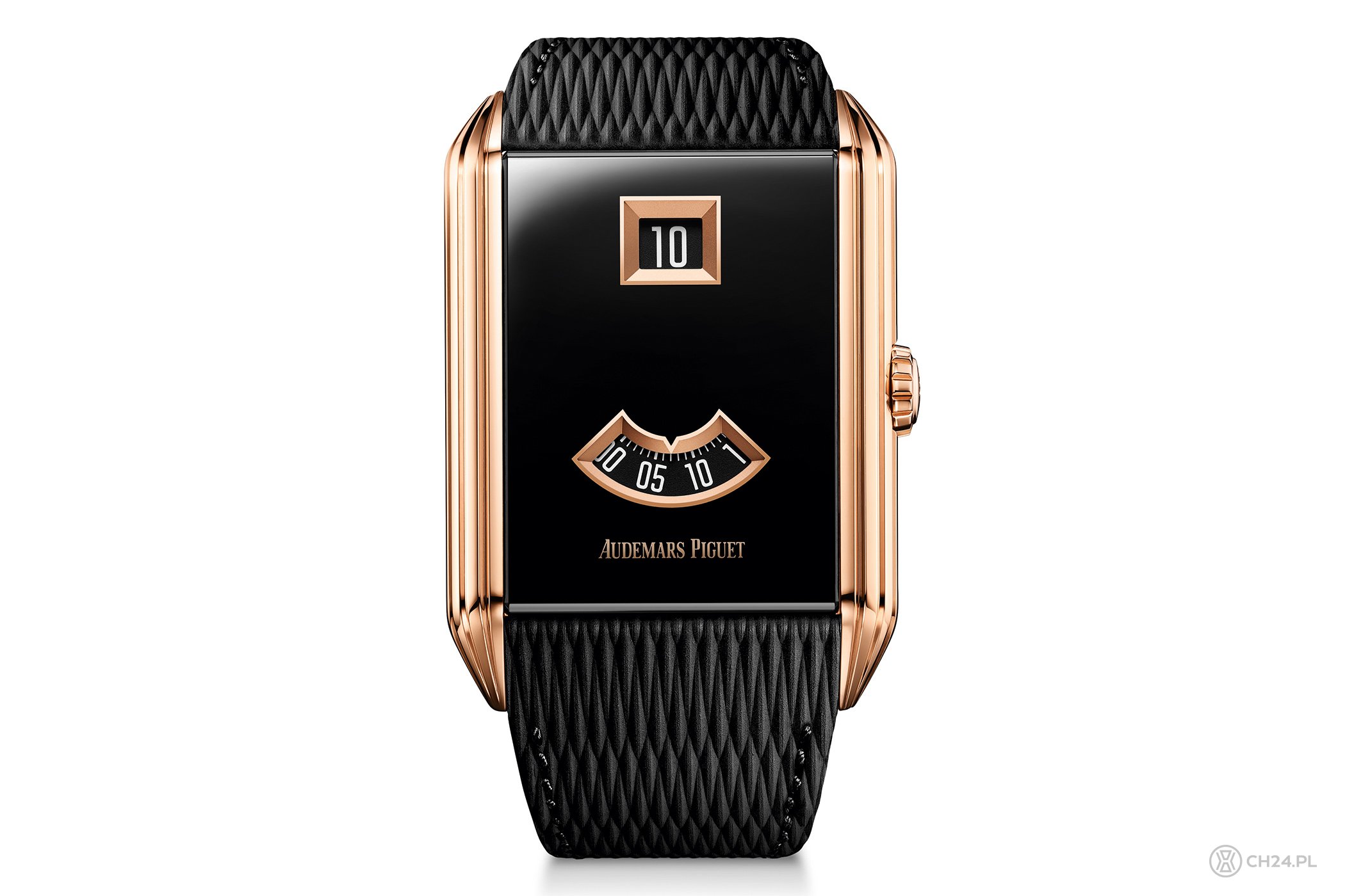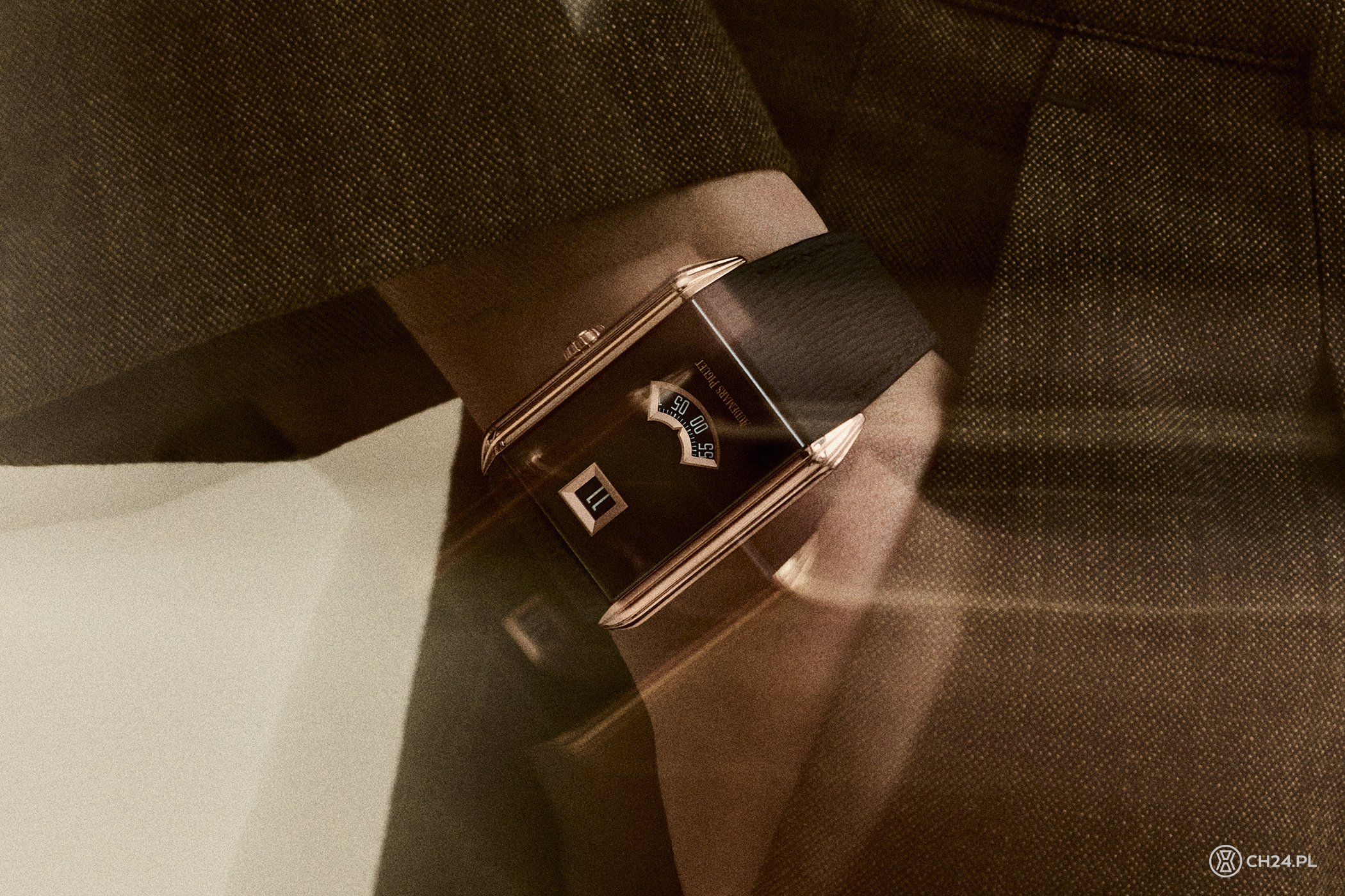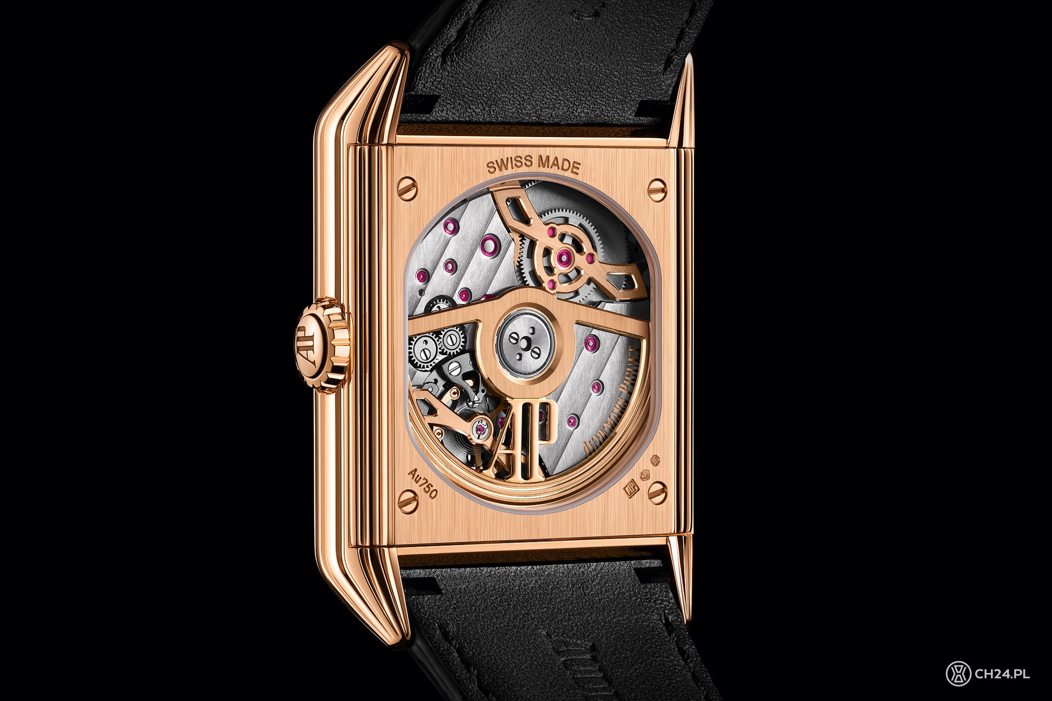 W nowej wersji zegarek prezentuje prostokątną kopertę z geometrycznymi liniami, nawiązującymi do stylistyki Art Deco, a konkretnie stylu Streamline, modernistycznego podejścia do projektowania o minimalistycznych, płynnych formach. Wykonana z różowego złota koperta mierzy 34,6 x 34 mm i zrobiona jest z różowego złota. Front zaś stanowi szafirowe szkło z czarną powłoką PVD, które w dolnej i górnej części pozbawione jest złotych ramek, jakby płynnie okalając obudowę. W kontrze do oryginalnego modelu (inspiracji), nowy wygląda modernistycznie, choć z zachowaniem najistotniejszych elementów.