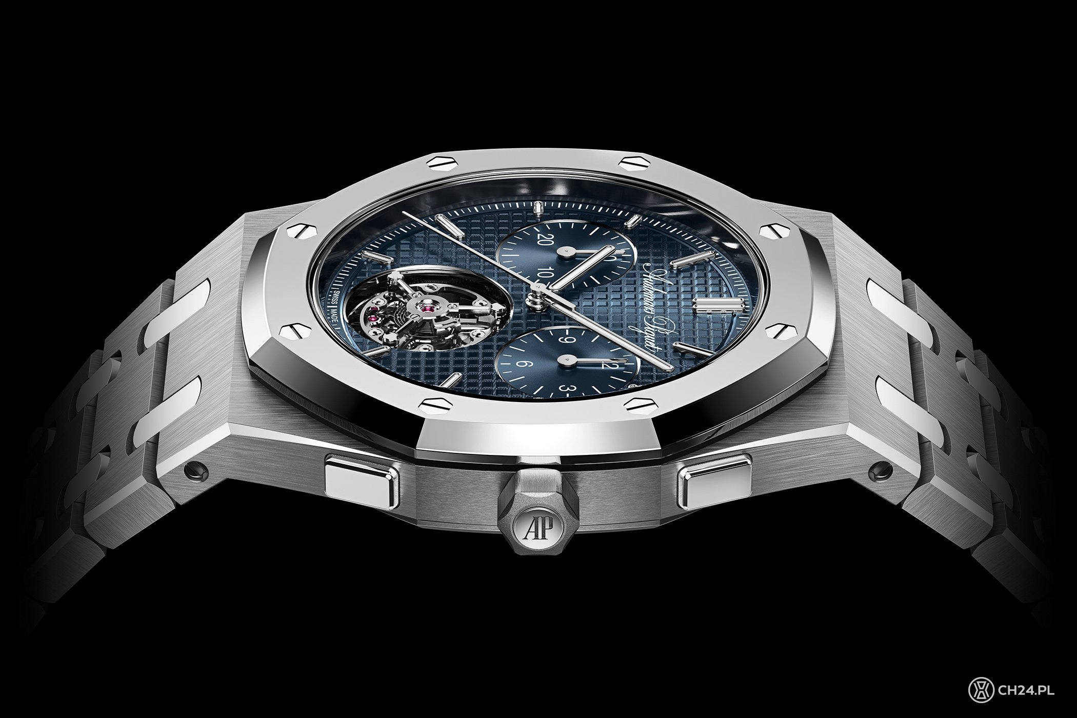 Pod frontowym, szafirowym szkłem AP zamknął najbardziej klasyczny ze swoich cyferblatów – giloszowany motywem „Petite Tapisserie”, pokolorowany na niebieski w odcieniu „Blue Nuit, Nuage 50”. Wskazania stopera rozłożone są na dwie małe, lekko uniesione ku górze tarczki na godz. 3 i 9. Otwór na godz. 6 zajmuje tourbillon. Aplikacje indeksów oraz wskazówki to z kolei białe złoto, a logotyp – pisany kursywą – zaczerpnięto z historycznych modeli manufaktury.