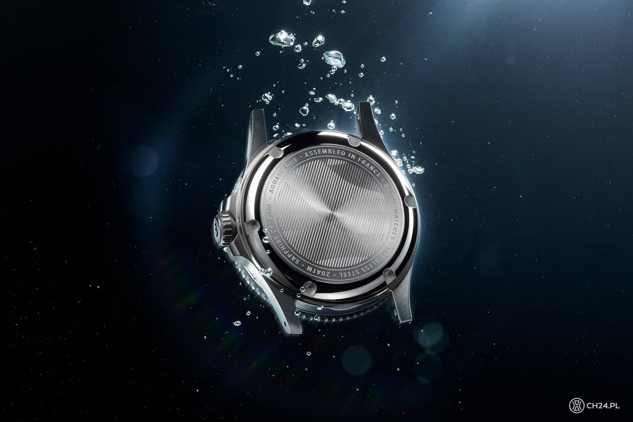 Choć wizualnie nowy Aquascaphe przypomina model zaprezentowany jeszcze w 2018 roku, przeszedł cały szereg istotnych zmian, dotyczących praktycznie każdego elementu. Stalowa koperta ma poprawione proporcje i wykończenie, na czele z pionowym satynowaniem uszu – dalej nawierconych pod teleskopy, jak w zegarkach vintage. Po prawej stronie zamocowana jest sygnowana koronka, osłonięta parą ochronnych wypustek. Od spodu natomiast obudowę zamyka pełny dekiel, udekorowany w środku motywem fal.