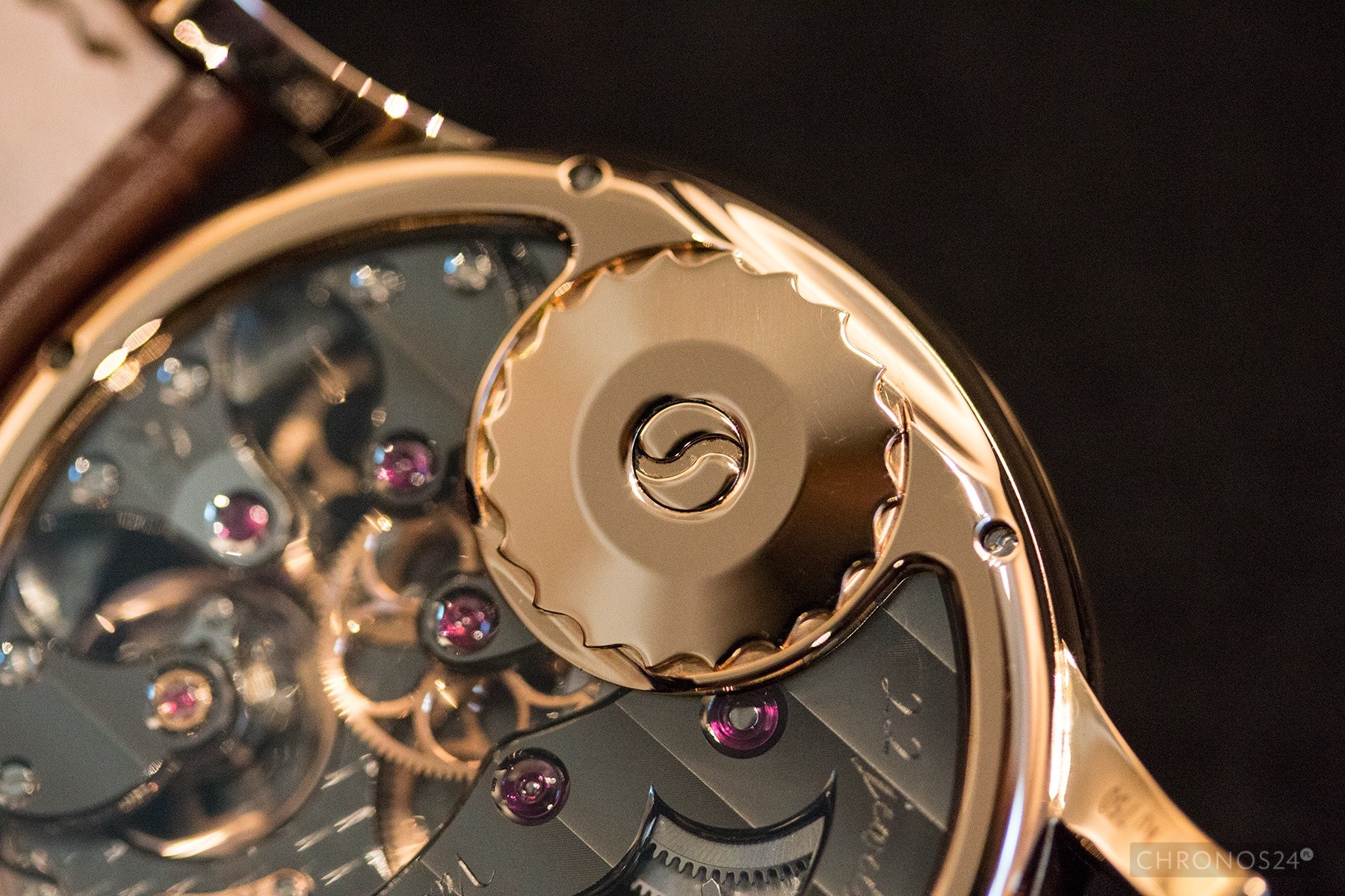 Elementy werku z balansem i miniaturowym, łożyskowanym syntetycznymi rubinami łańcuchem stanowią integralną część wizualnej kompozycji frontu. Wszystkie kalibry Romain Gauthier to manufakturowe konstrukcje własnego projektu. Na stronie marki można przeczytać, ze in-house (w Le Sentier) wytwarzana jest znakomita większość komponentów, jakie trafiają do zegarków.