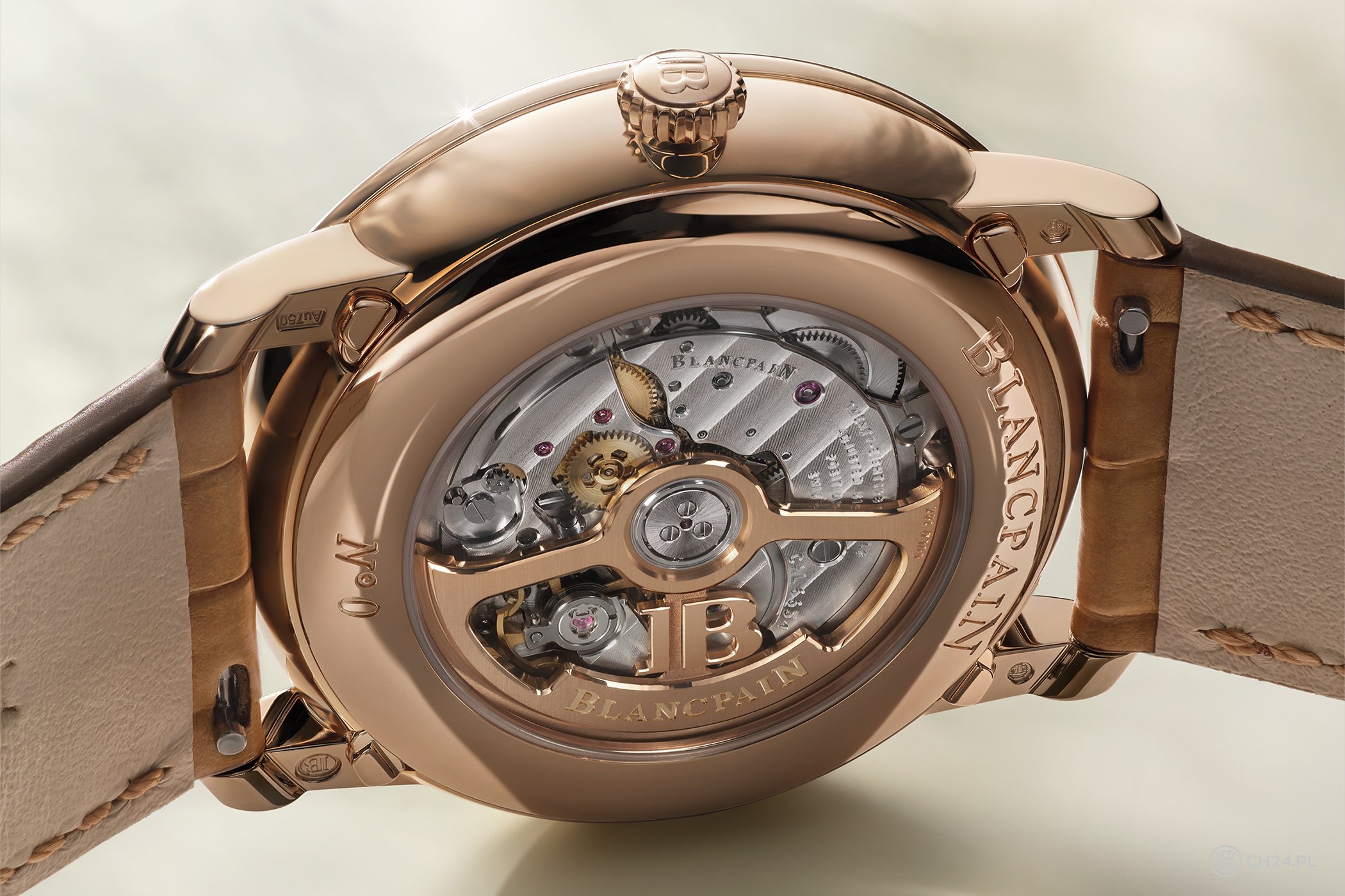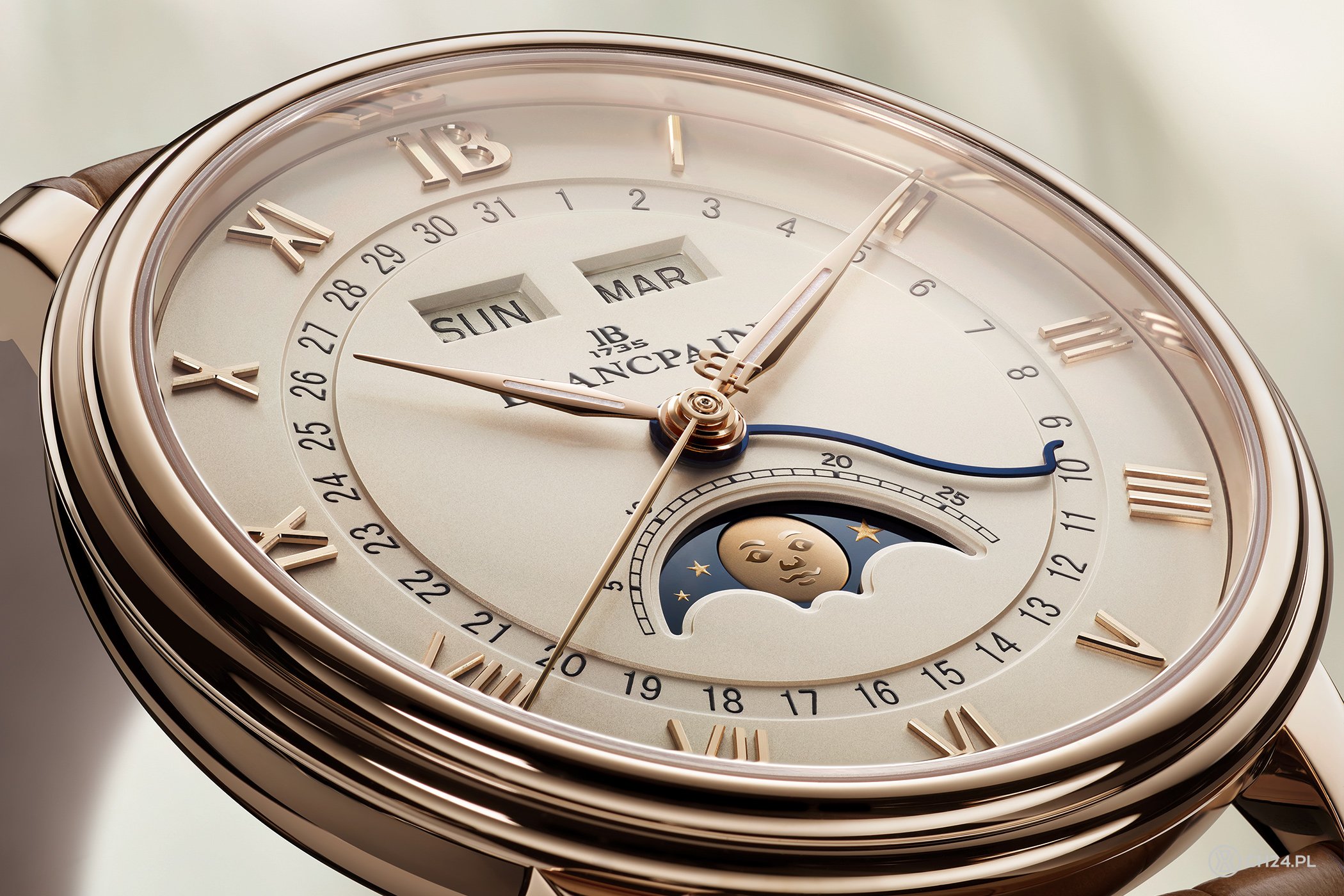 Oto szczegóły: flagowy Villeret Quantième Complete Phases de Lune ma kopertę o średnicy 40,2 mm (wysokość 10,60 mm), zrobioną ze stali lub czerwonego złota, której wygląd został lekko zmodyfikowany (o tym powyżej). Poza estetycznymi zmianami, układ wskazań na tarczy się nie zmienił. Mamy więc, widoczne w dolnej części wskazania faz Księżyca, lekko powiększony datownik, obsługiwany za pomocą wskazówki oraz dwa charakterystyczne okna poniżej godz. 12. (dzień tygodnia i miesiąc). Za wszystkie odpowiada, pracujący pod przezroczystym deklem kaliber 6654.4 z automatycznym naciągiem i 72-godzinną rezerwą chodu. Funkcje kalendarza oraz faz Księżyca obsługiwane są za pomocą korektorów znajdujących się pod uszami (to rozwiązanie Blancpain opatentował w 2005 r.), co ułatwia szybkie ustawienie tych wskazań bez użycia żadnych narzędzi.