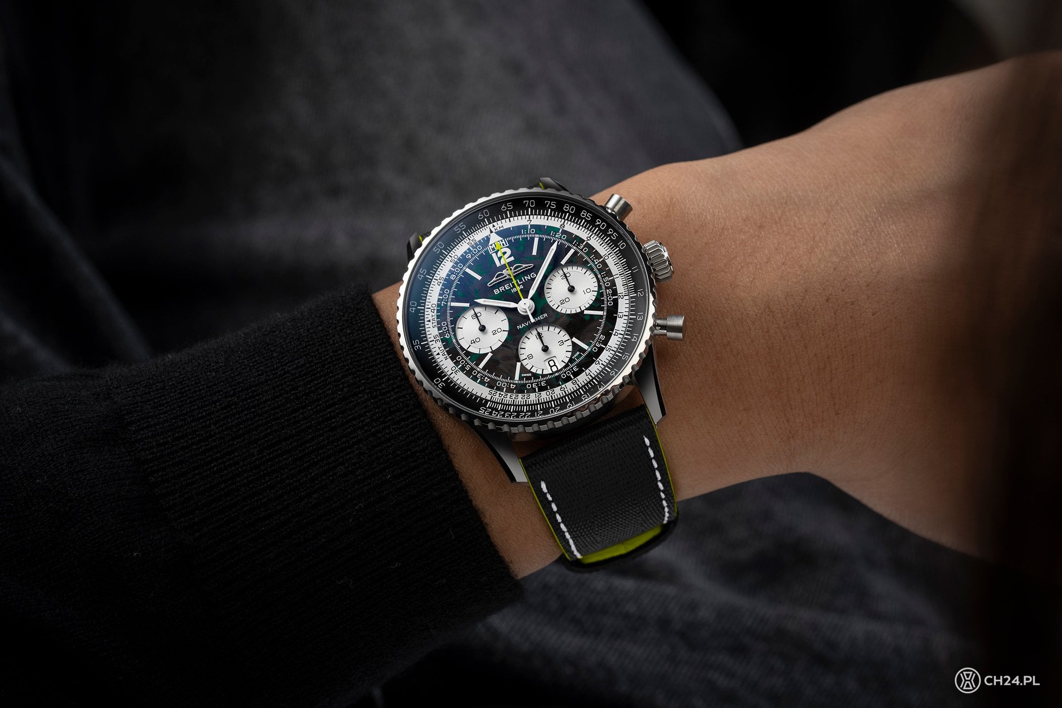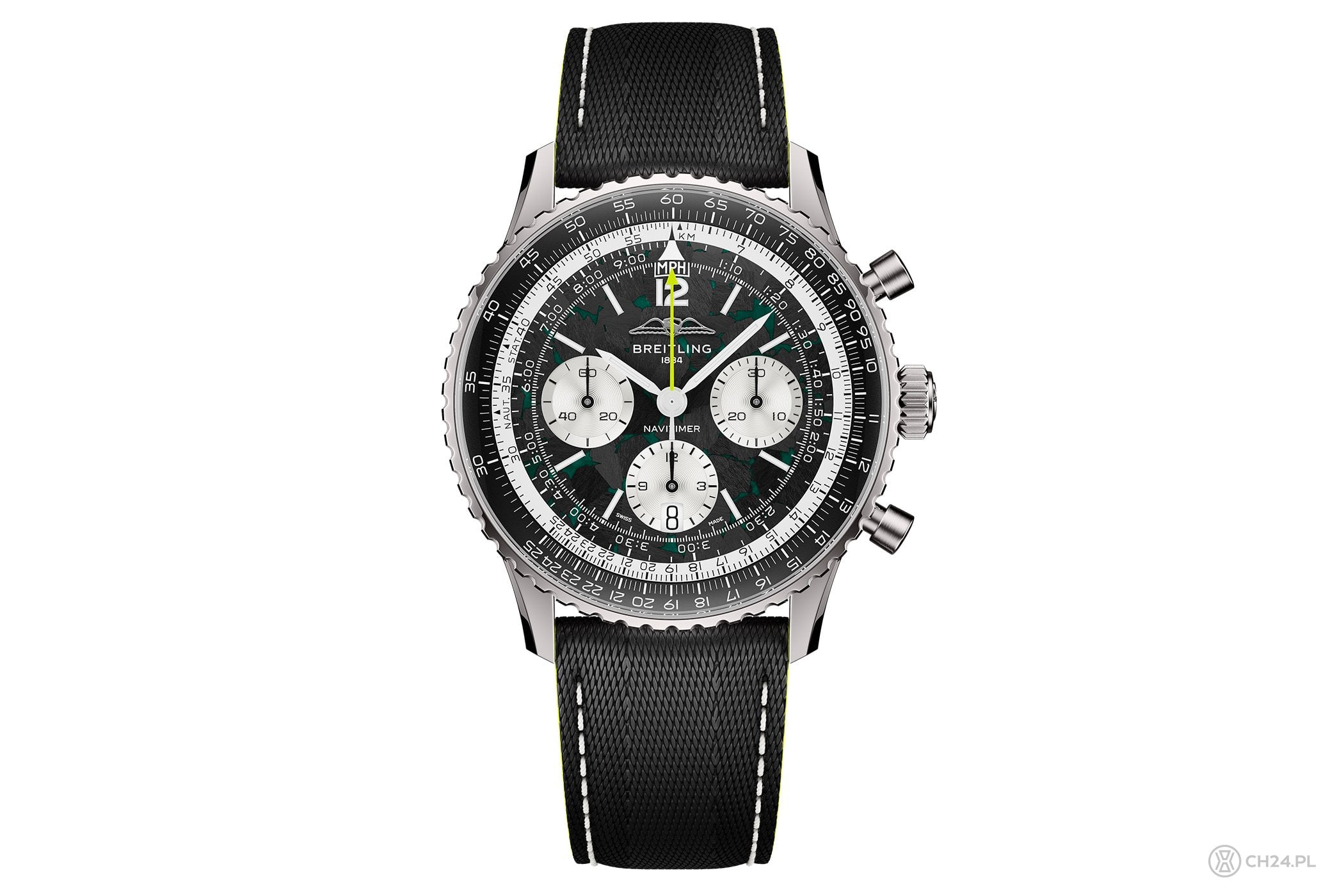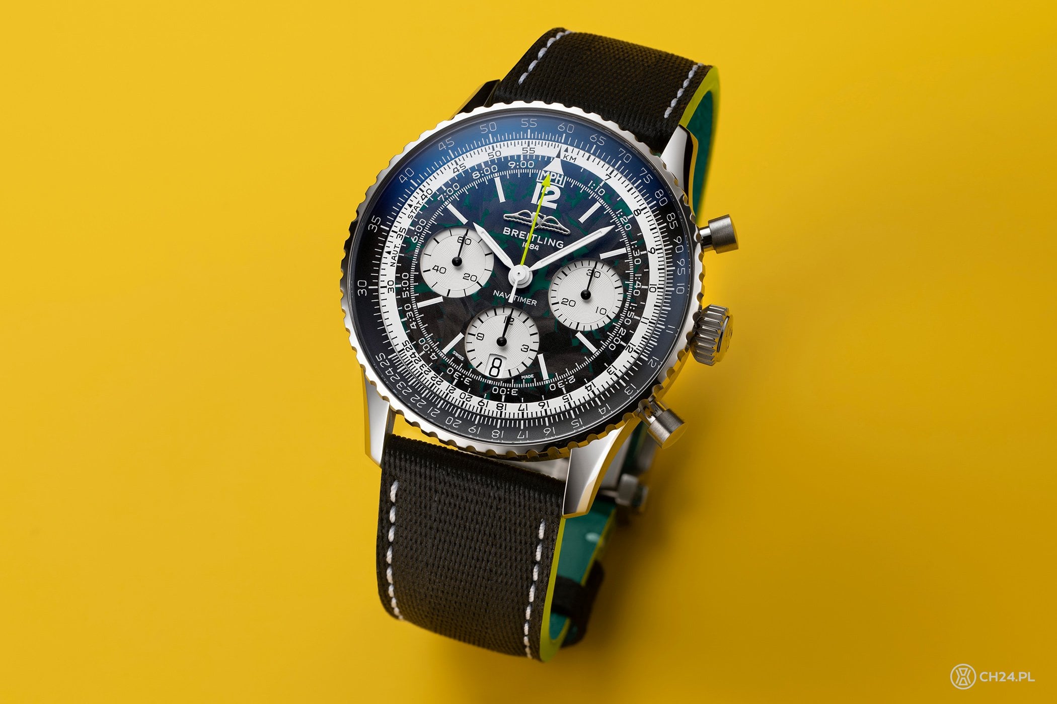 Czarna tarcza w klasycznym układzie Navitimera, ma tym razem nieregularną fakturę włókna węglowego z wtrąceniami z zielonej luminowy. Wskazówka sekundowa stopera jest z kolei jaskrawozielona, a barwy te nawiązują oczywiście do kolorów Aston Martin F1. Reszta kompozycji to już wspomniana klasyka a’la Navitimer, czyli białe tarczki z wyraźnym szlifem ślimakowym, masywny suwak logarytmiczny oraz okienko daty, wkomponowane w tarczkę na wysokości godz. 6.