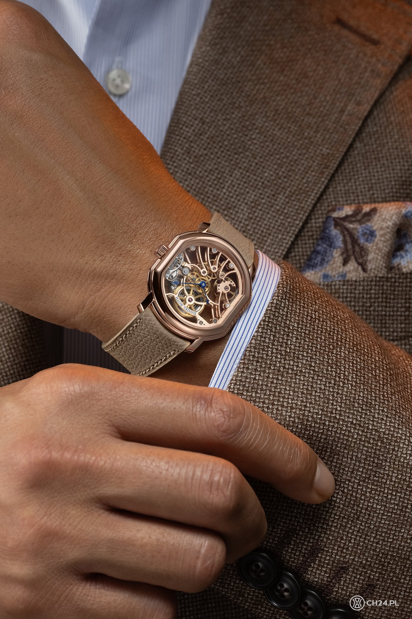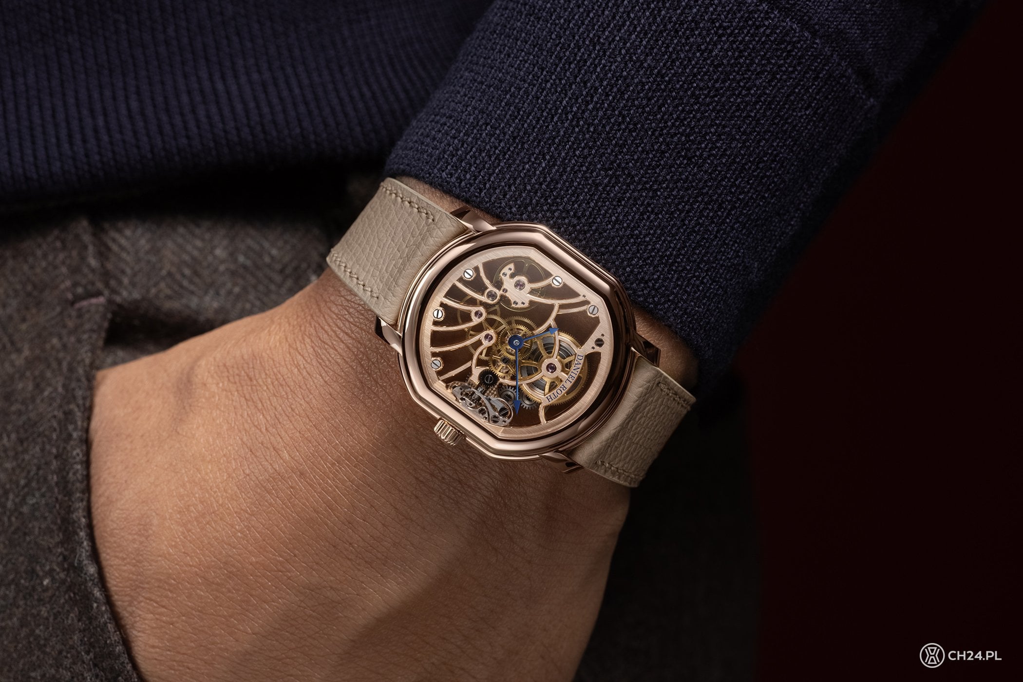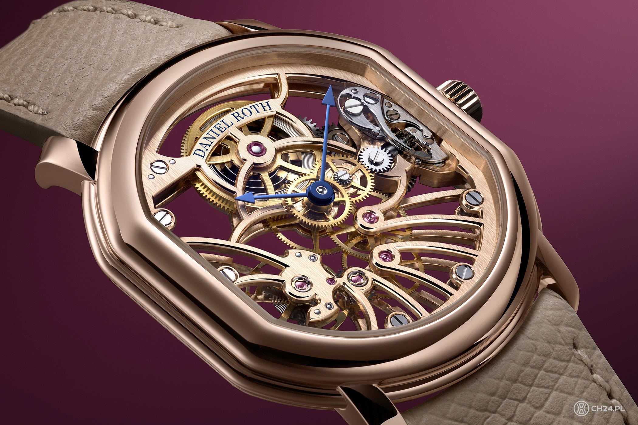 Do kolekcji reaktywowanej marki Daniel Roth dołącza prosty, dwuwskazówkowy model z ażurową, mocno szkieletowaną konstrukcją, opakowany w obłą kopertę z różowego złota.