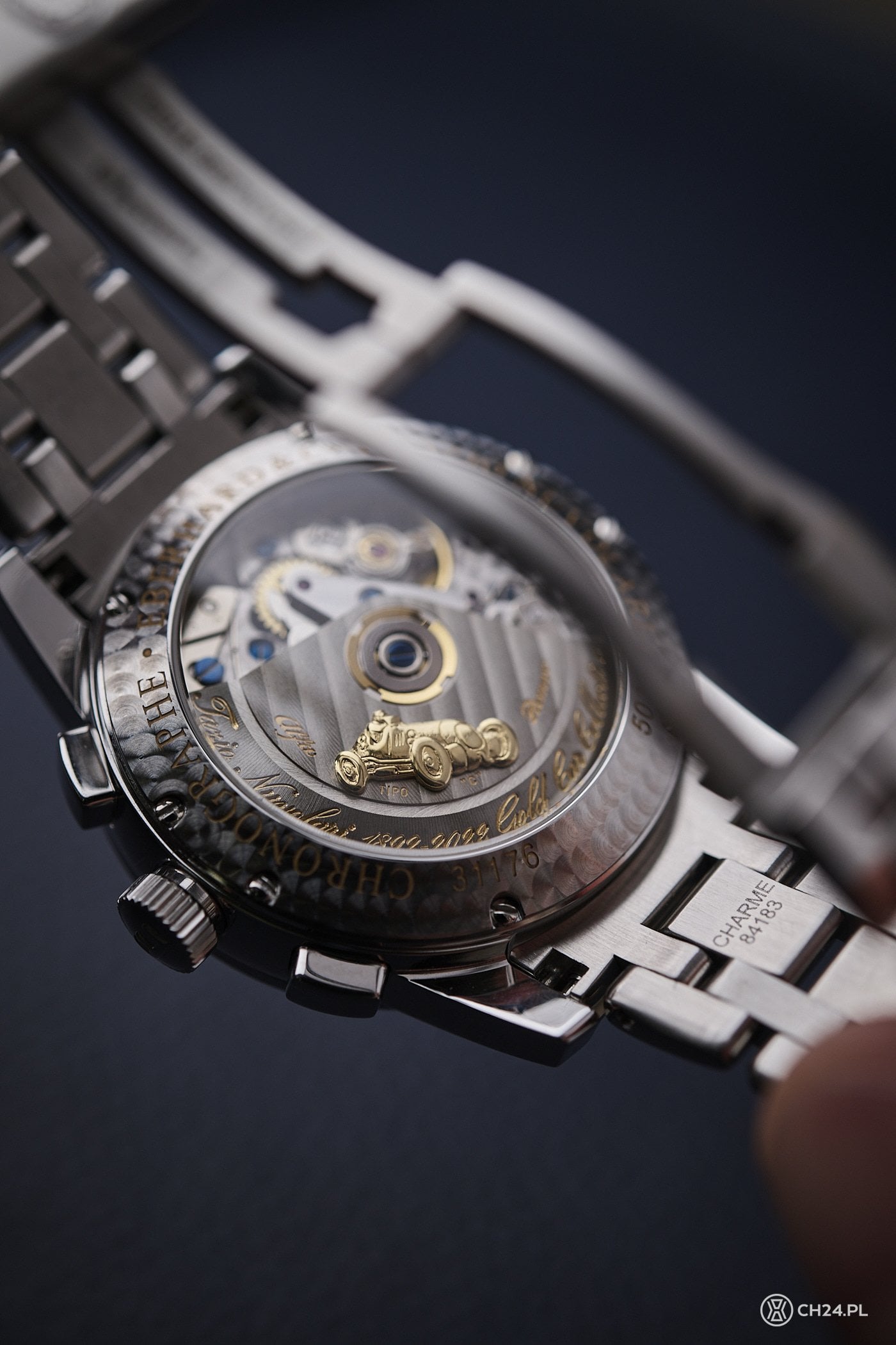 Kiedy obrócimy zegarek, w wersji z przezroczystym deklem zobaczymy ozdobiony złotymi akcentami mechanizm z automatycznym naciągiem i stoperem (ETA 7750) oraz około 50-godzinną rezerwą chodu. W oknie widać na przykład wahnik z wygrawerowanymi napisami zaznaczonymi złotym kolorem oraz postać Tazio Nuvolariego za kierownicą słynnej Alfy Romeo Tipo C (wykonanej z 18-karatowego złota).