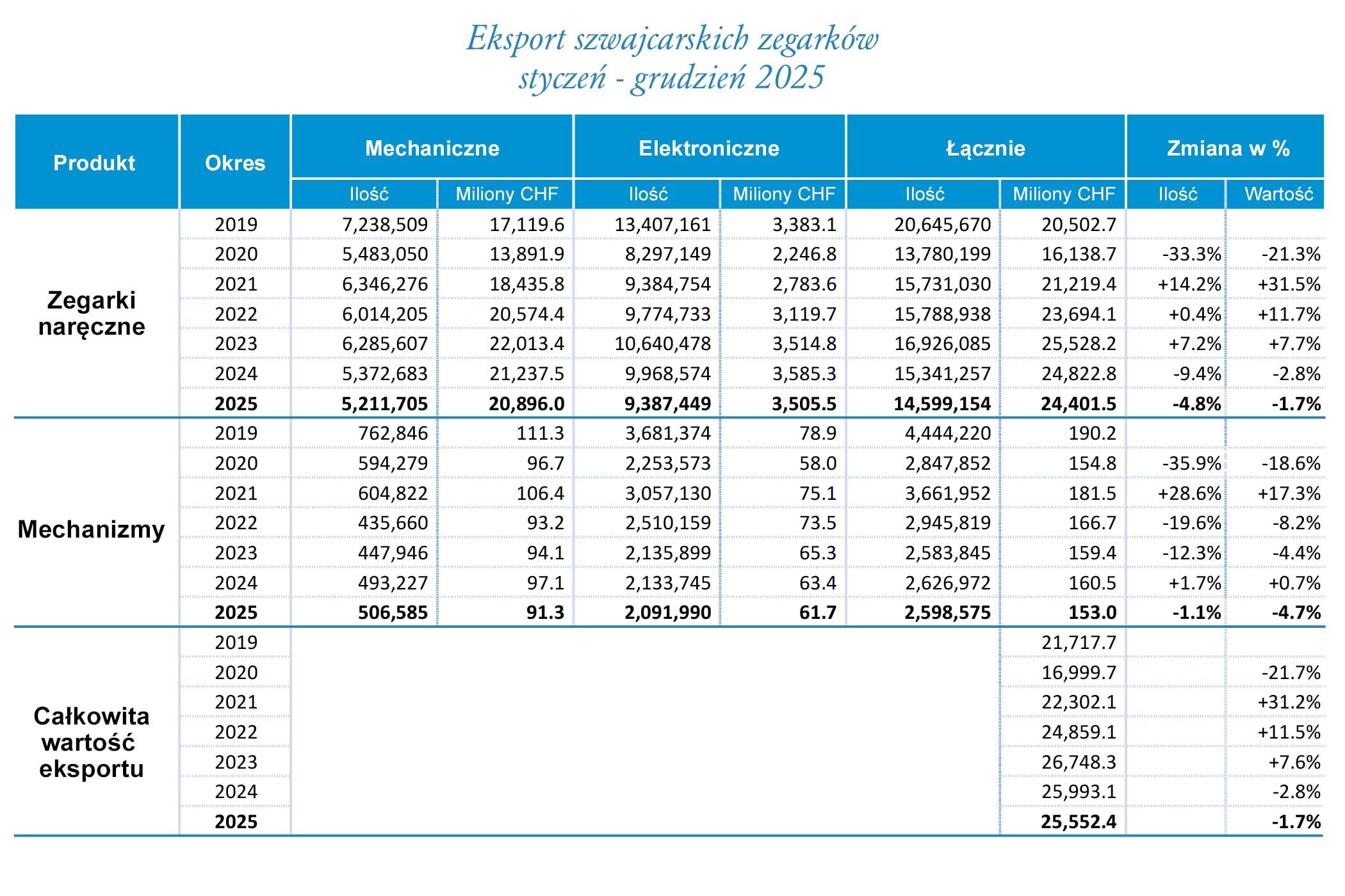 Eksport zegarków naręcznych osiągnął wartość 24,4 mld CHF (~112,1 mld PLN), co oznacza spadek o 1,7% względem 2024 roku. Spadek ten był widoczny także w wolumenie sprzedaży – liczba wyeksportowanych sztuk zmniejszyła się o ponad 742 tysiące, do poziomu 14 599 154 egzemplarzy. W przypadku zegarków mechanicznych eksport zmniejszył się o około 3%, natomiast modeli elektronicznych – o niemal 6%. Łącznie, pod względem ilościowym, odnotowano średni spadek eksportu o 4,8%.