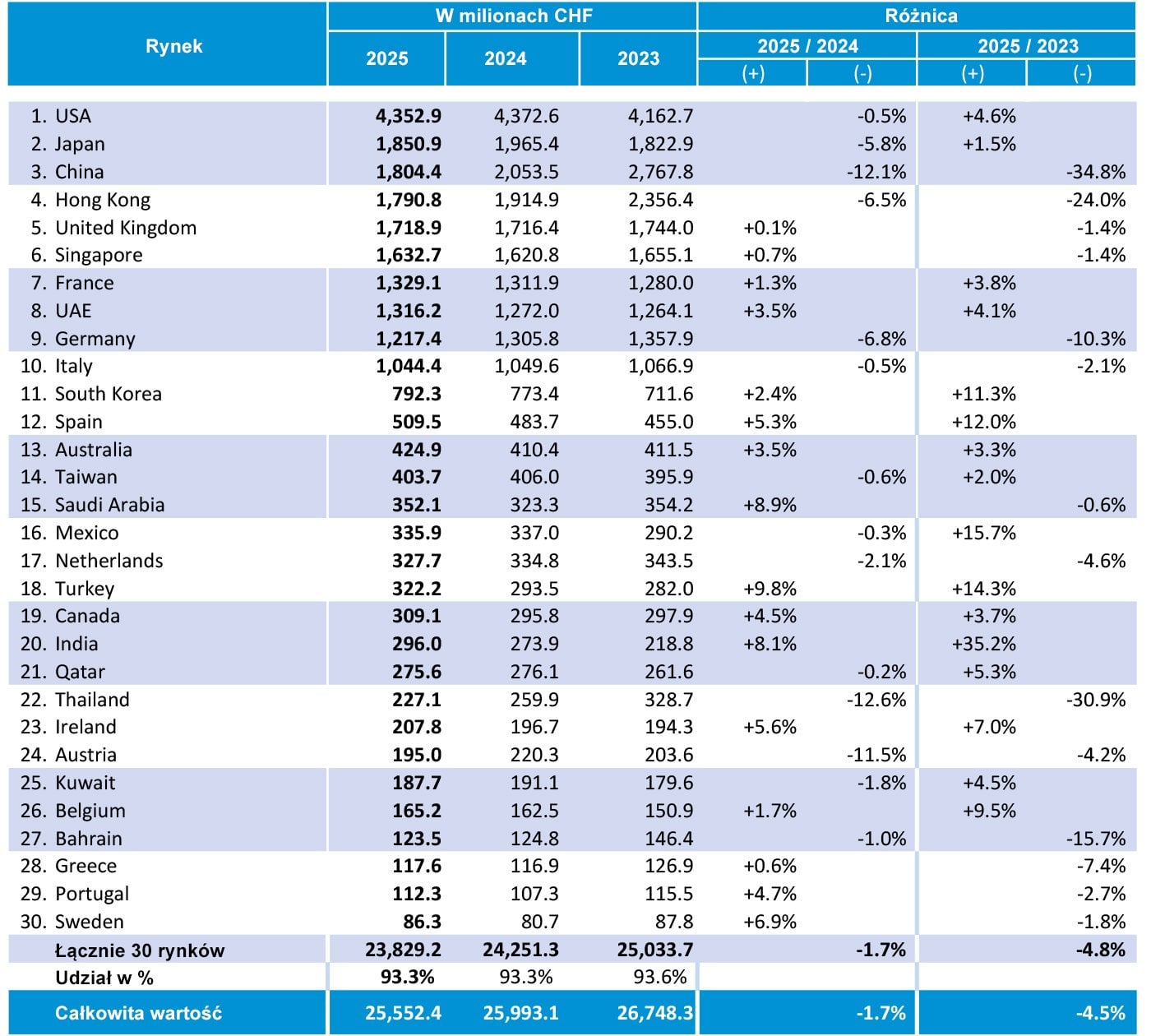 2025 rok z dodatnim wynikiem zakończyła Francja (+1,3%), Hiszpania (+5,3%), Turcja (+9,8%), Kanada (+4,5%), Szwecja (+6,9%), Portugalia (+4,7%), ale także Indie (+8,1%), Arabia Saudyjska (+8,9%) i Zjednoczone Emiraty Arabskie (+3,5%). Wynik Włoch (-0,5%) oraz Wielkiej Brytanii (+0,1%) pozostał na niezmienionym poziomie.