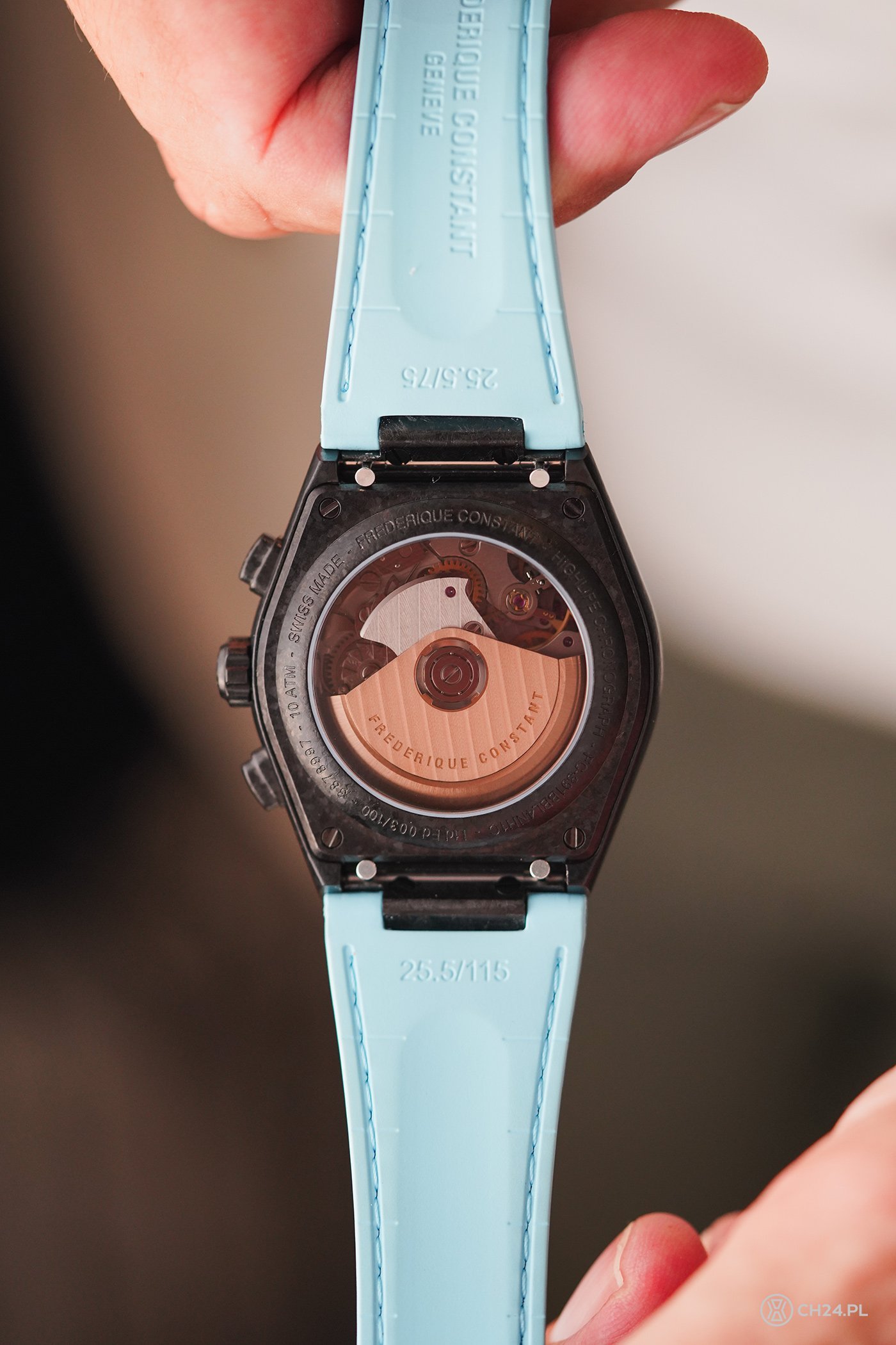 Pod przezroczysty, przydymiony dekiel koperty FC montuje kaliber FC-391. Automatyczny werk pochodzi z manufaktury La Joux-Perret, ma 60 godzin rezerwy chodu, taktowanie na 4 Hz, chronograf zdolny zmierzyć do 12 h oraz koło kolumnowe.