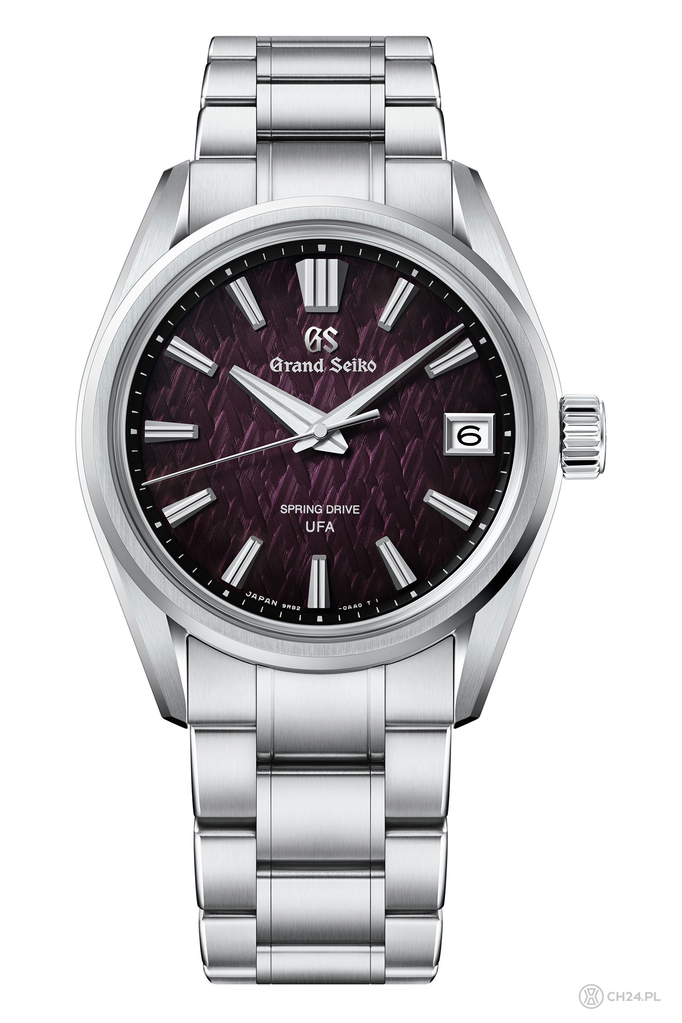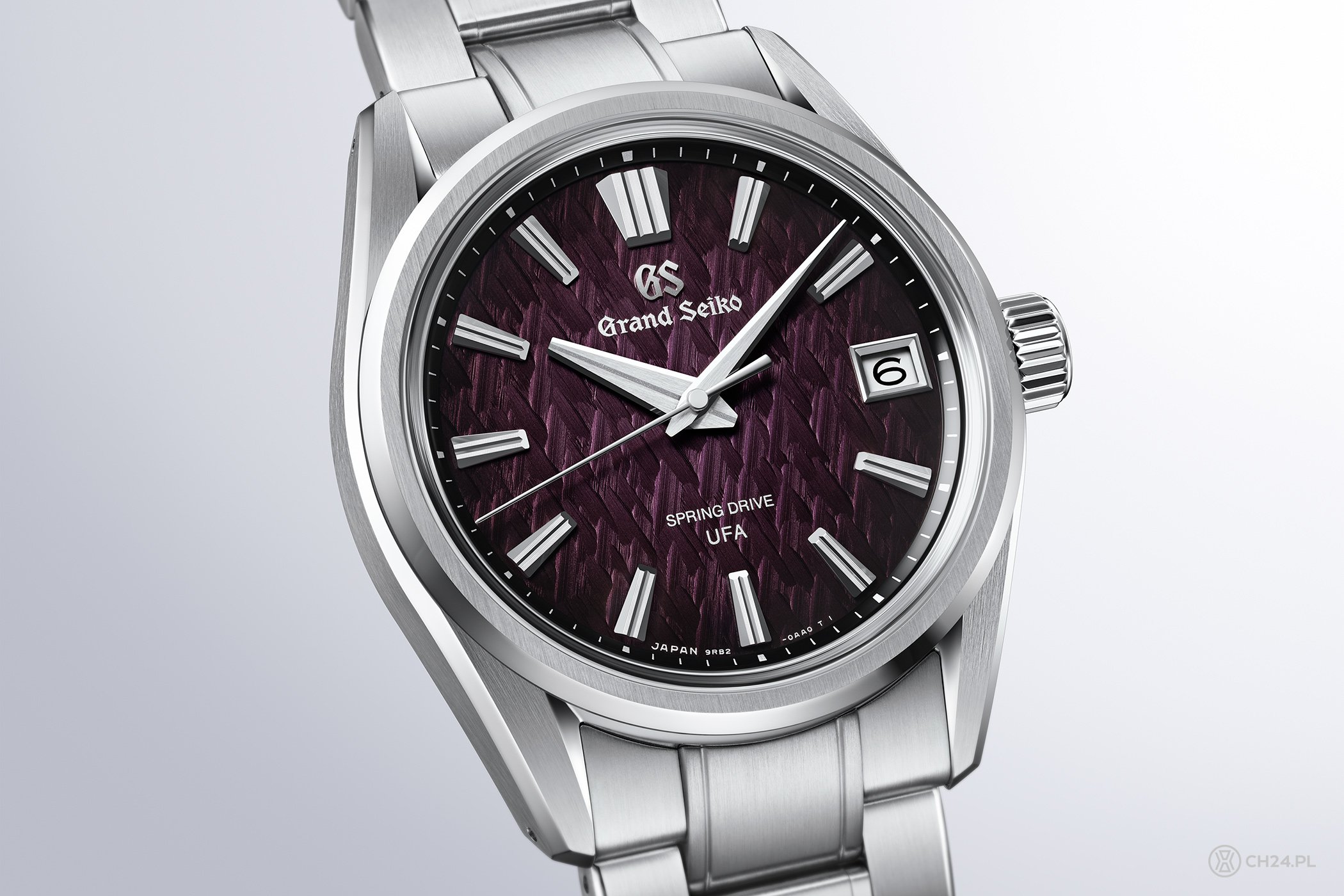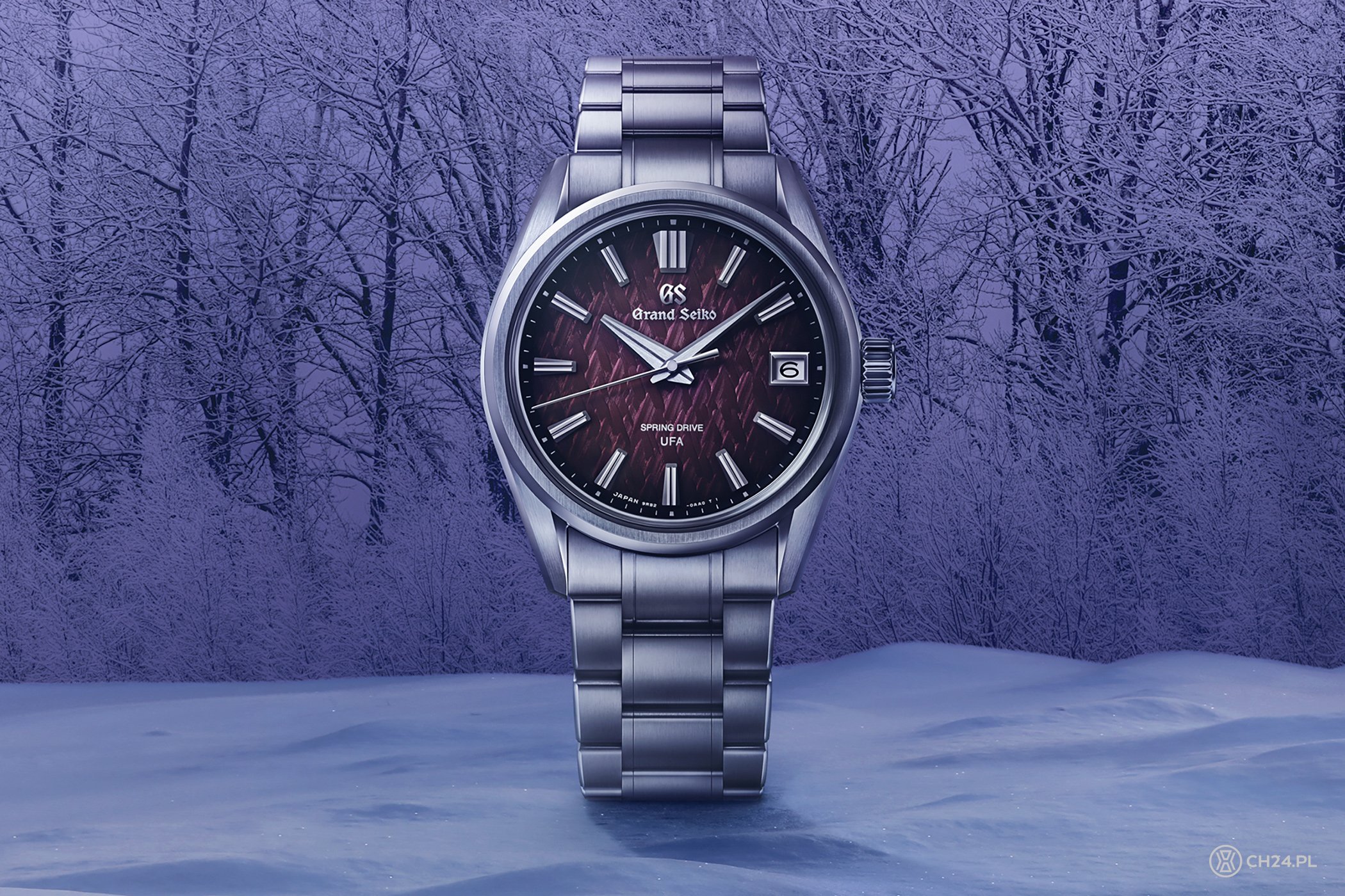 Dlatego SLGB005 świetnie uzupełnia tę serię, oferując trzy nowe elementy: stalową kopertę i bransoletę oraz cieniowaną, ciemnofioletową tarczę, która jest prawie czarna na obrzeżach. W dwóch pierwszych modelach, cyferblaty były w jasnoniebieskich odcieniach i ozdabiał je wzór inspirowany naturą (jak zwykle w przypadku marki Grand Seiko), a dokładnie zimowym krajobrazem płaskowyżu Kirigamine znajdującego się w regionie Shinshu, gdzie powstają wszystkie zegarki Grand Seiko Spring Drive (w zimie rosnące tam drzewa pokrywają się szronem, a ich wierzchołki tworzą bajeczne kompozycje).