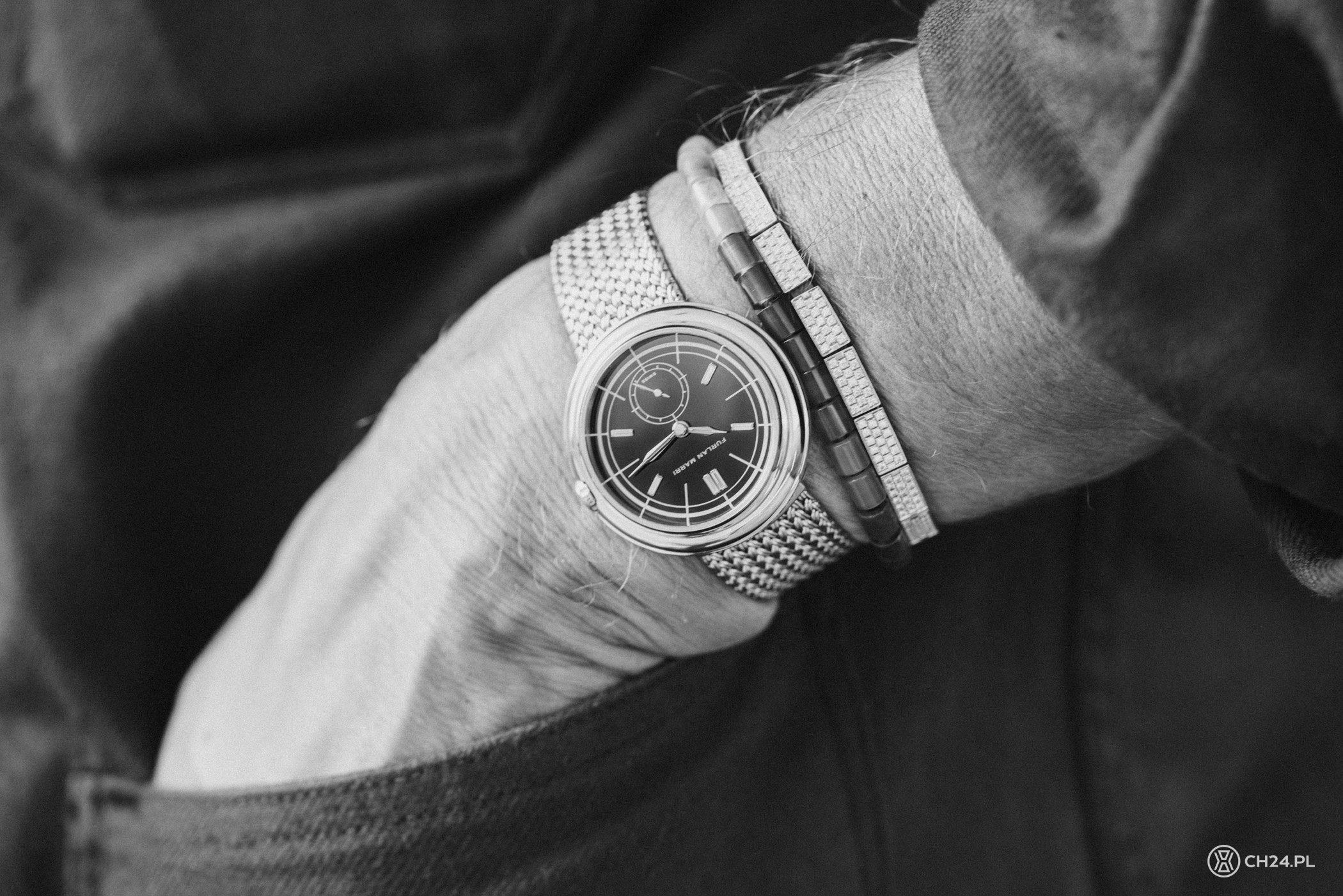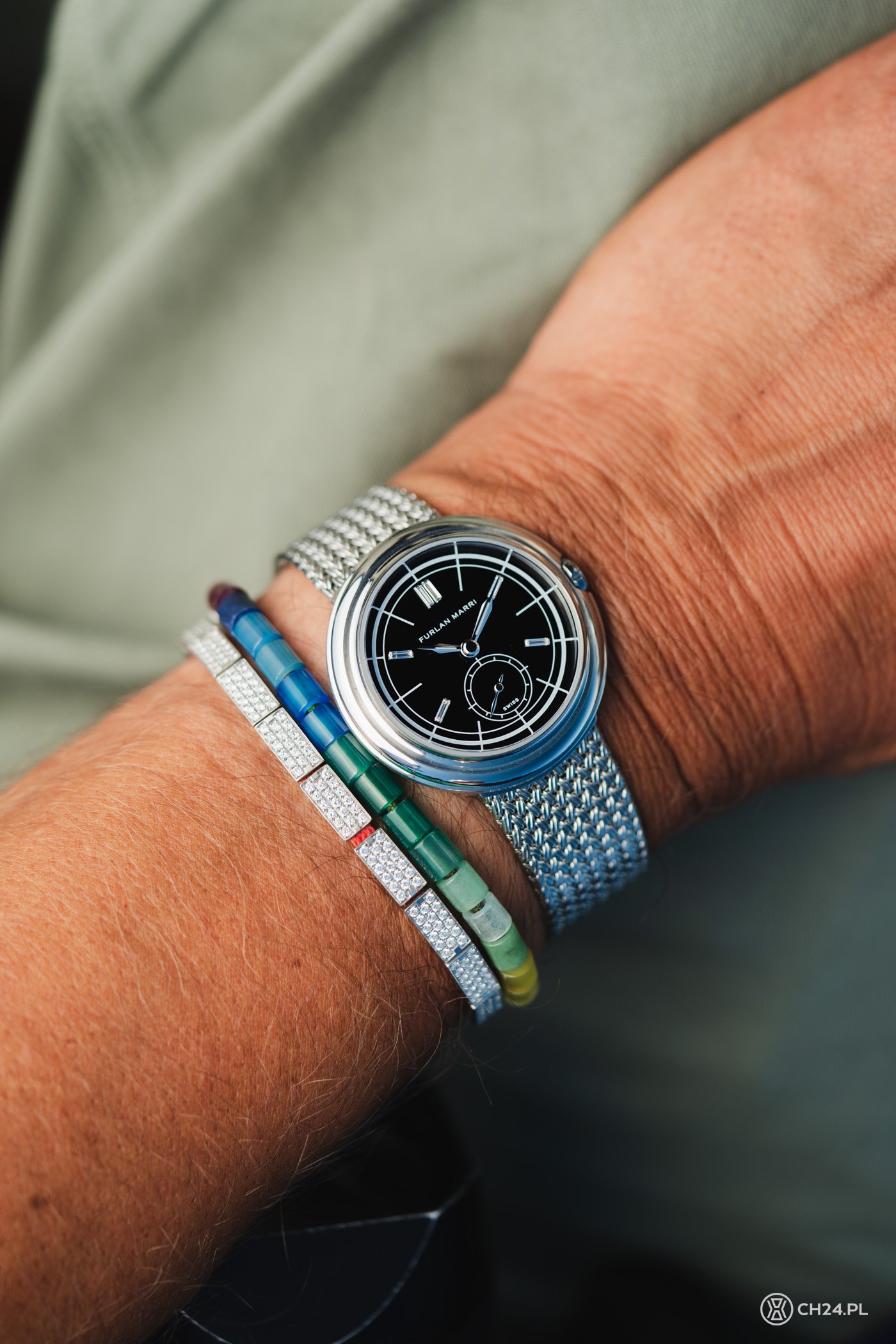 Disco Onyx Diamonds ma zamocowaną do koperty stalową bransoletę mesh – zrobiono ją z plecionych (splot jodełkowy), stalowych drucików, tworzących gęstą siatkę na kształt starodawnej zbroi rycerskiej albo – ukłon w stronę fanów Tolkiena – krasnoludzkiego mithrilu i tkanych z niego kolczug. Te powstawały w odmętach Khazad-dum, ta od Frulana powstaje w Azji i… zdecydowanie zaskakuje jakością. Mesh nie jest może najbardziej popularną z bransolet używanych w zegarkach, ale ma swój czar i ostatnimi czasy sięga po niego coraz więcej producentów, nawet tych z wyższej półki (np. Omega i Jaeger-LeCoultre). Wychodzi to różnie, Furlanowi natomiast udało się znakomicie. Bransoleta jest cienka, ale solidna, odpowiednio elastyczna i wygodnie układająca się na przegubie. Zwęża się nieco ku dołowi i zapina na małą, zatrzaskiwaną klamerkę. Z kopertą z kolei bransoletę łączy system szybkiej zmiany – w mgnieniu oka można więc zamienić ją na skórzany pasek.