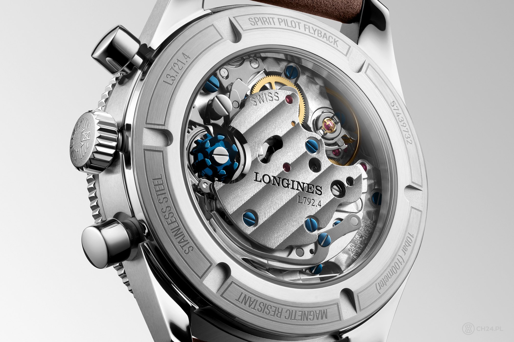 Szafirowe szkło zamyka kopertę również od strony dekla, zachowując przy tym jej pełną wodoszczelność równą 100 metrom. Widoczny za nim kaliber L792 powstaje specjalnie dla Longinesa w manufakturze ETA, należącej do tej samej Grupy Swatch. Mechanizm ma pokaźne 68 godzin rezerwy chodu, które generuje się wygodną w obsłudze koronką. Za obsługę stopera odpowiada koło kolumnowe, wyraźnie widoczne dzięki niebieszczeniu, obecnemu również na śrubkach. Kaliber L792 całkiem starannie wykończono, m.in. pasami genewskimi, polerkami oraz perłowaniem. Najistotniejsza jest w nim jednak funkcja Flyback – komplikacja szybkiego resetowania stopera tak, by od razu rozpocząć nowy pomiar czasu. To właśnie Longines, jako pierwszy na świecie, opatentował tę użyteczną funkcję jeszcze w 1936 roku. Flyback jest zresztą immanentnie związany właśnie z zegarkami dla pilotów, bowiem pozwalał im błyskawicznie rozpocząć nowy pomiar czasu bez konieczności wcześniejszego zatrzymywania i resetowania, jak w klasycznym chronografie.