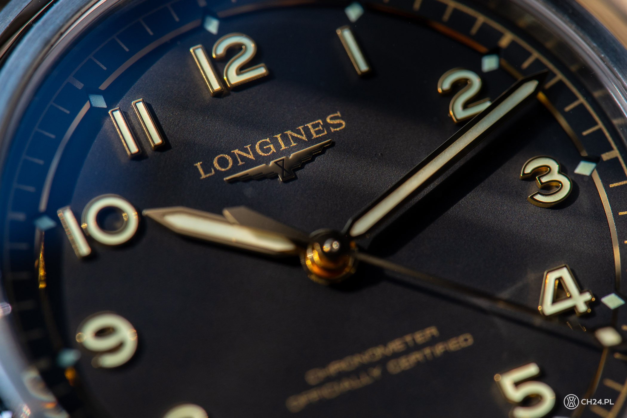 Złoty kolor – w wydaniu przywodzącym na myśl vintage’owy „gilt” – wykorzystano również do nadruku nazwy Longines, a także podziałki minutowej. Ta ostatnia została umieszczona na delikatnie nachylonym (znacznie mniej wyraźnie niż kiedyś), czarnym pierścieniu okalającym tarczę. Jego wewnętrzną krawędź wypolerowano, co nadaje jej ładny, złoty połysk. Podobnie jak w modelu z 2020 roku, tak i tu pierścień ten ma 12 drobnych wcięć w kształcie litery “V”, w które częściowo wpasowują się romby nadrukowane z wykorzystaniem substancji świecącej Super-LumiNova. Zgodnie z konwencją zegarka typu pilot, substancja świecąca obficie wypełnia również arabskie cyfry oraz wskazówki.
