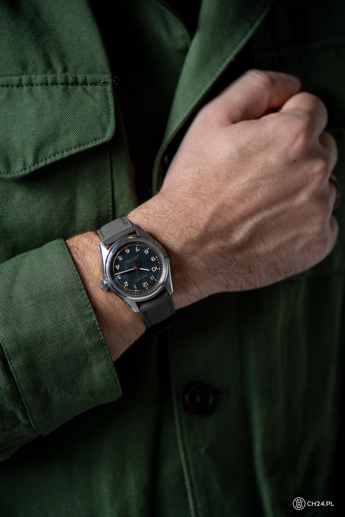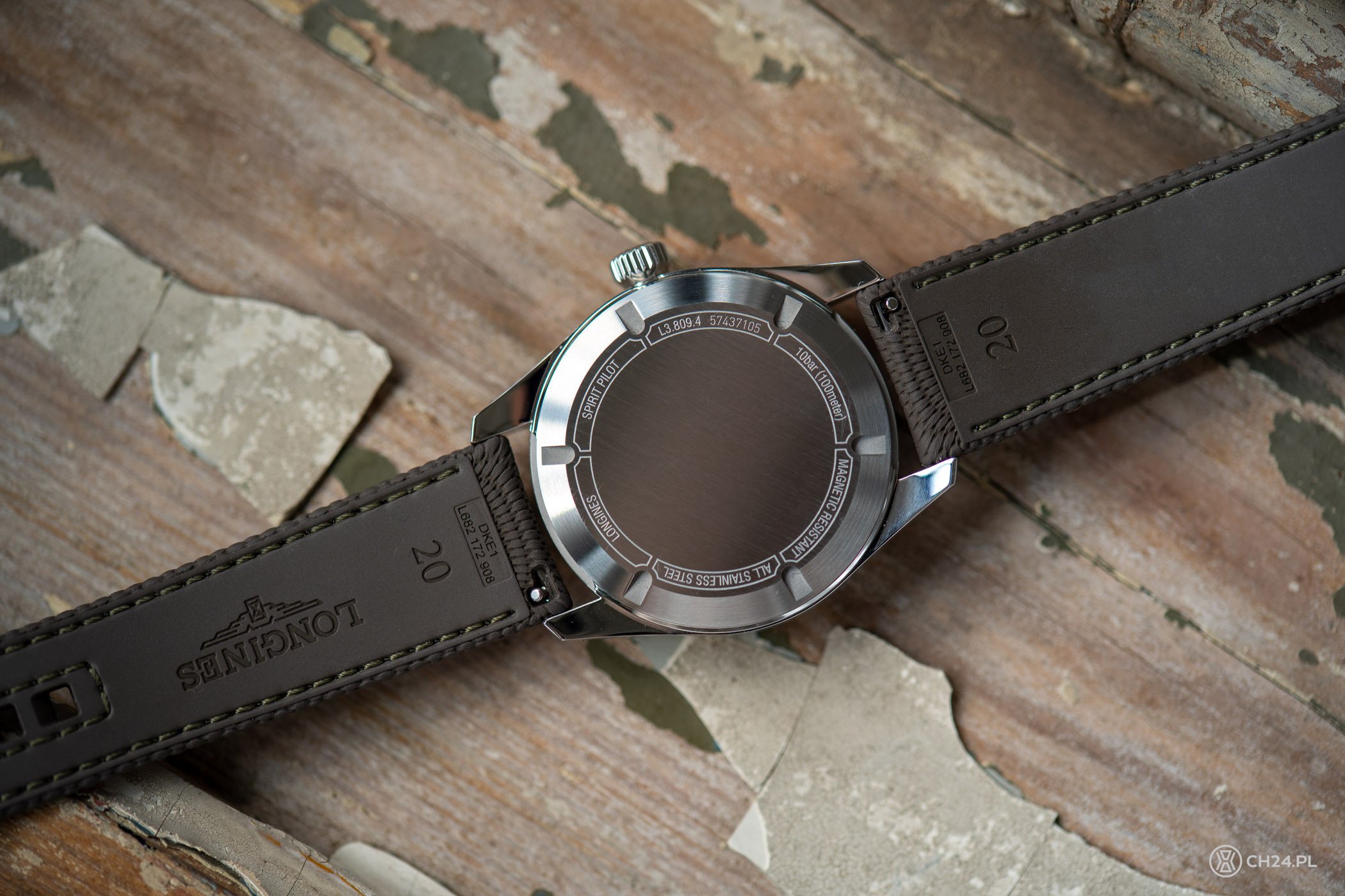 W opisywanej wersji model Spirit Pilot zestawiono z zielonym, gumowym paskiem o teksturowanej powierzchni. W codziennym użytkowaniu sprawdza się bardzo dobrze i świetnie pasuje do tej konkretnej referencji (L3.809.4.53.9). Dzięki systemowi szybkiej zmiany paska można łatwo zastąpić go wariantem skórzanym (Ref. L3.809.4.53.2) albo stalową bransoletą (Ref. L3.809.4.53.6).