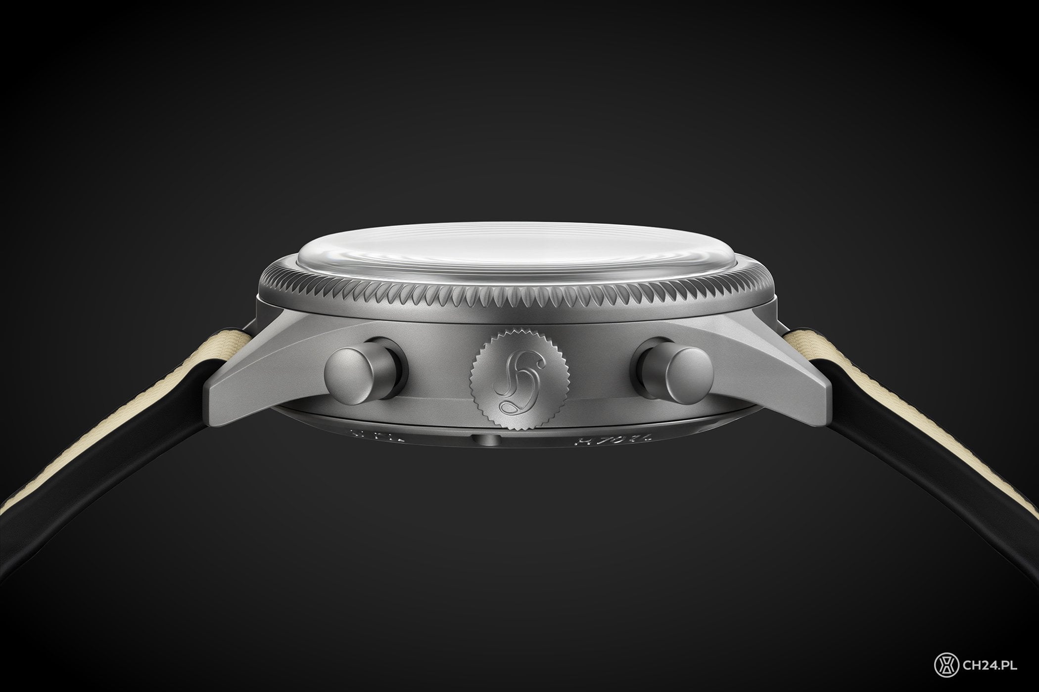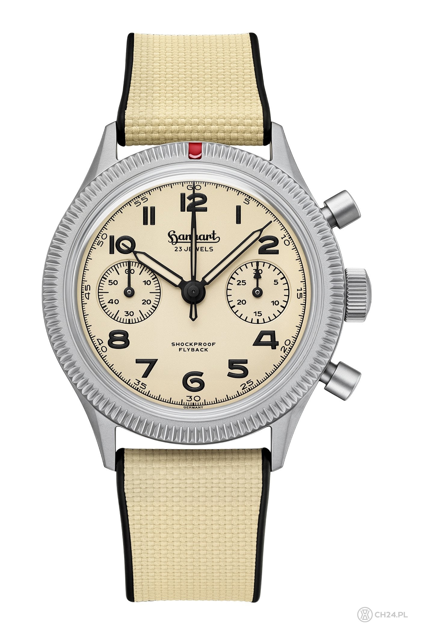Żeby nie było zbyt prosto, tytan to nie jedyne novum najnowszej referencji 417 Ti. Do kompletu dodano beżowy, piaskowy cyferblat. Wybór nie jest przypadkowy, bowiem Hanhart zainspirował się piaskami pustyni, które pokonują rajdowe auta, np. podczas rajdu Dakar. Cyferblat ma więc beżowy kolor i matowe, lekko chropowate (niczym piasek) wykończenie. Dla kontrastu wszystkie aplikacje, indeksy oraz napisy są czarne, łącznie ze wskazówkami, wypełnionymi luminową.