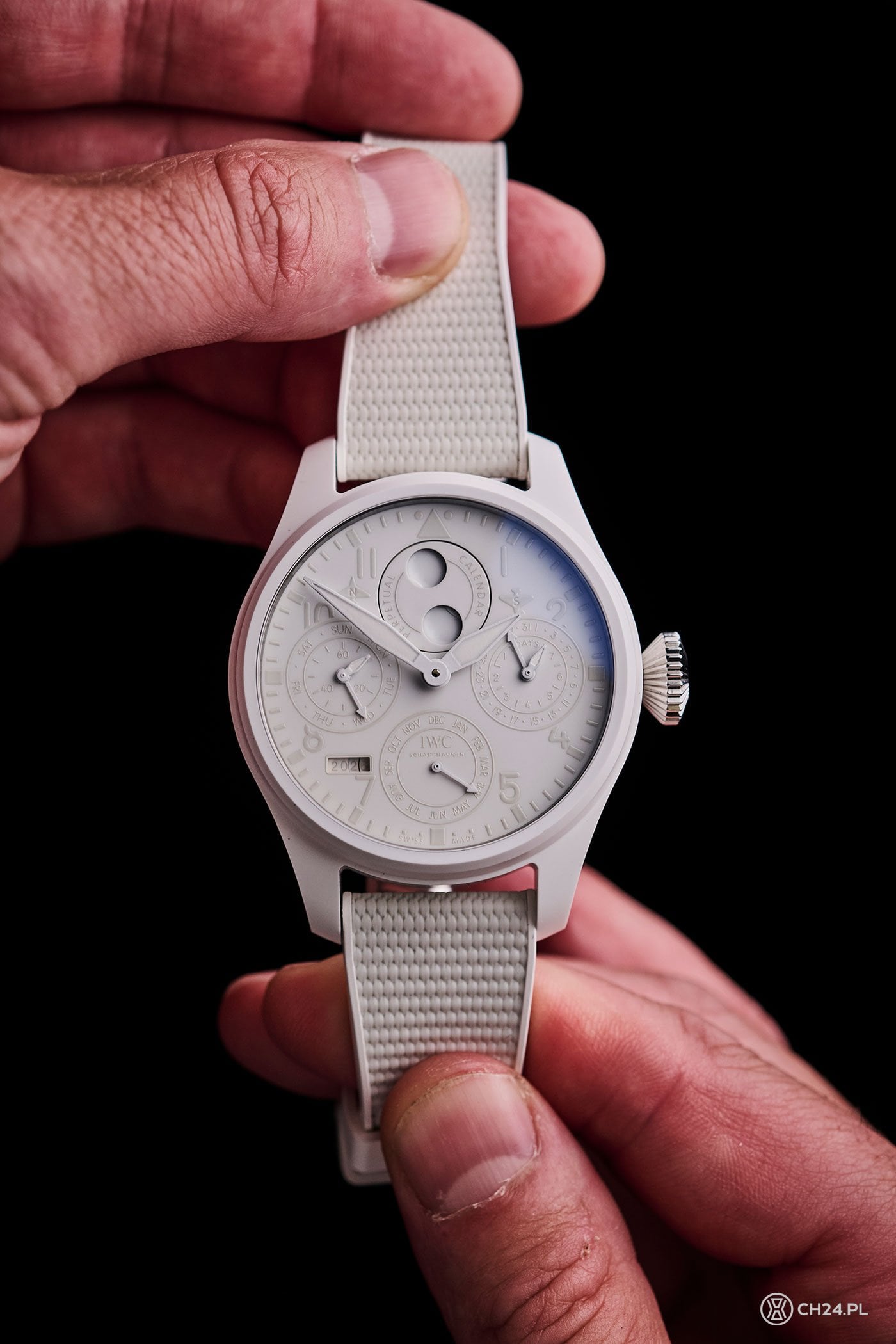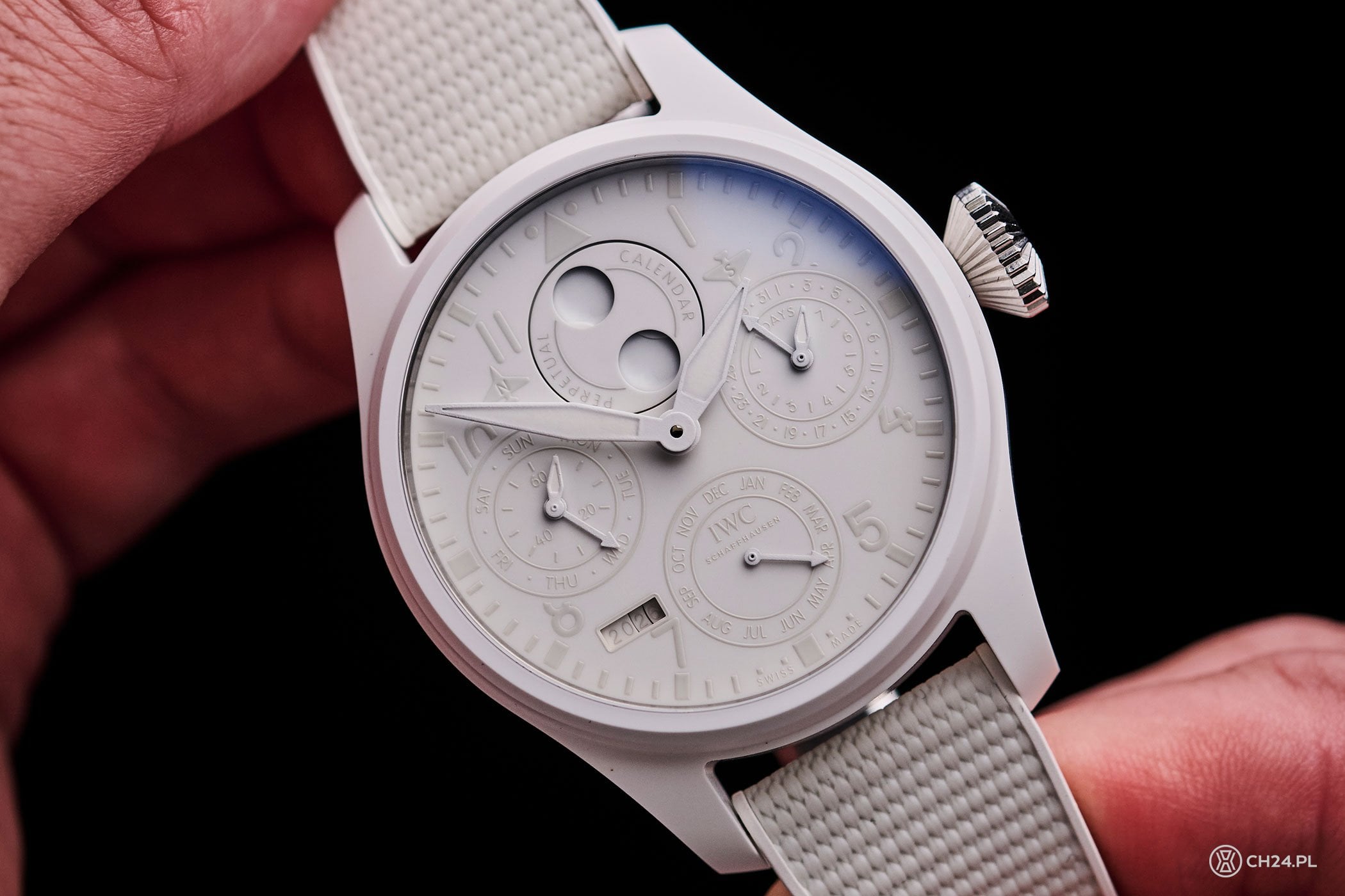 Duża koperta z białej ceramiki plus monochromatyczna, biała tarcza i biały, gumowy pasek. Big Pilot’s Watch Perpetual Calendar Ceralume jest mniej czytelny w dzień, za to mocno świeci w nocy.