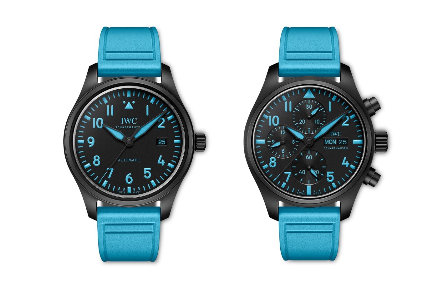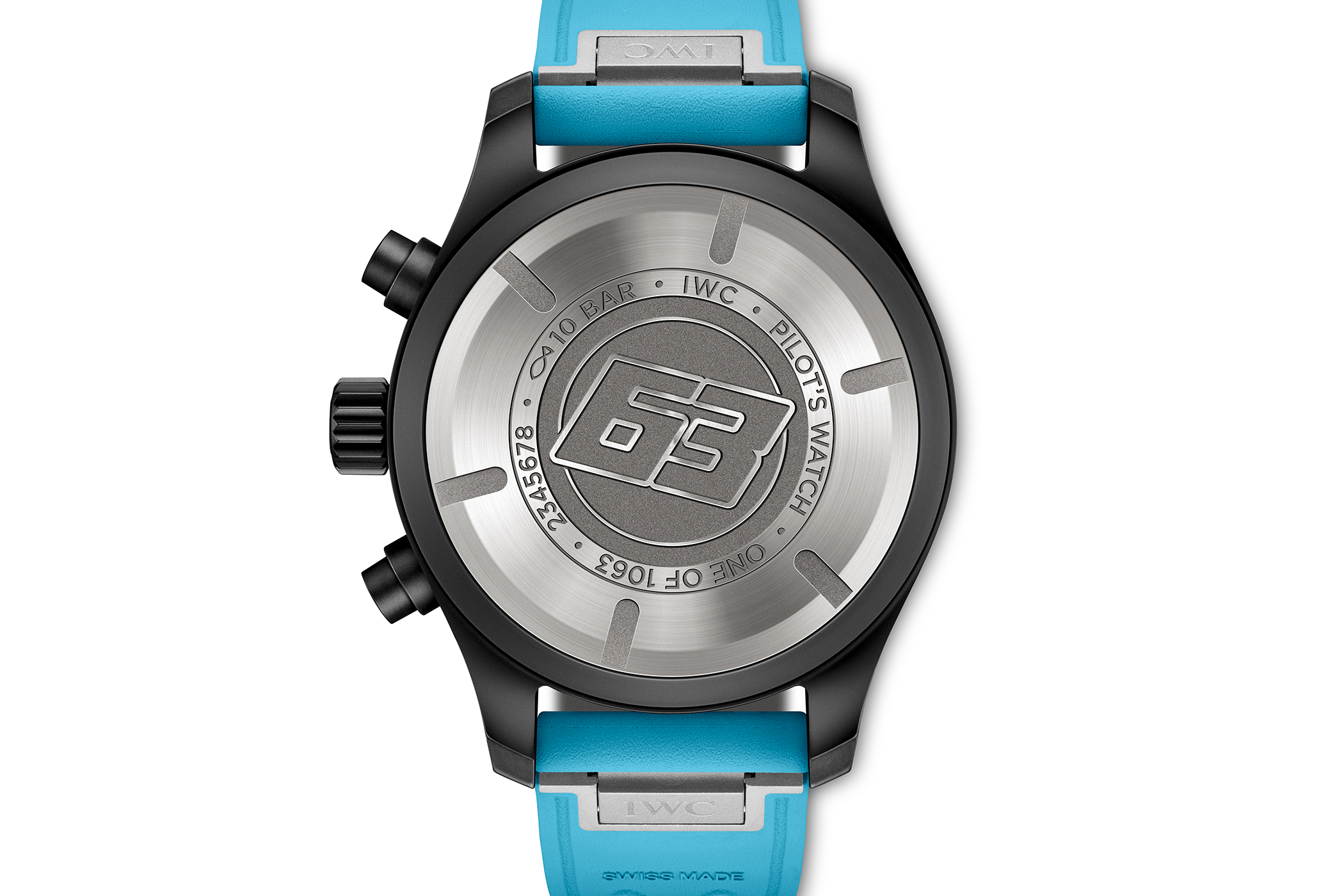Oba modele – Pilot’s Watch Chronograph 41 i Pilot’s Watch Automatic – wykonano z czarnej, matowej ceramiki. Dodano do niej koronki oraz przyciski stopera z Ceratanium (in-house’owego stopu ceramik i tytanu) oraz dekle z lekkiego tytanu. Na deklach wytłoczony został numer „63”, ten sam, z którym startuje George Russell.
