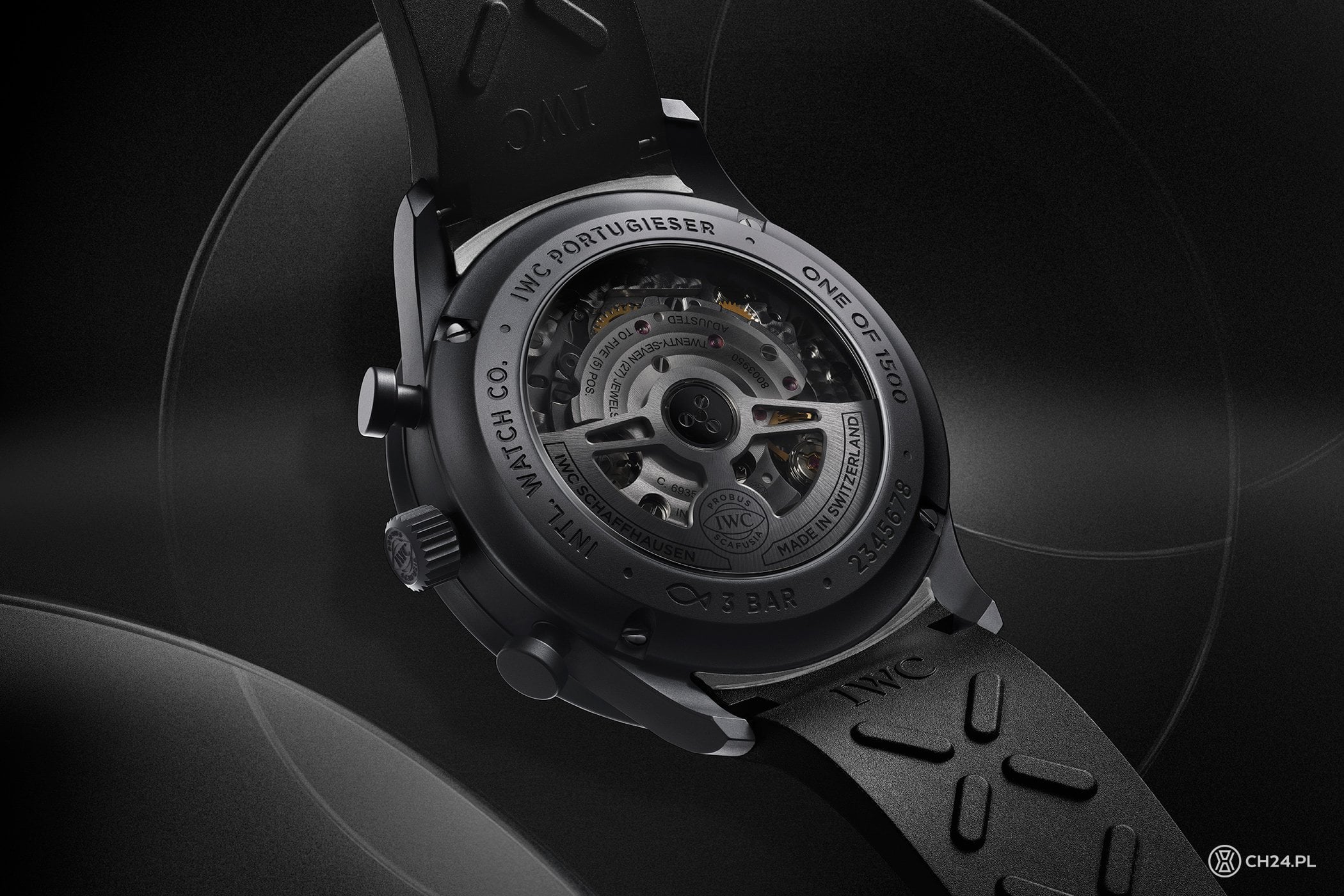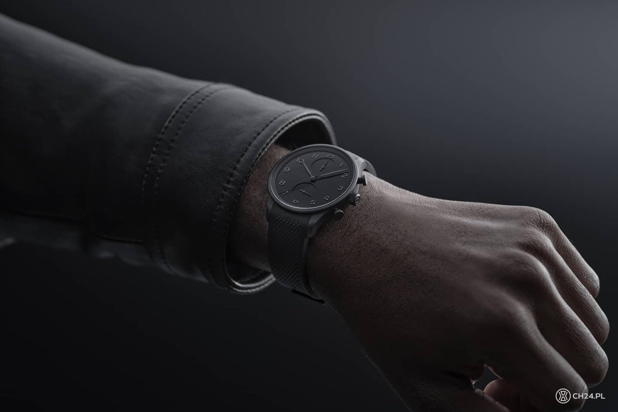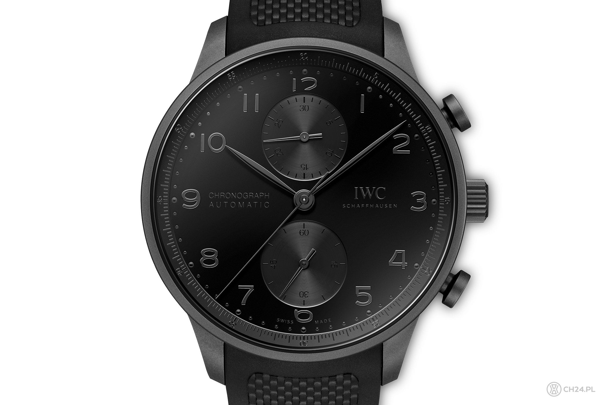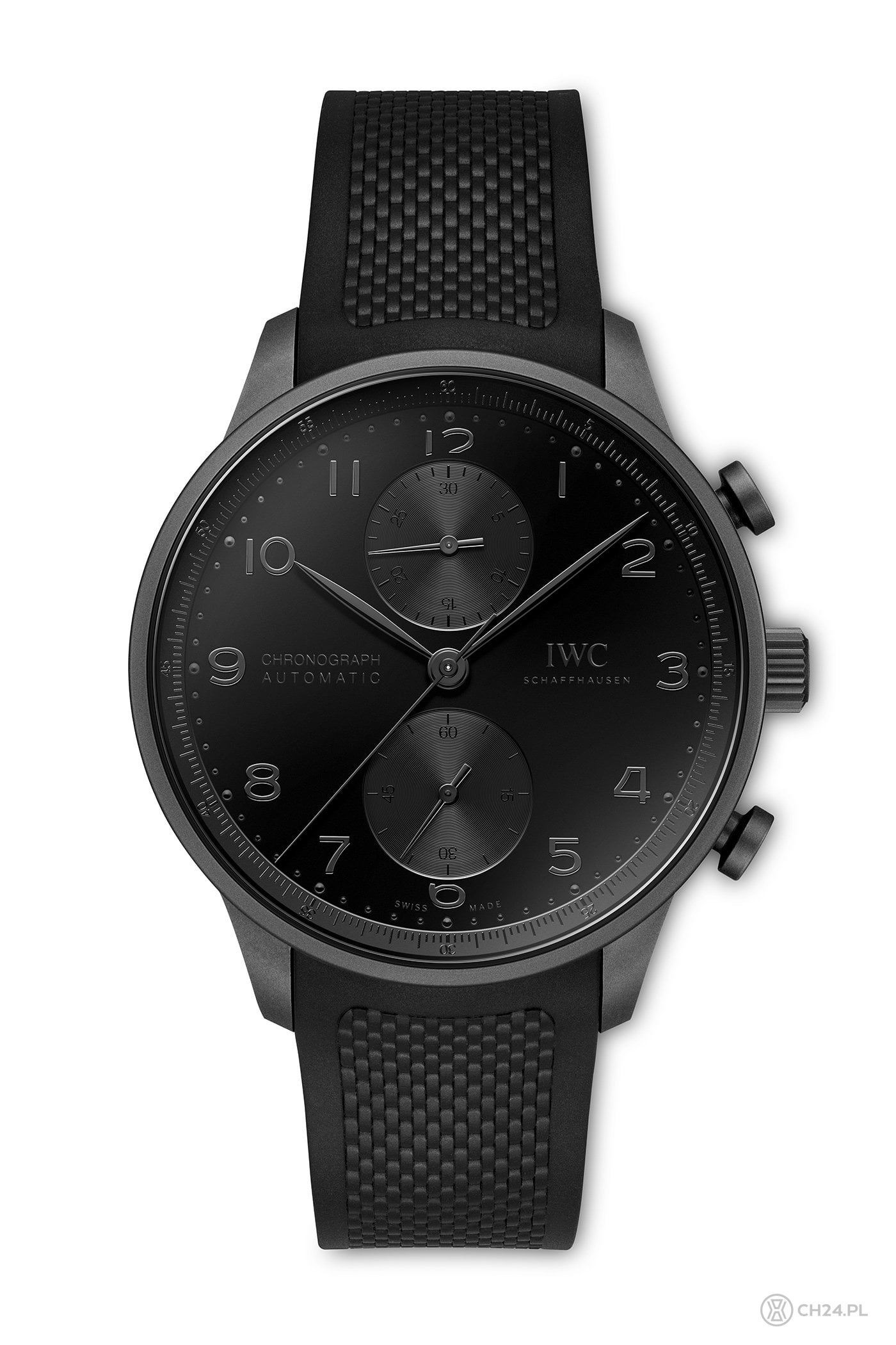 Dopiero 3 dekady po premierze Portugalczyka z chronografem IWC pokusiło się o jego czarne wydanie. Co więcej, to wersja tzw. „all-black”, w całości spowita czernią. Mierzącą 41 mm średnicy i 13,1 mm grubości obudowę wykonano z powstającego in-house kompozytu o nazwie Ceratanium. Materiał ten łączy w sobie właściwości tytanu z parametrami ceramiki. Wypiekany jest w piecu, w odpowiednio spreparowanych formach. Gotowy materiał ma czarny kolor z lekko metaliczną fakturą matowej powierzchni. Z Ceratanium wykonana jest również sygnowana koronka oraz dwa przyciski stopera, w formie klasycznych grzybków.