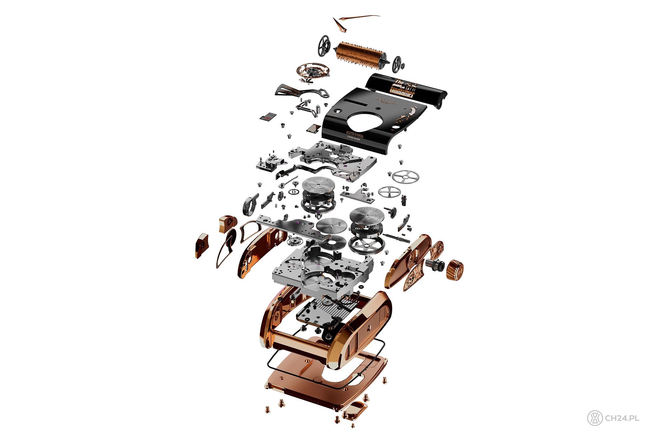 I jeszcze kilka słów na temat mechanizmu: składający się z 510 części, ręcznie nakręcany kaliber JCAM62 pracuje z częstotliwością 21 600 wahnięć na godzinę (3 Hz) i ma dwa bębny: jeden odpowiada za wskazania czasu (zegarek ma 72-godzinną rezerwę chodu), a drugi obsługuje pozytywkę. Każdy z nich jest nakręcany za pomocą koronki (w jednym kierunku – mechanizm chodu, a w drugim – mechanizm pozytywki).