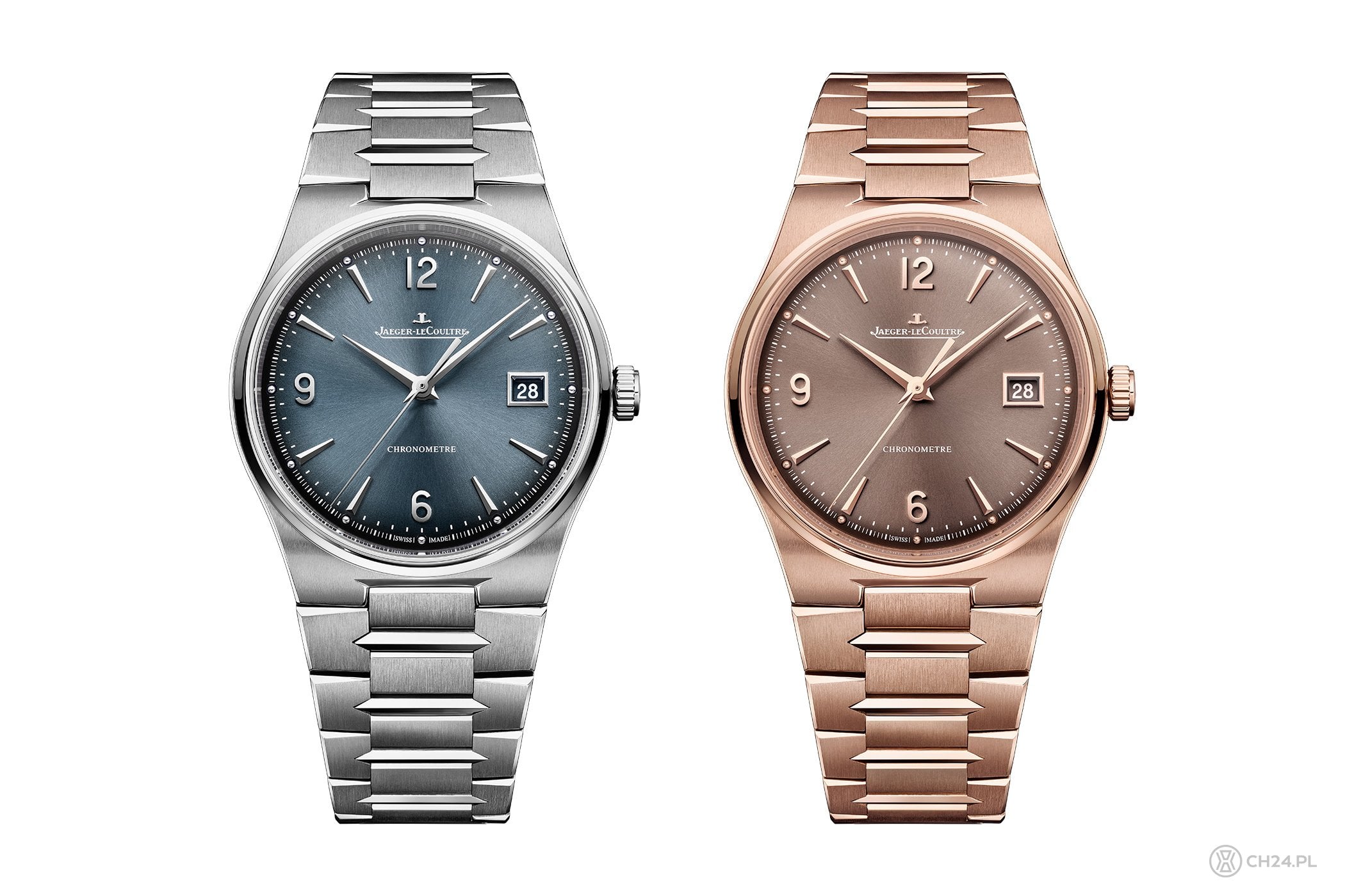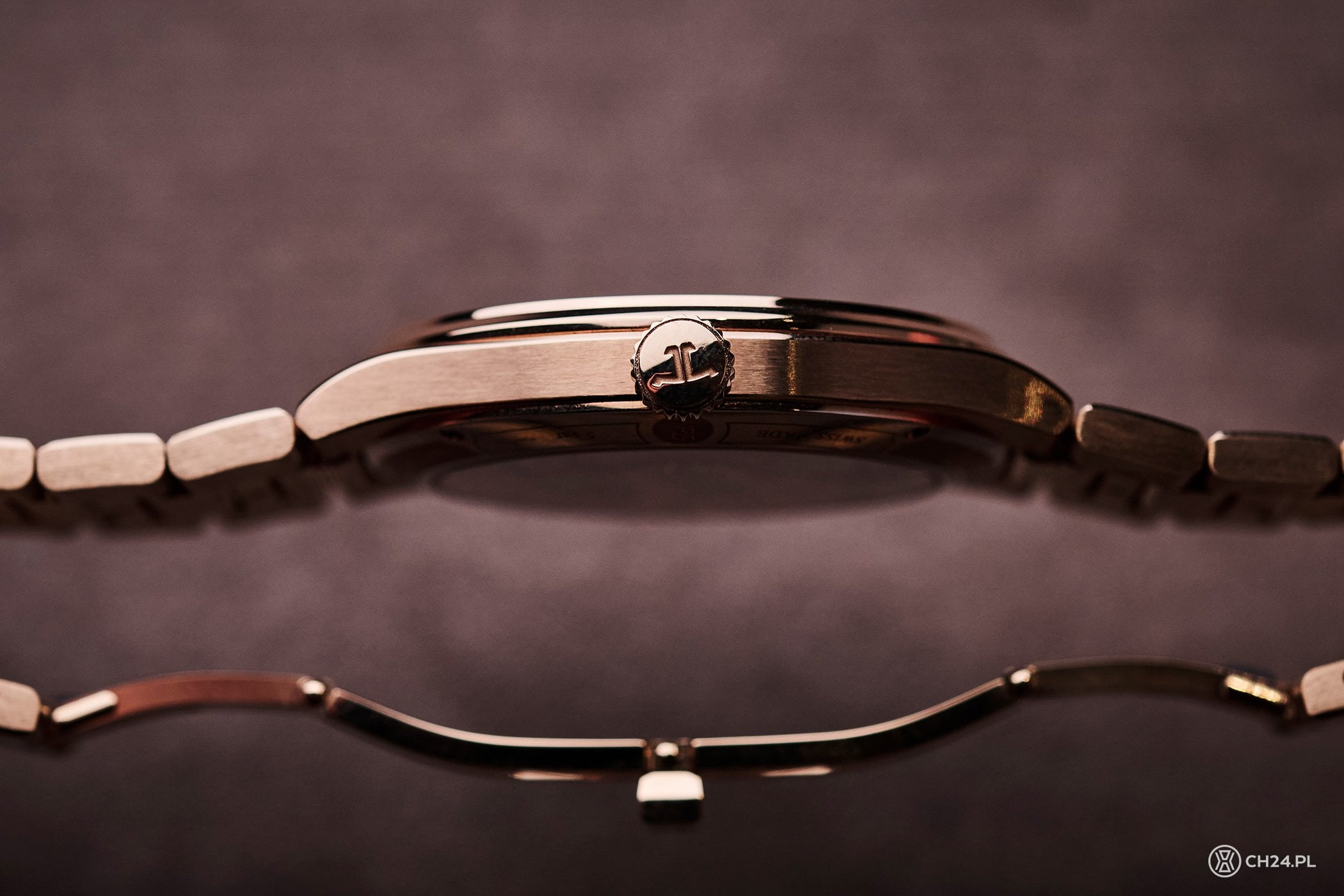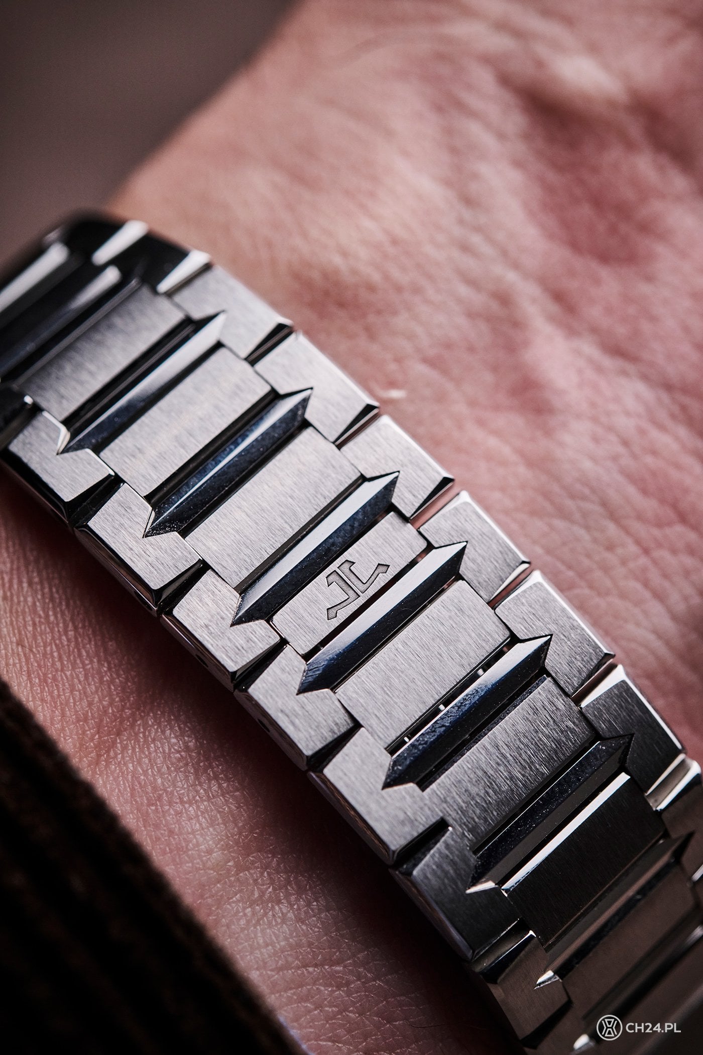 Nowy Master prezentuje na pozór klasyczną, okrągłą, smukłą kopertę ze zintegrowanymi płynnie uszami, wąskim, wypolerowanym bezelem, niedużą koronką, sygnowaną logotypem JLC oraz dwoma szafirowymi szkłami. Do obudowy płynnie dołączono bransoletę, której nietypowe ogniwa z wyciętymi miejscami, ostrymi (wizualnie) elementami czerpią inspirację z tradycyjnych wskazówek „Dauphine”. Wyróżniają je ostra końcówka i faza, biegnąca przez całą długość. JLC wykończyło bransoletę bardzo starannie, do satynowanych powierzchni dodając świetnie kontrastujące polerki wspomnianych wycięć oraz środkowych elementów ogniw. Całość zapina się na zatrzaskiwane, ładnie wkomponowane zapięcie z dyskretnie ukrytą mikroregulacją. Na nadgarstku jest bardzo wygodna, a relatywnie wąskie ogniwa doskonale ze sobą współgrają, dopasowując się do ręki.