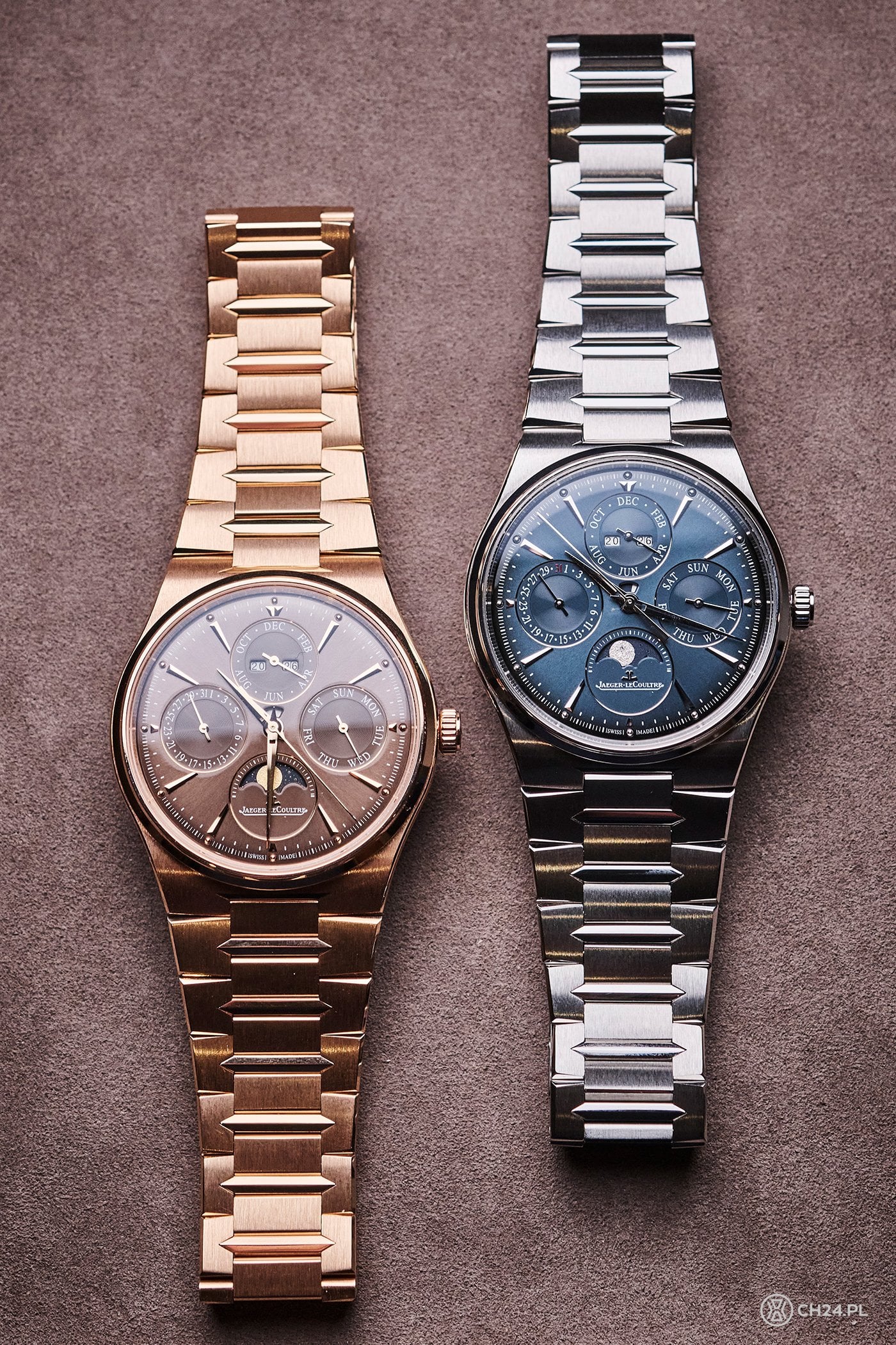 Mierzącą 39 mm średnicy i 9,2 mm grubości kopertę wybrać można w wariancie stalowym albo z 18 ct różowego złota. Tak jak w przypadku modelu Date, tak i tutaj tarcza jest niebiesko-szara w stali i brązowa w złocie. Cztery ułożone symetrycznie na cyferblacie małe tarczki odpowiadają odpowiednio za wskazanie miesiąca i roku, dnia tygodnia, fazy Księżyca i wreszcie daty. Każdą z nich (poza fazami Księżyca) otacza polerowana ramka, a zdobi szlif ślimakowy, połączony z matowym ringiem.