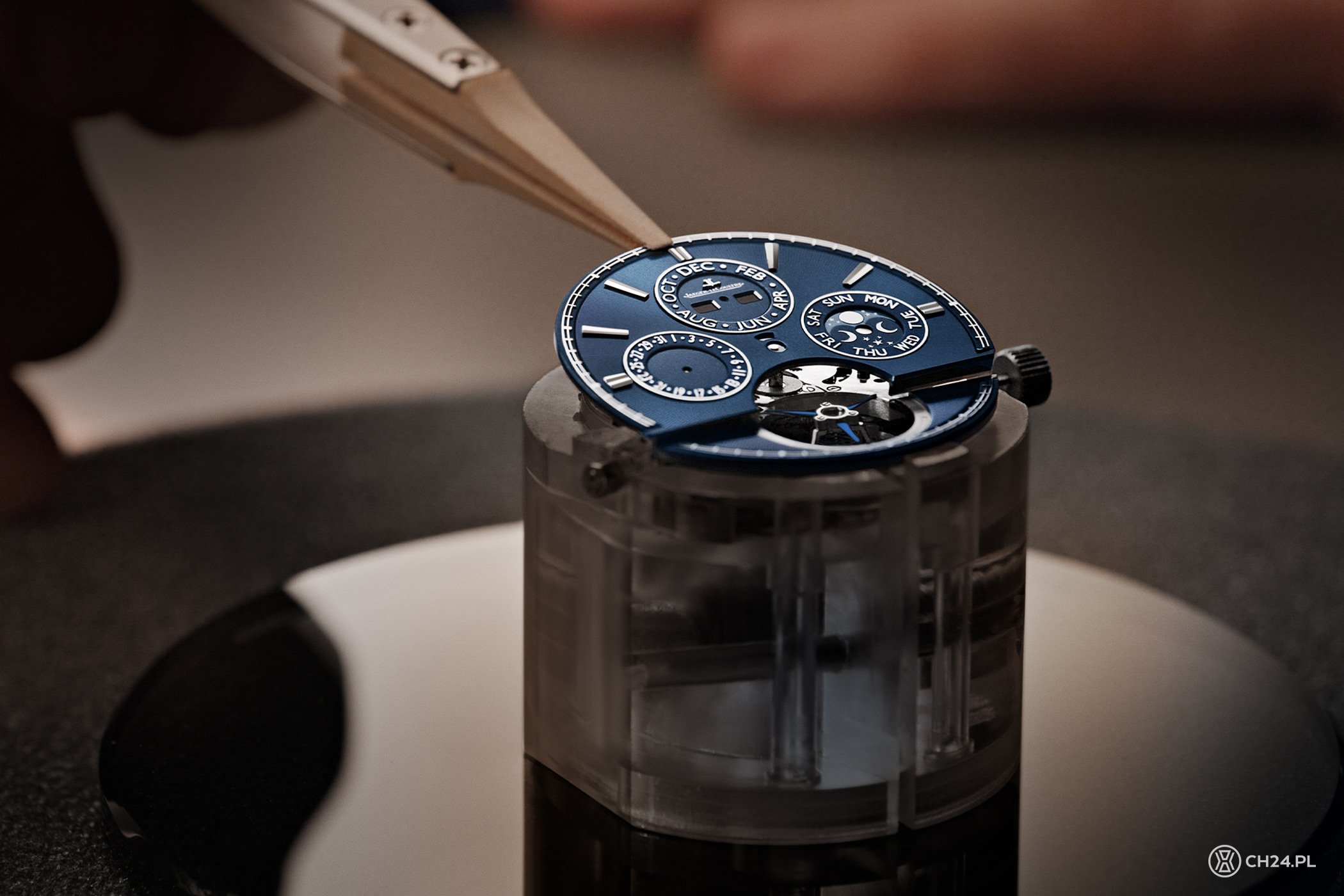 Jaeger-LeCoultre to jedna z tych marek, w których na przestrzeni lat udało się zaprojektować i wdrożyć niesamowitą ilość przeróżnych kalibrów. Mówimy tu o liczbie ponad 1400 mechanizmów, wśród których swoje miejsce zajmuje m.in. miniaturowy kaliber 101, słynny Memovox (z mechanicznym alarmem), ale także cała grupa niezwykle skomplikowanych werków – takich jak bohater tego tekstu, czyli stworzony w 2013 roku kaliber 985. Mechanizm składa się z 431 części, z czego 83 tytanowe komponenty – ważące łącznie zaledwie 0,386 grama – przypadają na tourbillon. Poza wirującym wychwytem, wyposażono go we wskazania wiecznego kalendarza i faz Księżyca (te ostatnie będą wymagały ingerencji zegarmistrza dopiero za 122 lata).