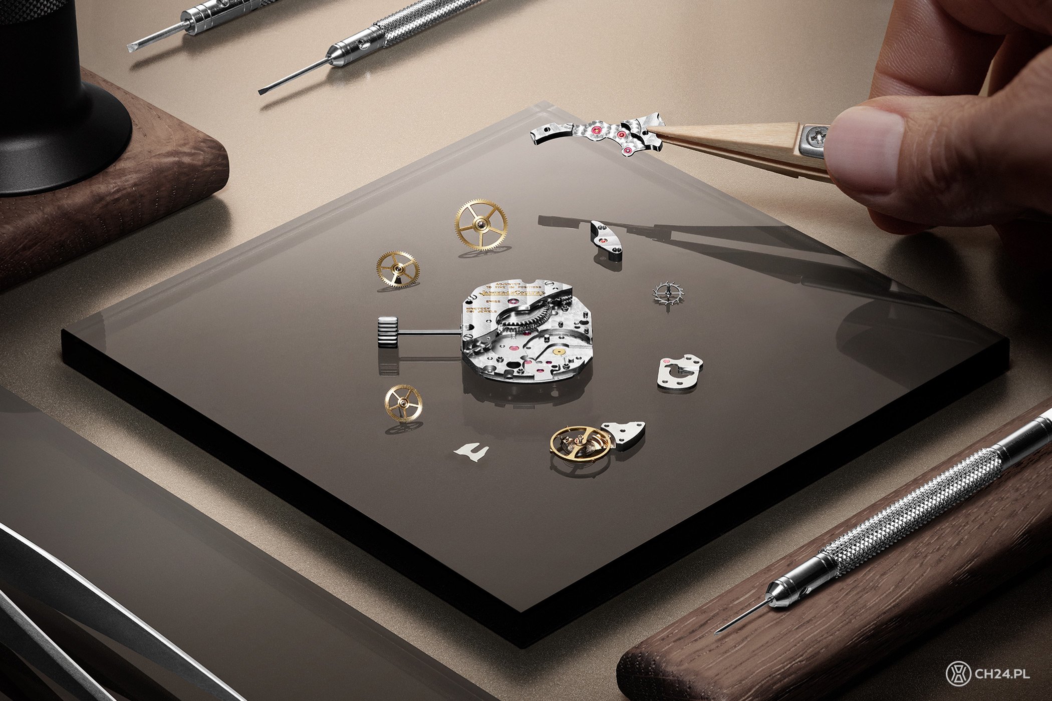Wewnątrz stalowej koperty zamknięto ręcznie nakręcany, manufakturowy kaliber 822, który po pełnym nakręceniu może pracować przez około 42 godziny. Co warte podkreślenia, werk jest dopasowany kształtem do prostokątnej koperty – więc poniekąd przygotowany z myślą o Reverso.
