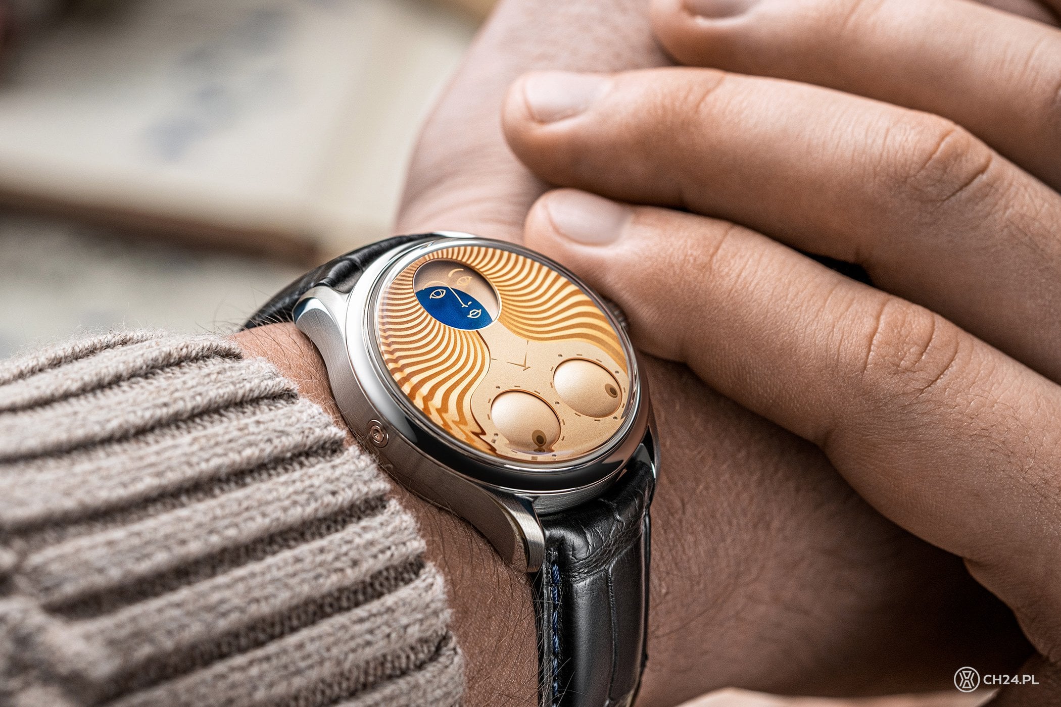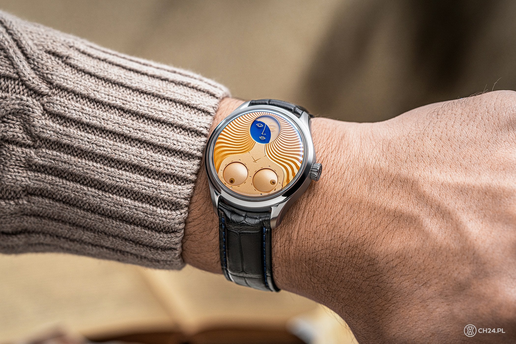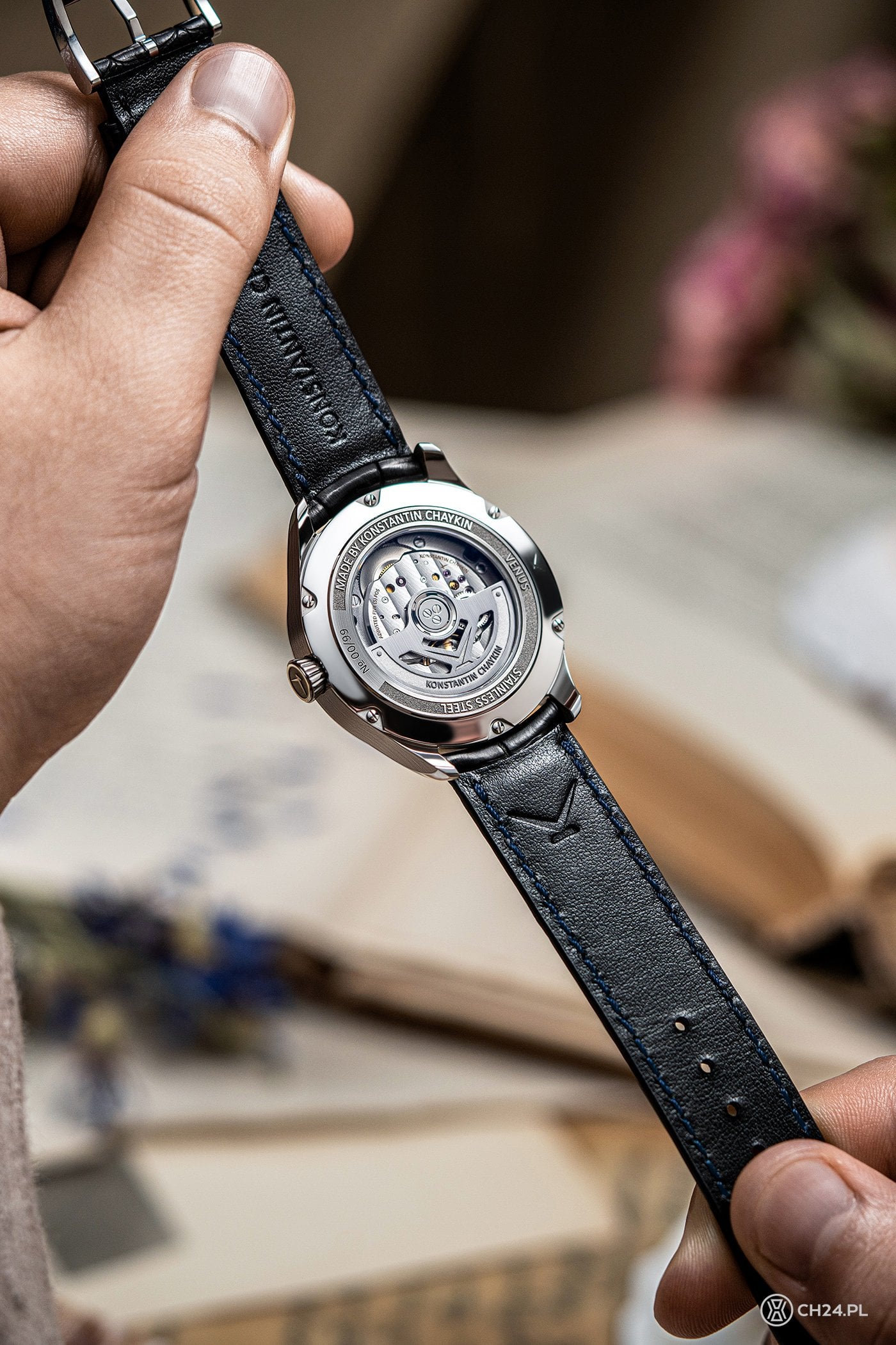 Ale po kolei: zegarek pochodzi z limitowanej serii 99 sztuk i powstał we współpracy z firmą GMT Milano, która jest oficjalnym dystrybutorem marki Konstantin Chaykin we Włoszech. Elegancka, stalowa koperta modelu Venus ma średnicę 40 mm (wysokość 12,9 mm) i różni się od kopert innych zegarków z serii Wristmons. Przede wszystkim ma bardziej opływowy kształt, krótkie uszy oraz węższy, gładki pierścień i wypukłe, szafirowe szkło. Poza tym, do obsługi wskazań i nakręcania zegarka, służy tu tylko jedna koronka (większość modeli z linii Wristmon ma dwie koronki).