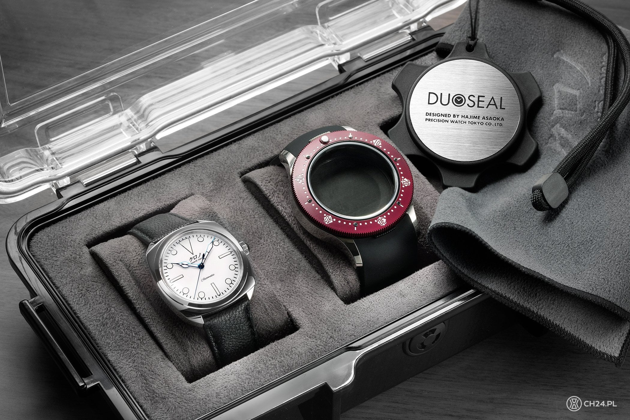 Dodatkowa koperta (wodoszczelność do 100 m) ma oryginalny, ząbkowany pierścień z czerwoną, aluminiową wkładką, na której widać podziałkę minutową (odstępy 10-minutowe są zaznaczone arabskimi cyframi). Do „zamknięcia” lub „otwarcia” zewnętrznej koperty służy specjalny przyrząd dołączany do tego oryginalnego zestawu. Każda obudowa ma oddzielny pasek: skórzany dla zegarka codziennego i gumowy dla „nurkowego” (system szybkiej wymiany pozwala zdjąć skórzany pasek przed włożeniem zegarka do drugiej koperty).