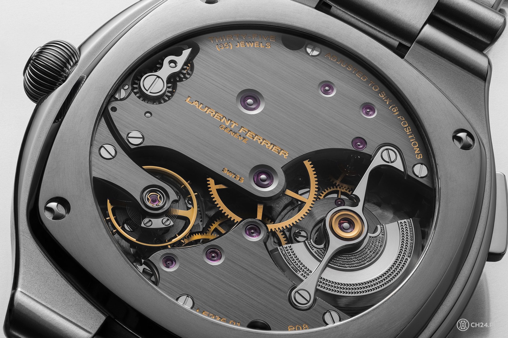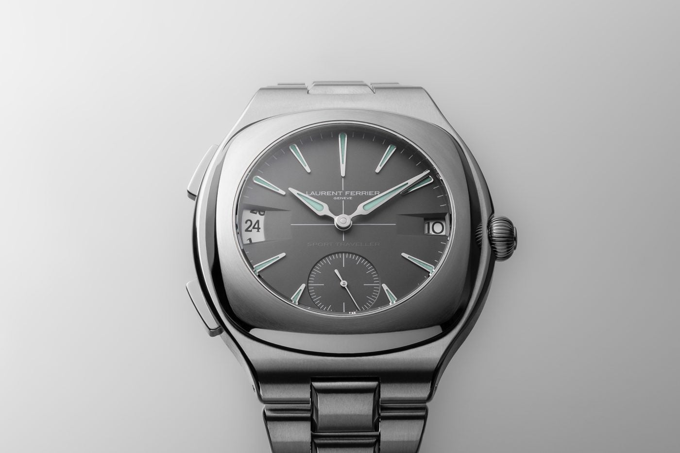 Do specyficznego, wpadającego w szarość odcienia tytanu Laurent Ferrier dopasował szary, opalizujący cyferblat. Dwa wspomniane już okienka wskazań – czasu drugiej strefy oraz daty – zaopatrzono w białe dyski z ciemnoszarymi cyframi. Na wysokości godz. 6 umiejscowiono tarczkę małej sekundy z ozdobnym szlifem ślimakowym. Czas lokalny odmierza para wskazówek „Assegai” – wypolerowanych i wypełnionych niebieskawą luminową. Ta sama luma trafiła również do nałożonych, obłych indeksów godzinowych. Zaraz nad małą sekundą dyskretnie, szarą farbą, naniesiono nazwę modelu. Tarczę symetrycznie dzieli namalowany na biało krzyż, lekki ukłon w storę chronometrów vintage z epoki.