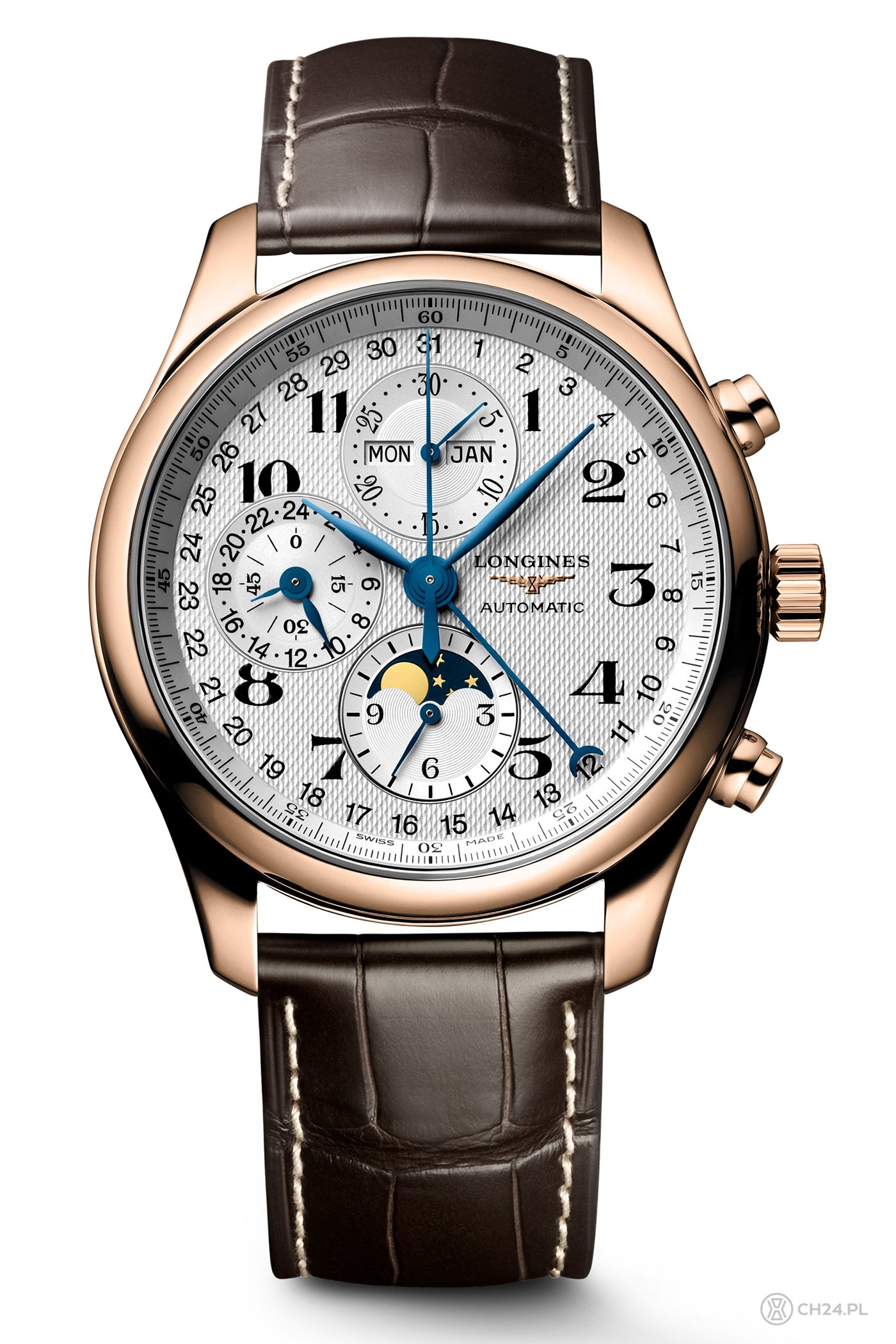 Teraz, na zakończenie 2025 r. – 20 lat po premierze serii Master – Longines pokazał luksusową wersję najbardziej skomplikowanego zegarka z tej kolekcji. Do tej pory Master Collection Chronograph Moonphase był dostępny tylko w stalowej kopercie. W nowym wariancie, obudowa (średnica 42 mm, wysokość 14,40 mm), koronka oraz przyciski służące do obsługi stopera są zrobione z 18-karatowego, różowego złota i dla wzmocnienia efektu – wykończone polerowaniem.