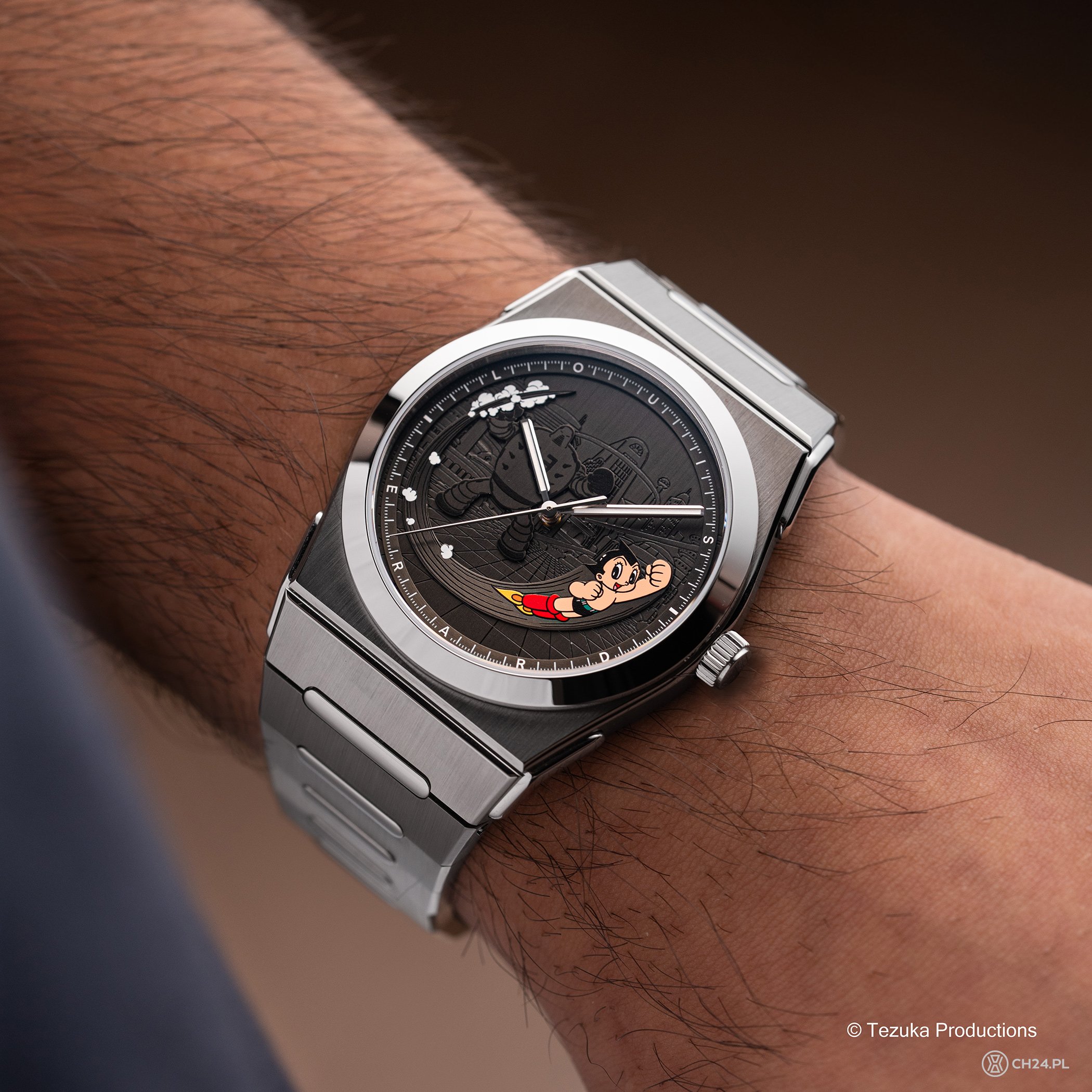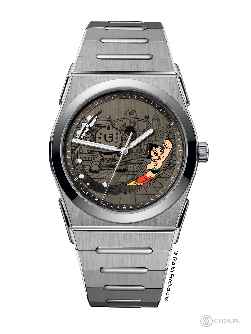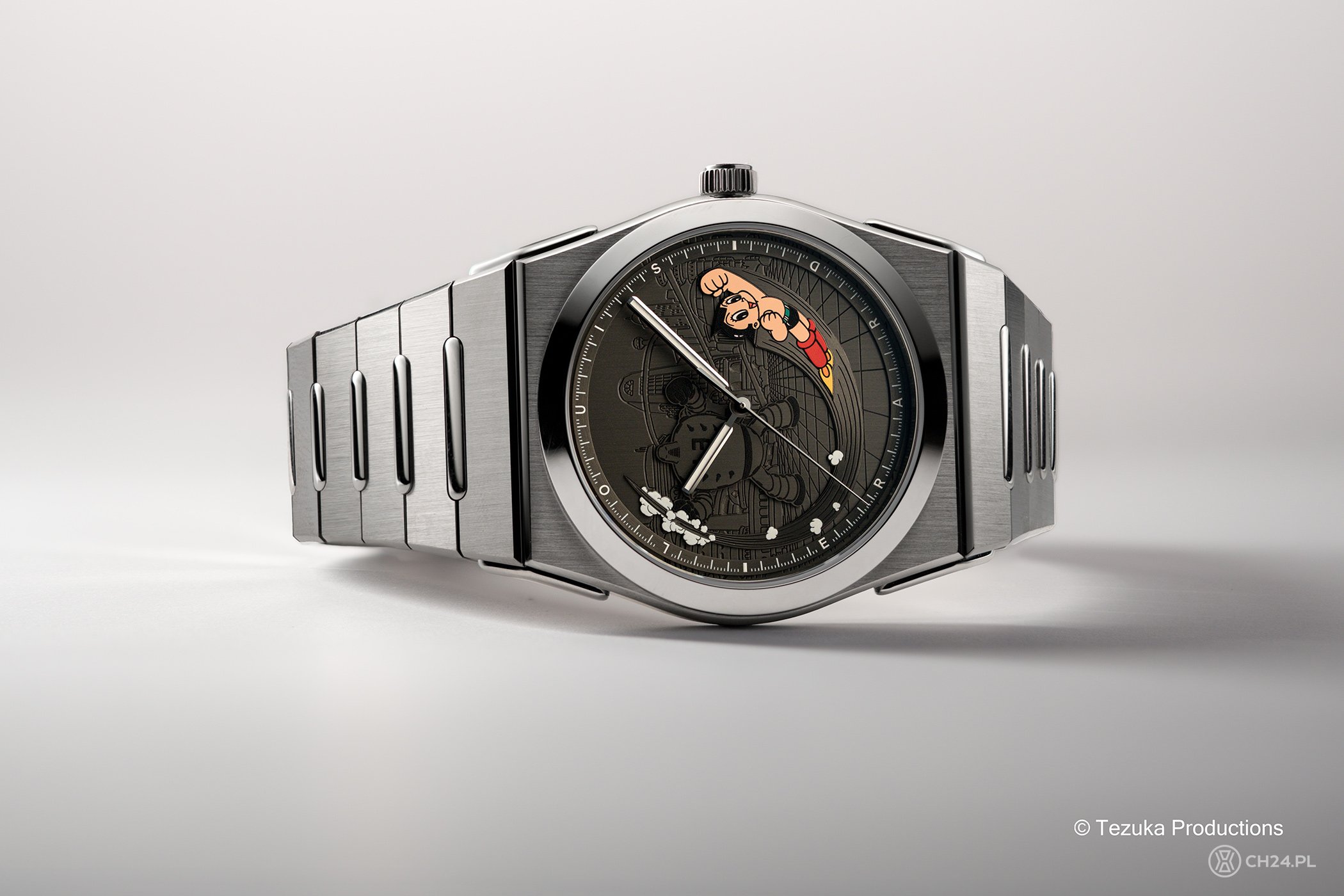 Zegarek powstał w ścisłej (licencjonowanej) współpracy ze studiem Tezuka Productions, które jest właścicielem prawd do wizerunku Astro Boya. Jego wizerunek wkomponowano w tło przedstawiające wytłoczone w cyferblacie Metro City oraz sylwetkę jednego ze złych robotów – przeciwników Astro Boya. Poszczególne elementy tarczy skomponowano w przestrzenną całość i otoczono uniesionym nieco ringiem minutowym. Monochromatyczny projekt przełamany jest kolorową sylwetką głównego bohatera, uwiecznioną w pełnym locie.