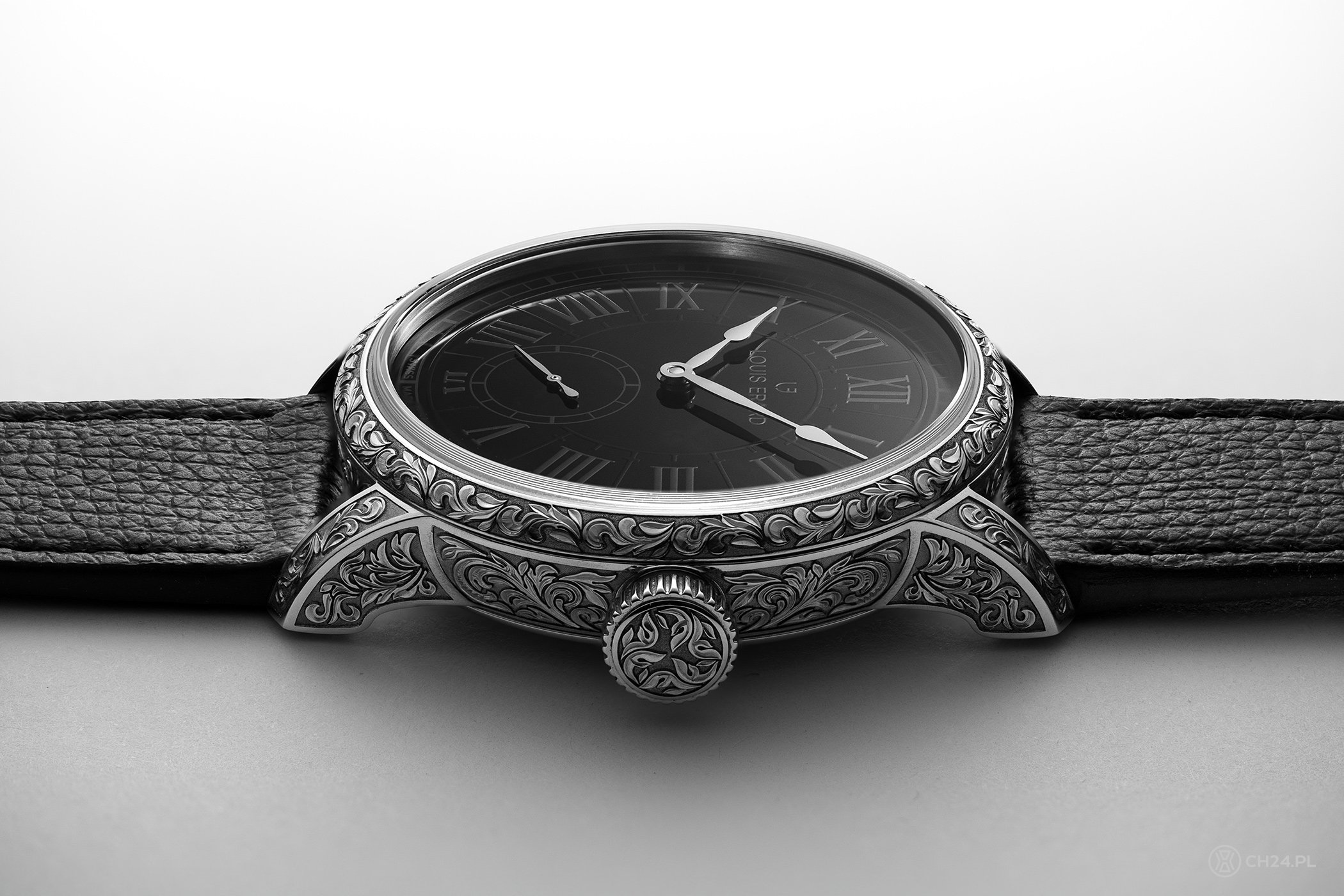 Teraz dołącza do nich kolejny, czyli Gravée Main – czasomierz stworzony wspólnie z ukraińskim zegarmistrzem i grawerem Maksymem Shavlakiem, znanym z przekształcania historycznych zegarków w nowoczesne dzieła. To on stoi za wyjątkową dekoracją stalowej koperty, koronki oraz zapięcia skórzanego paska.
