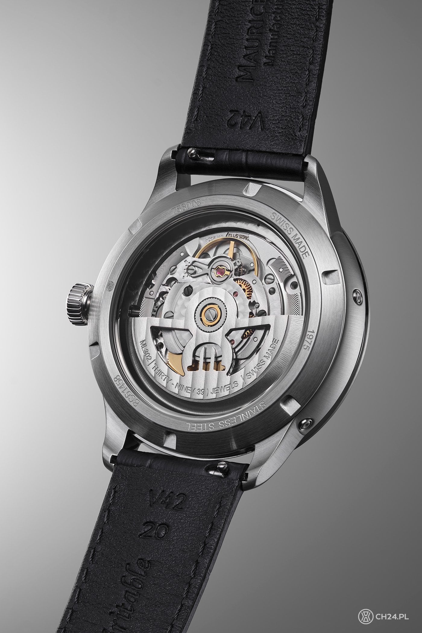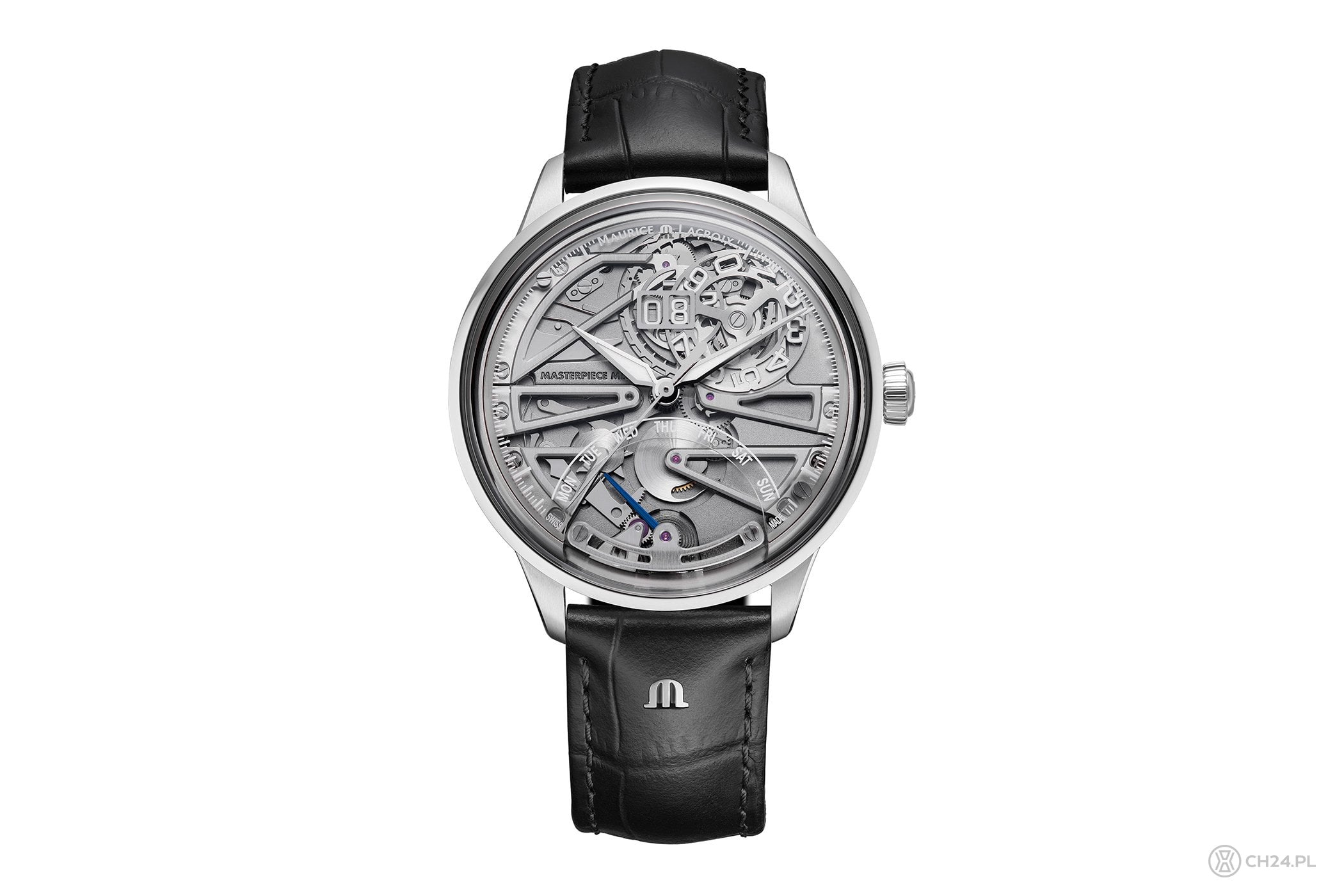 Równie ciekawy jest widok od strony przezroczystego dekla, pod którym pracuje ładnie ozdobiony kaliber ML302 z automatycznym naciągiem i 38-godzinną rezerwą chodu. Kaliber ML302 zawiera stworzony przez firmę Maurice Lacroix, autorski moduł obsługujący dwie funkcje dodatkowe, tj. duży datownik i powracające wskazania dnia tygodnia (to już 26. kaliber, który powstał dla serii Masterpiece).