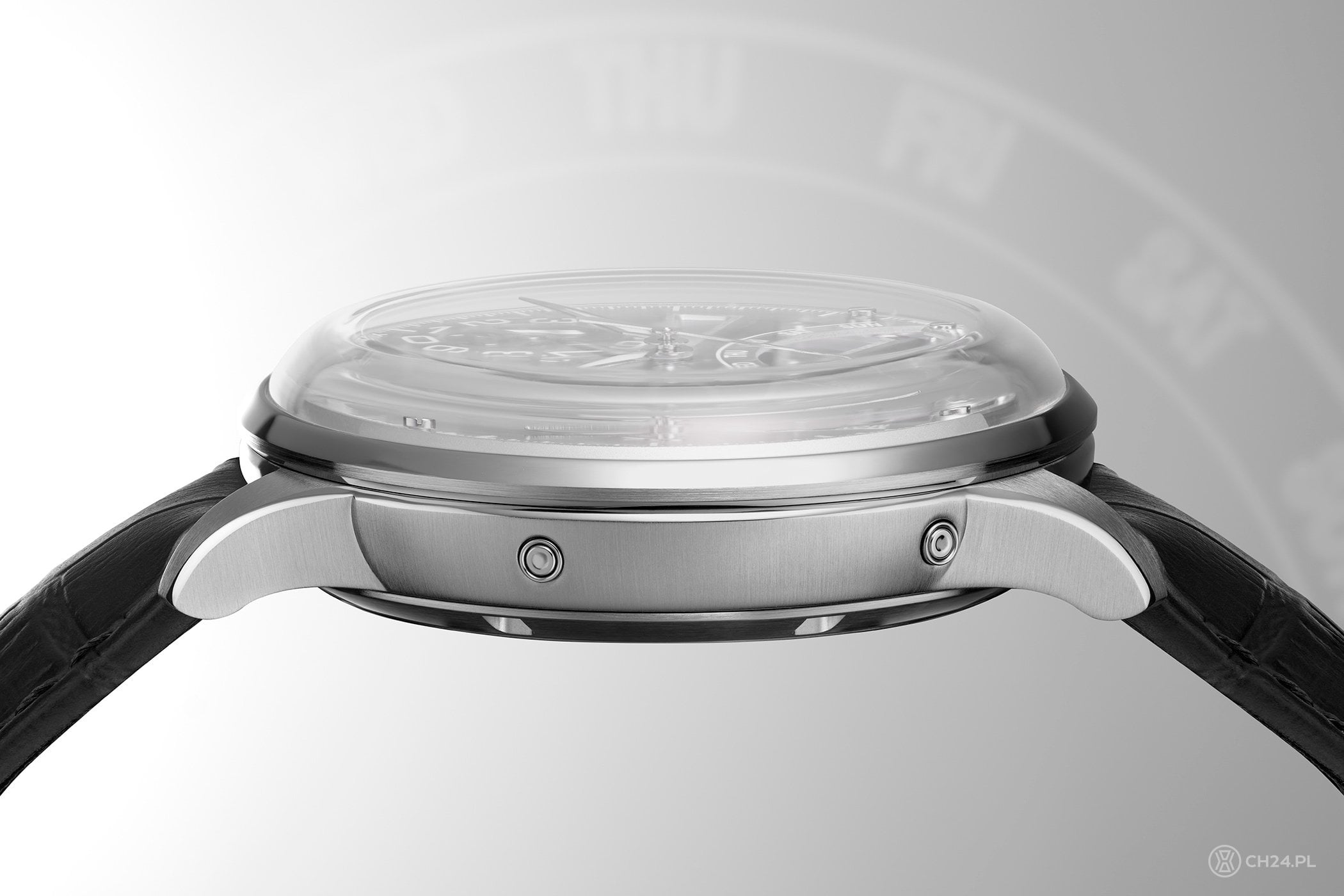 Jedynym, mocnym akcentem kolorystycznym na tej, prawie monochromatycznej tarczy, jest obsługująca powracające wskazania dnia tygodnia niebieska wskazówka. Patrząc na zegarek z boku, zauważymy, że wypukłe szkło odsłania też różne poziomy i faktury poszczególnych elementów.