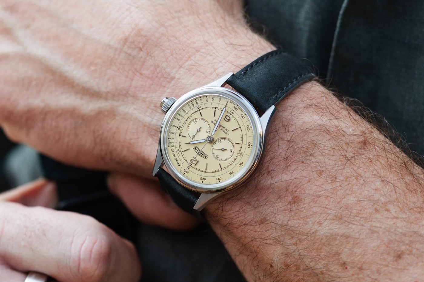 Dzisiaj, dołącza do nich projekt numer pięć, czyli Monochrome Montre de Souscription 5 Angelus Chronographe Tachymètre, stworzony na bazie modelu Chronographe Télémètre marki Angelus. Pokazany w ubiegłym roku na Watches & Wonders w Genewie, Chronographe Télémètre jest kwintesencją stylu vintage: nieduża koperta, tradycyjnie zaprojektowana tarcza i, co najważniejsze, ręcznie nakręcany mechanizm ze stoperem obsługiwanym za pomocą jednego przycisku.