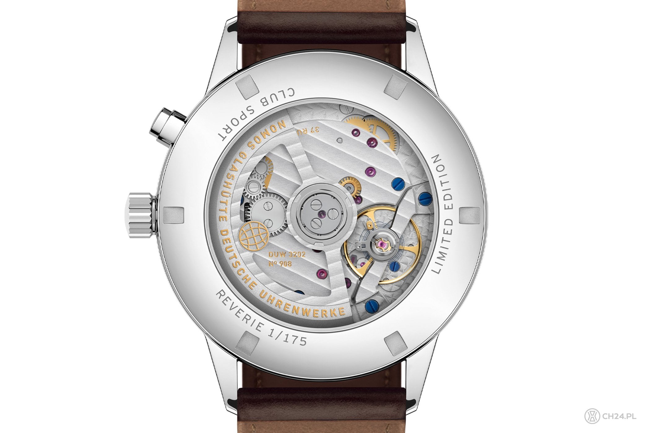 Za wszystkie wskazania odpowiada, znany z poprzednich edycji i opatentowany przez Nomosa, kaliber DUW 3202 (widoczny pod przezroczystym deklem) z automatycznym naciągiem, autorskim wychwytem i 42-godzinną rezerwą chodu.