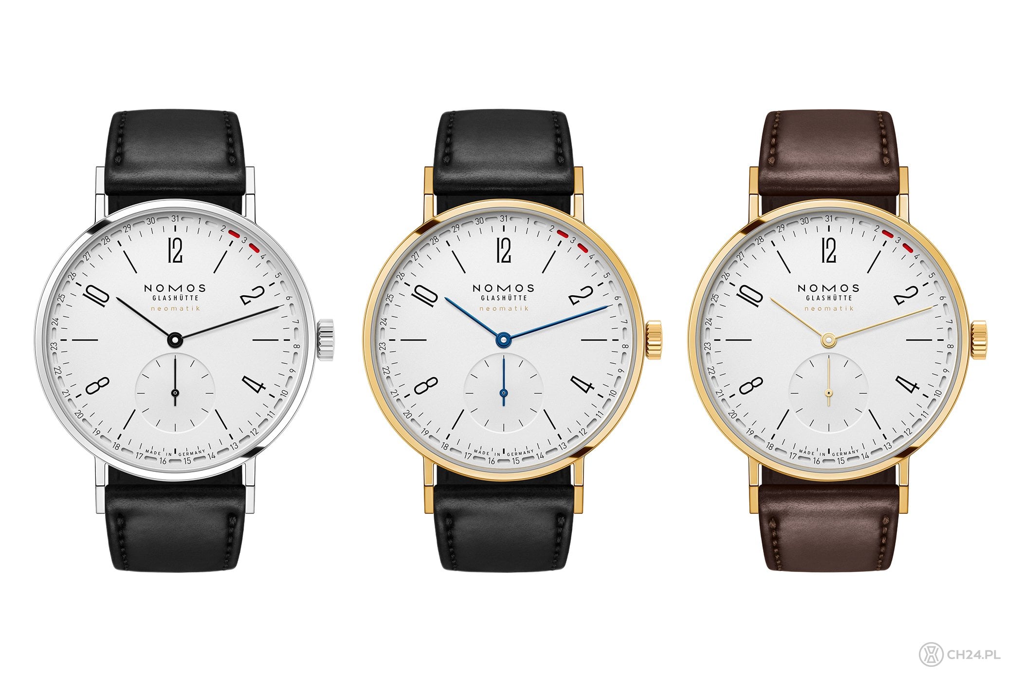 Ale wróćmy jeszcze do tarczy: każda z trzech wersji minimalnie różni się detalami. Stalowy wariant ma indeksy i wskazówki w kolorze czarnym, natomiast złote warianty różnią się między sobą jedynie kolorem wskazówek (może być złoty lub niebieski) i odcieniem skórzanego paska (brązowy lub bordowy).