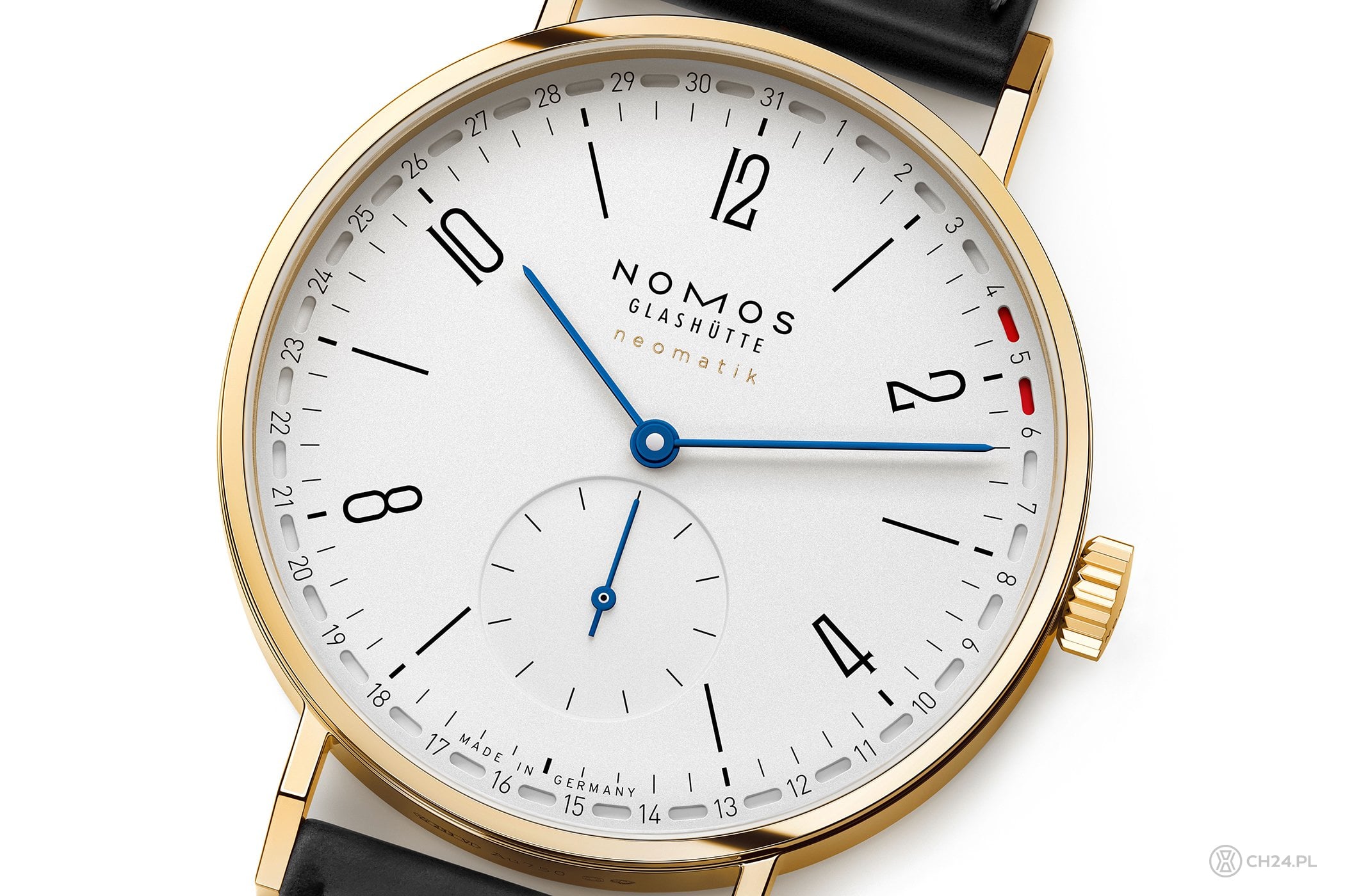 Dlaczego nietypowym? Dlatego, że jego wskazania pojawiają się w niewielkich wycięciach otaczających tarczę. Pod tymi okienkami znajduje się obrotowy pierścień i aktualna data jest w nim wskazywana za pomocą dwóch czerwonych znaczników. Na zdjęciu, po obu stronach cyfry „5” widzimy czerwone znaczniki, więc zegarek wskazuje piąty dzień miesiąca. Ten oryginalny datownik jest autorską konstrukcją Nomosa, która w 2018 r. dostała nagrodę w kategorii „Challenge” na GPHG (dokładnie chodzi o zegarek Tangente 41 Update).