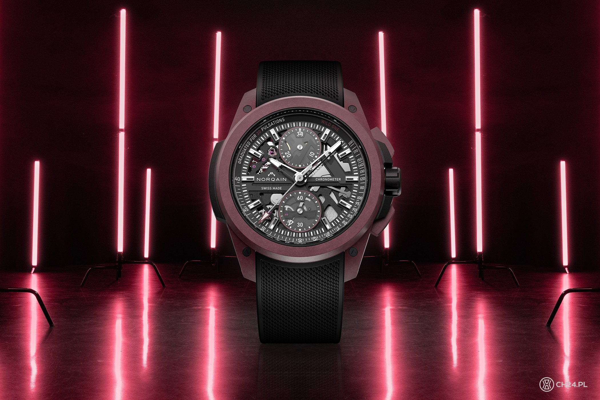 Natomiast widoczny pod przezroczystą tarczą i od strony dekla, szkieletowy kaliber 8K z automatycznym naciągiem i stoperem z powracającą wskazówką, obsługiwanym za pomocą koła kolumnowego to wspólny projekt marki Norqain oraz firmy AMT. Został stworzony na bazie mocno zmodyfikowanego kalibru SW500, ma 62-godzinną rezerwę chodu i wcześniej został wykorzystany w opisywanym przez nas Independence Skeleton Chrono. Dokładność jego chodu potwierdza certyfikat chronometru.