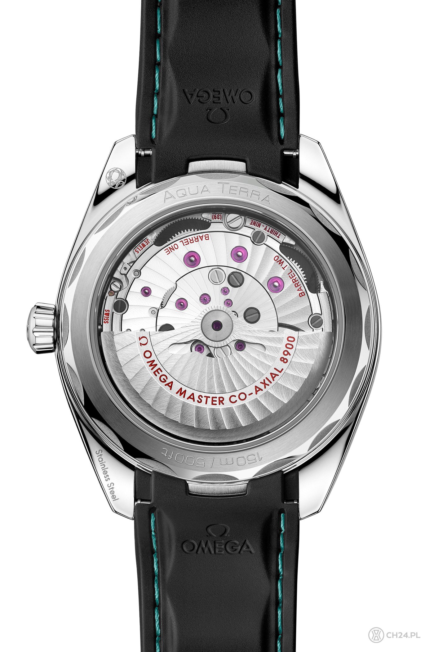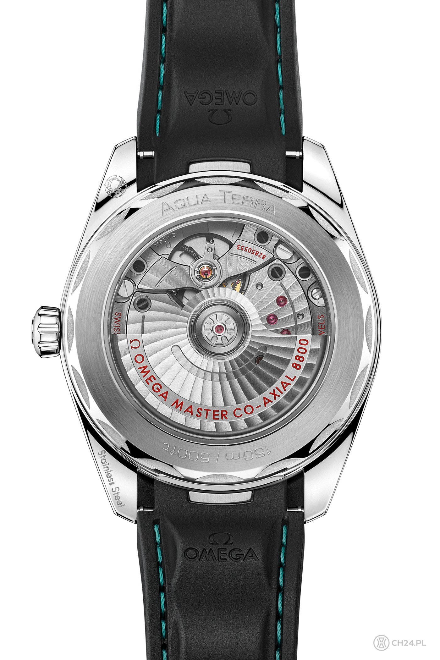 Omega Seamaster Aqua Terra z turkusową tarczą oraz ceramicznym bezelem i gumowym, zintergrowanym paskiem została wyceniona – bez względu na wersję – na 35 600 PLN.