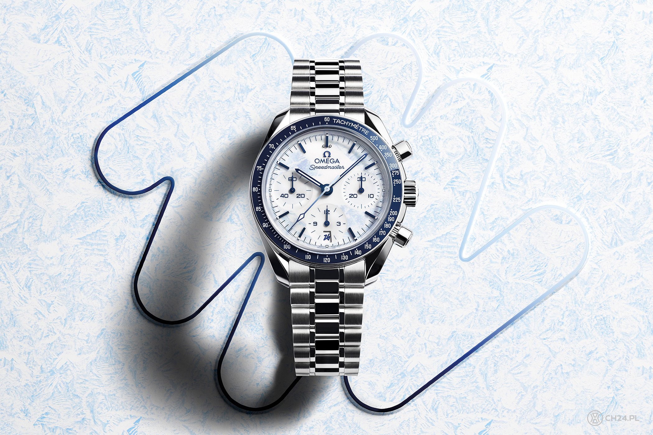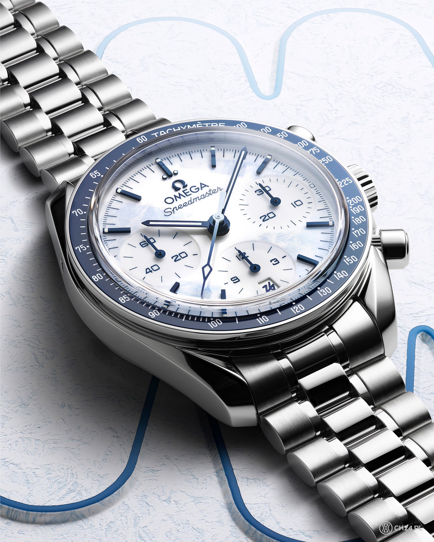 To, co najciekawsze i nawiązujące do Zimowych Igrzysk Olimpijskich Mediolan-Cortina 2026, Omega zamknęła pod frontowym, wypukłym szafirowym szkłem. Chodzi o białą, lakierowaną tarczę, na którą naniesiono jasnoniebieski, matowy wzór. Przypomina on zmrożoną powierzchnię i otacza biały fragment cyferblatu, układający się w cyfrę 2 z loga wydarzenia. Tymczasem trzy okrągłe tarczki zegarka zostały także polakierowane i wykończone specjalną techniką azurage, która ma w zamyśle przywodzić na myśl idealnie przygotowany stok narciarski.