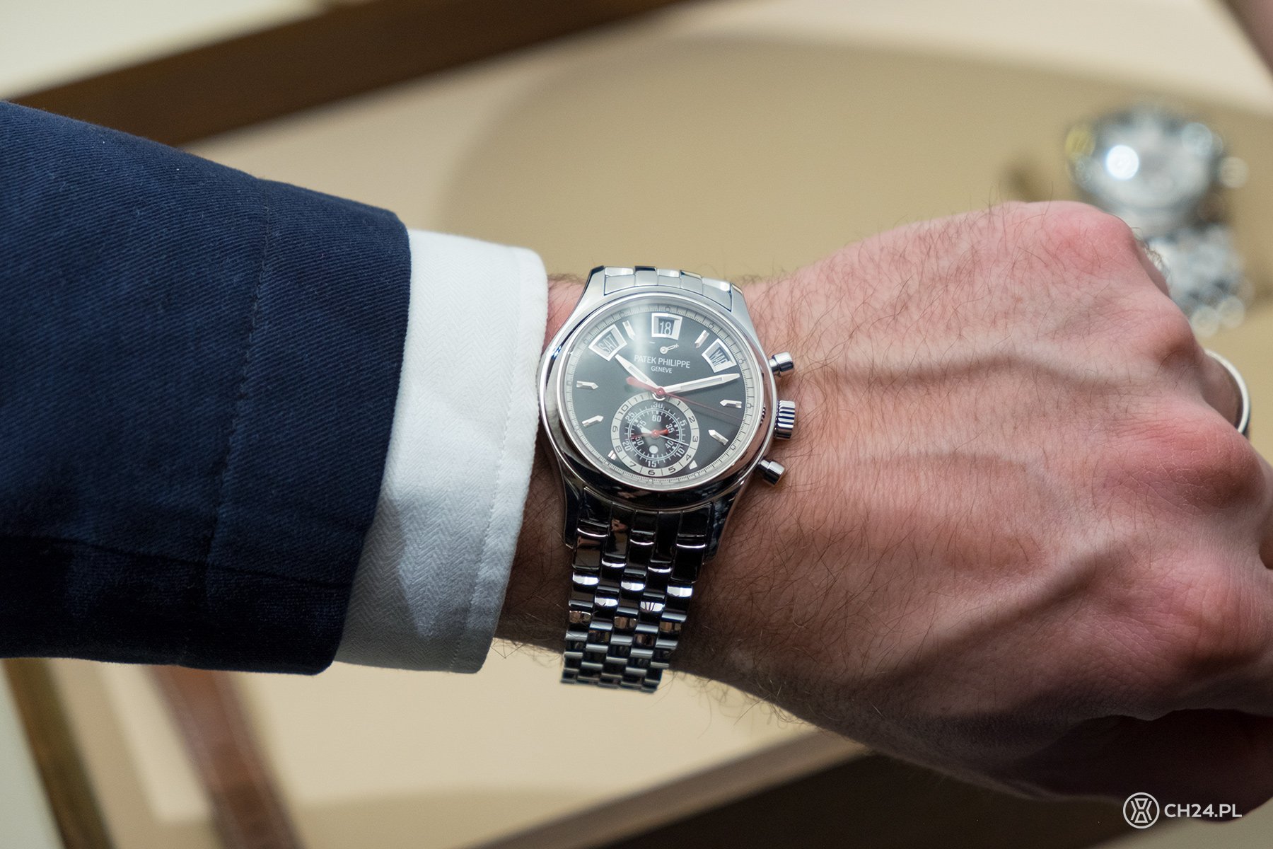 Ref. 5960 od zawsze (data premiery to 2004 rok) należał do moich ulubionych Patków. Choć to zdecydowanie nie jest (i nigdy nie była) najpopularniejsza pozycja w ofercie marki, połączenie stopera z kalendarzem w takiej estetyce wygląda idealnie. Jeden z poprzednich modeli, w różowym złocie ze srebrną tarczą, nosił mój dobry znajomy. Wyglądał rewelacyjnie.