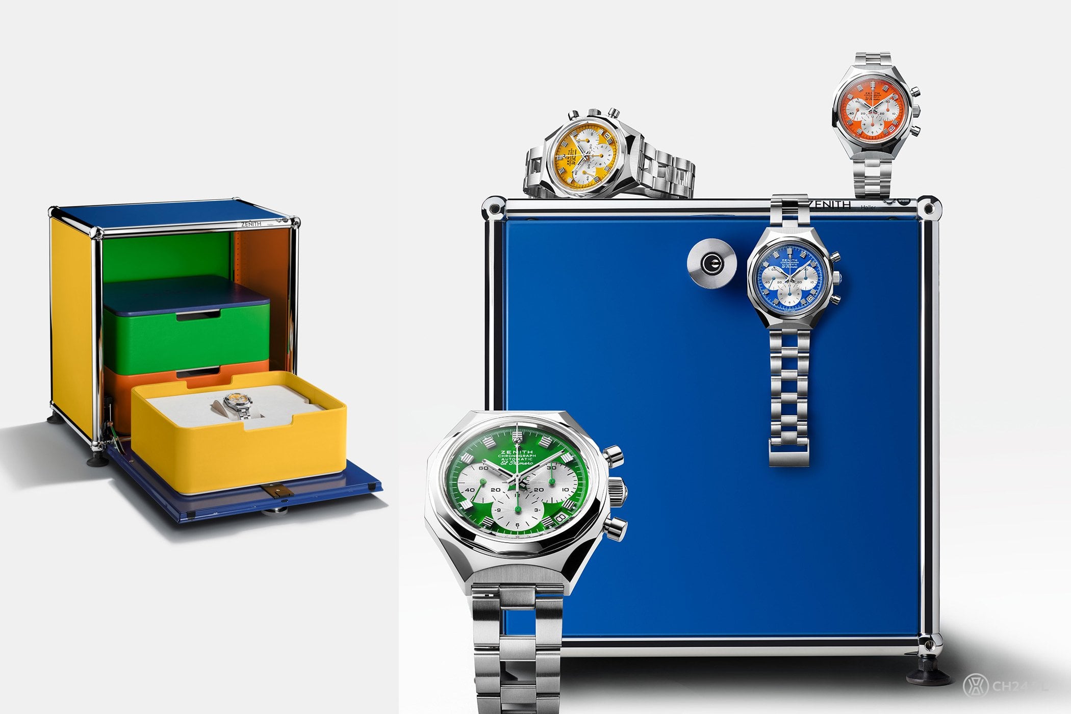 Wśród prezentowanych modeli były również 4 zegarki Defy Chronograph USM, różniące się kolorami tarcz (do wyboru: niebieska, zielona, żółta i czerwona). Powstały we współpracy z firmą USM Modular Furniture – kultowym szwajcarskim producentem stylowych, modułowych mebli, znanych z intensywnych barw i możliwości łatwej rozbudowy o kolejne segmenty.