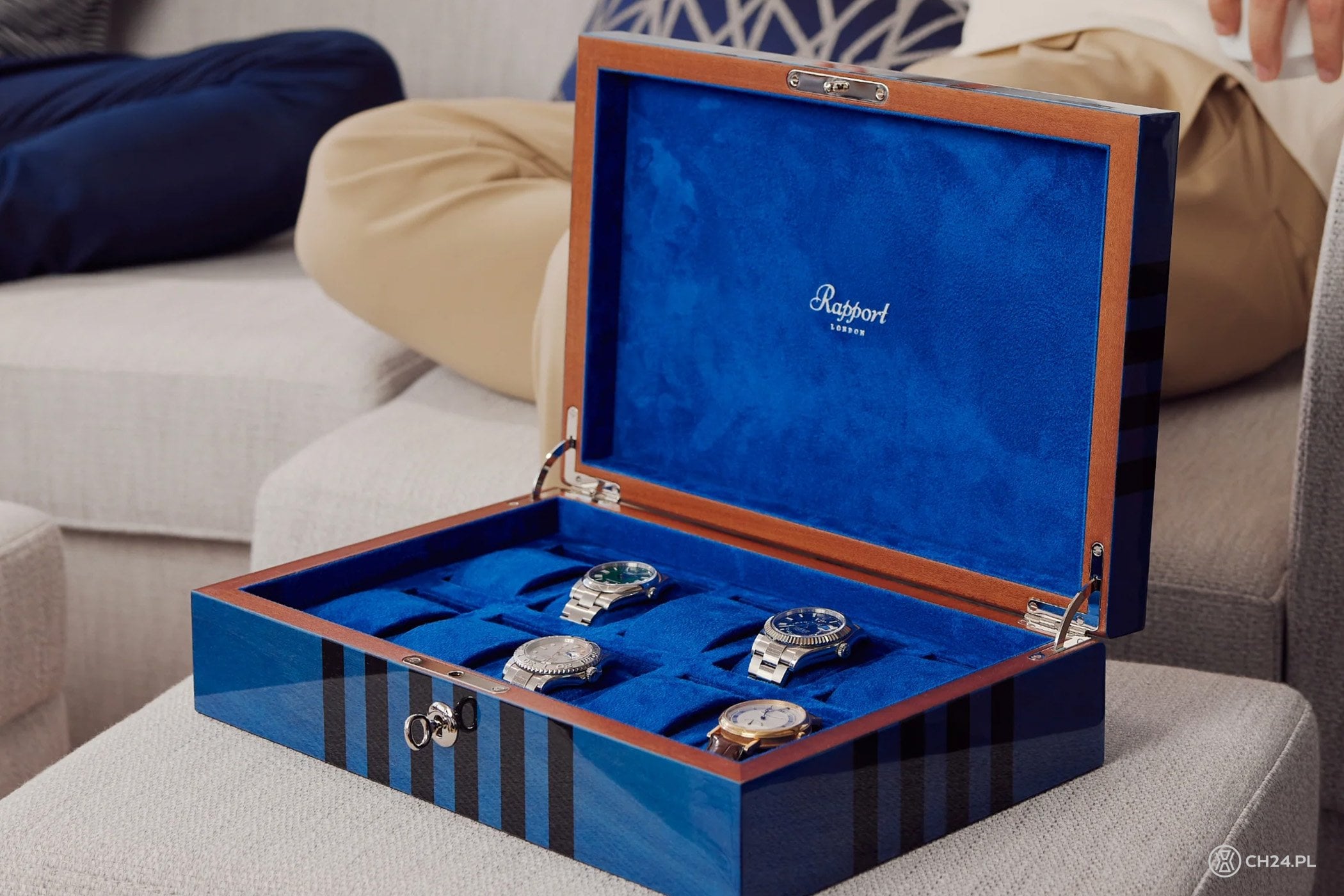 Wykonane z luksusowego, ręcznie lakierowanego drewna pudełko na 10 zegarków będzie doskonałym miejscem przechowywania naprawdę wyjątkowej kolekcji. Wyściełanie zamszem i z regulowanymi poduszeczkami, dostępne jest w trzech kolorach – niebieskim, czerwonym i beżowym – i z bezpiecznym zamykaniem na kluczyk.