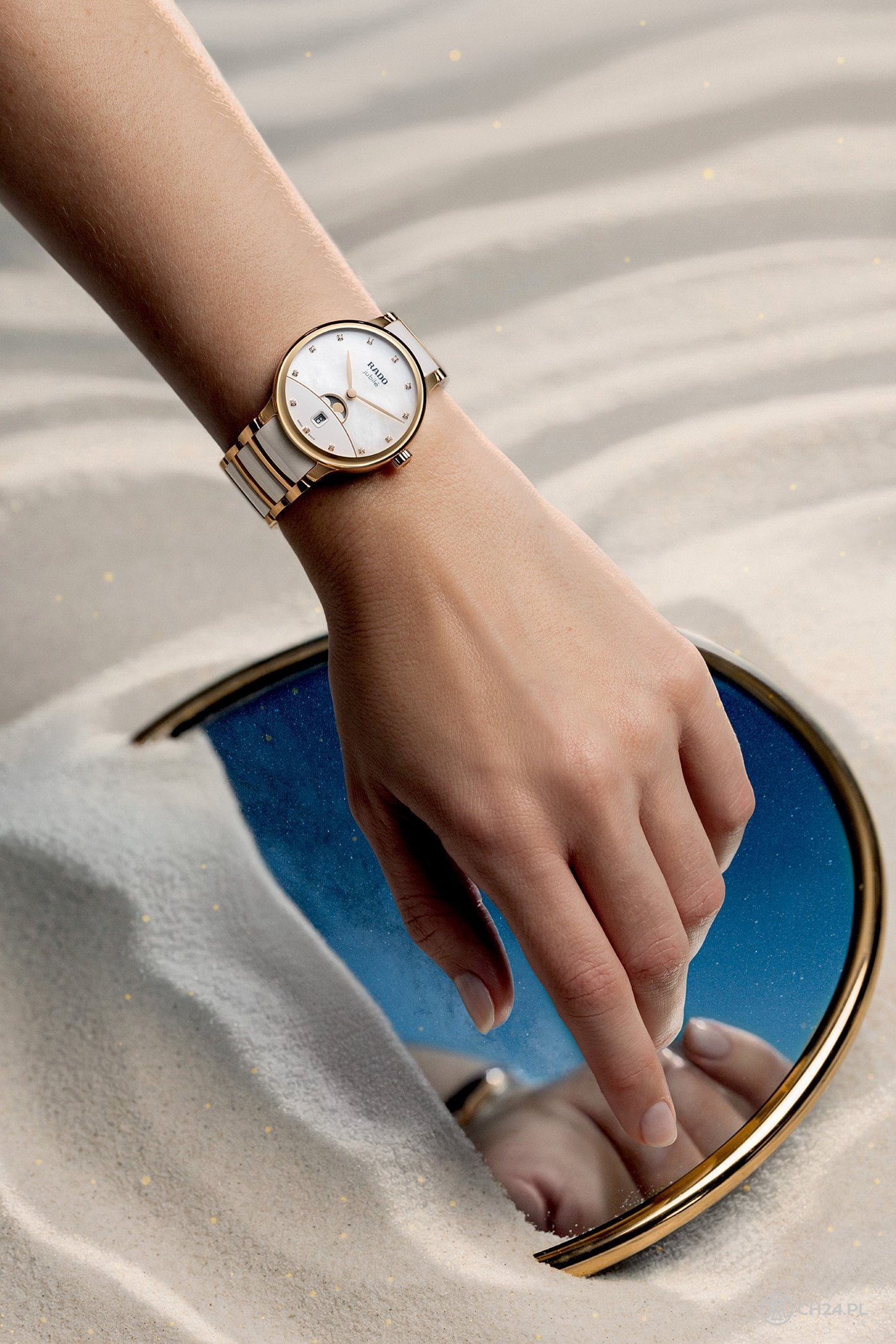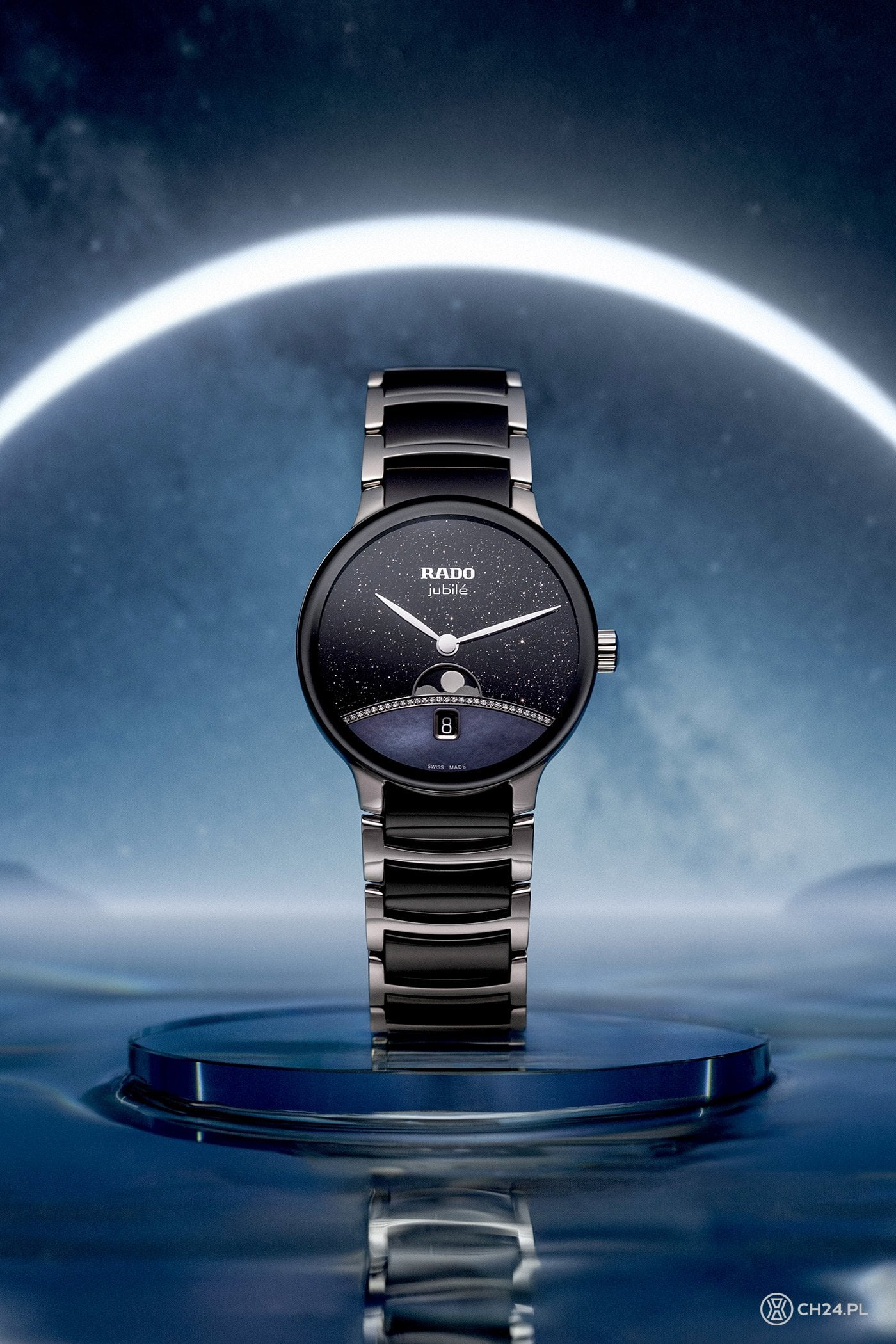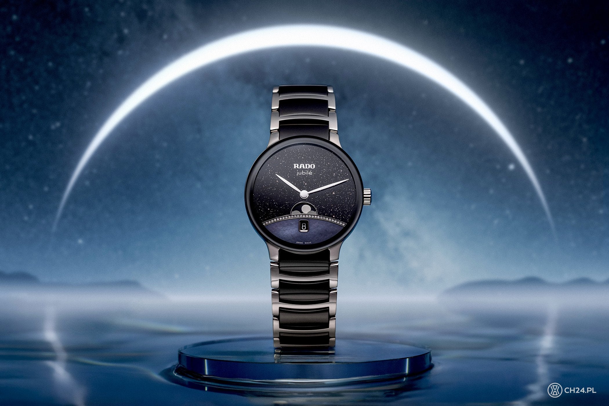Takie podejście widać też w modelu Centrix Moonphase, w którym marka Rado pokazała coś, czego do tej pory nie było w tej serii, czyli wersję ze wskazaniami faz Księżyca. Inspiracją dla pochodzącego z limitowanej serii (1001 sztuk) wariantu z czarną tarczą była „Księga tysiąca i jednej nocy”, dlatego cyferblat jest zrobiony z czarnego awenturynu. Dzięki inkluzjom, na jej powierzchni powstaje szklisty połysk, który swoim wyglądem przypomina rozgwieżdżone niebo.
