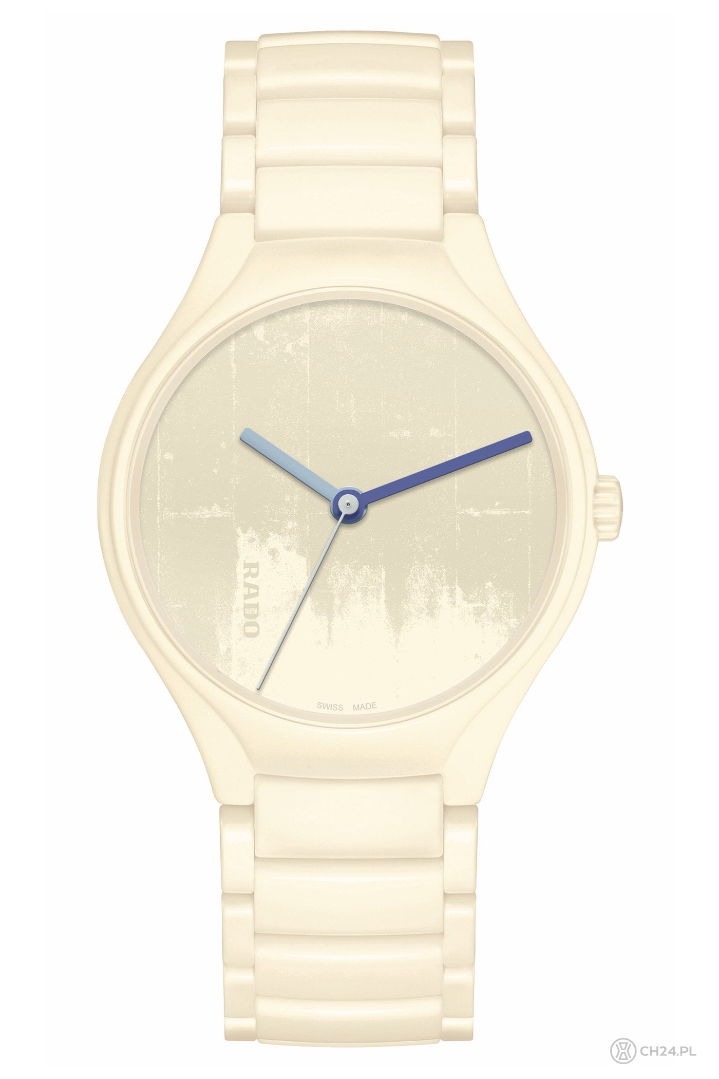 Kremowobiały odcień ceramiki (po raz pierwszy w Rado) wiernie odtwarza kolor surowego betonu. Aby uzyskać dodatkową głębię, ceramiczna tarcza została ozdobiona wzorem przypominającym nieregularną fakturę betonu (taki efekt powstał dzięki laserowemu grawerowaniu). Z tym jasnym tłem, kontrast tworzą trzy wskazówki w trzech odcieniach niebieskiego: wskazówka godzinowa w kolorze Lucent Sky Blue 32021, minutowa w odcieniu Luminous Ultramarine Blue 32020 i delikatna wskazówka sekundowa w kolorze Light Ultramarine Blue 32023.